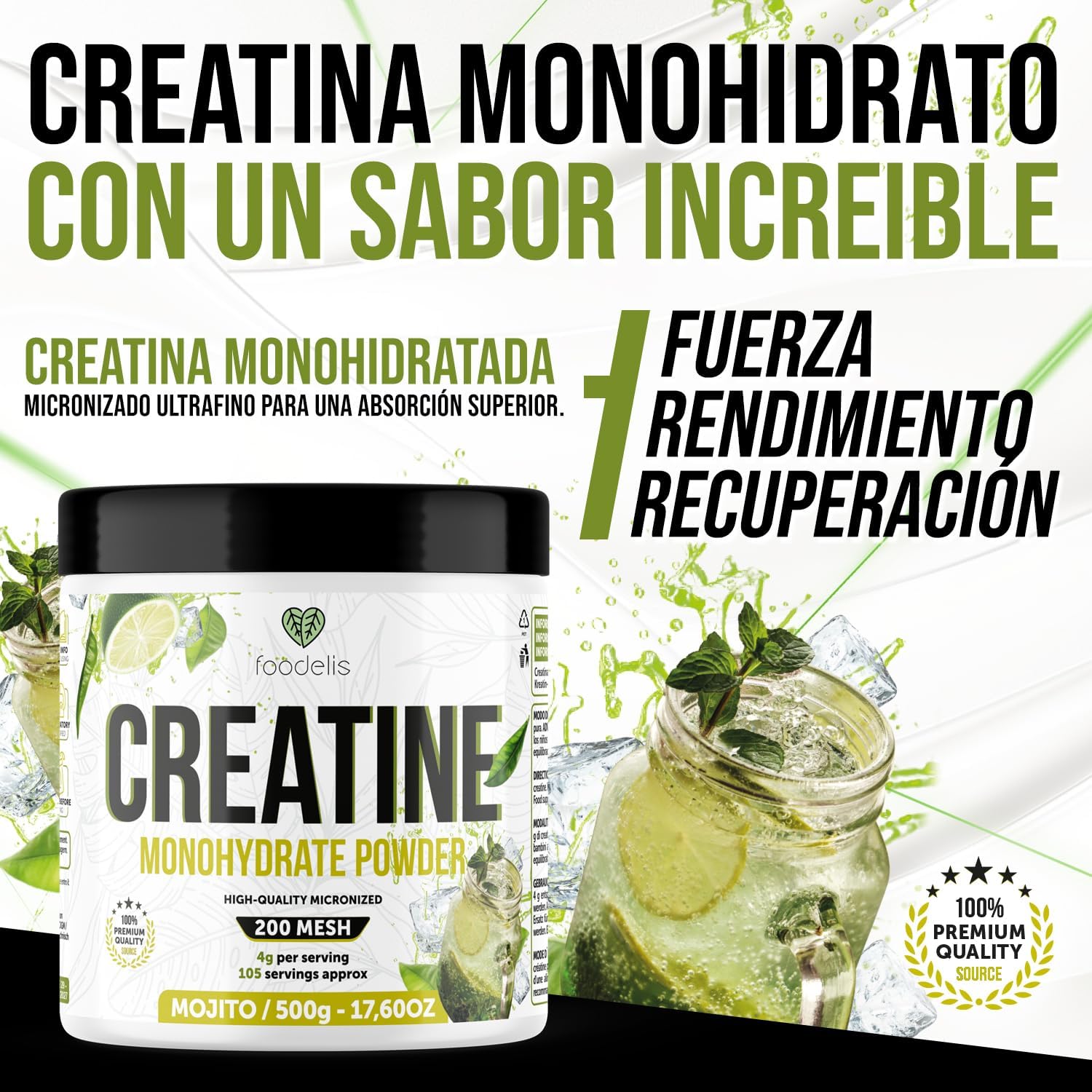 Foodelis Creatine Monohydrate Powder 500g – Mojito Flavor – High Purity – Physical Performance and Recovery – Premium Raw Material – Vegan, Fast Absorption.