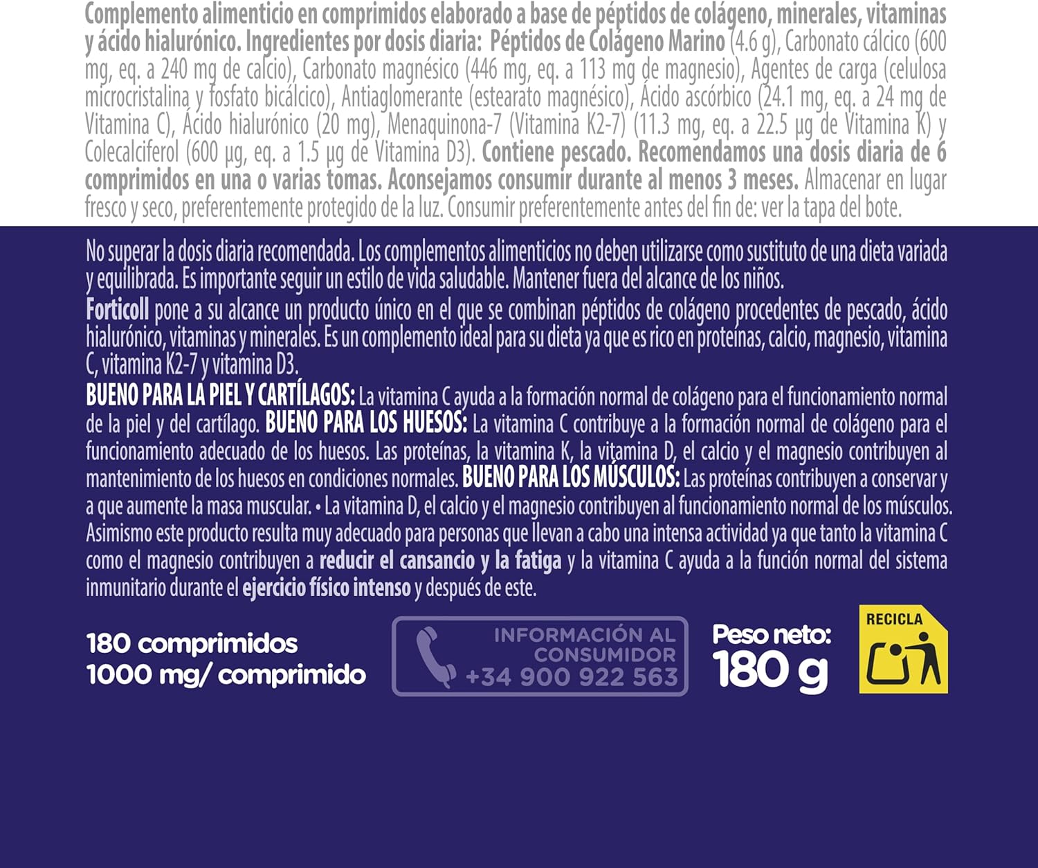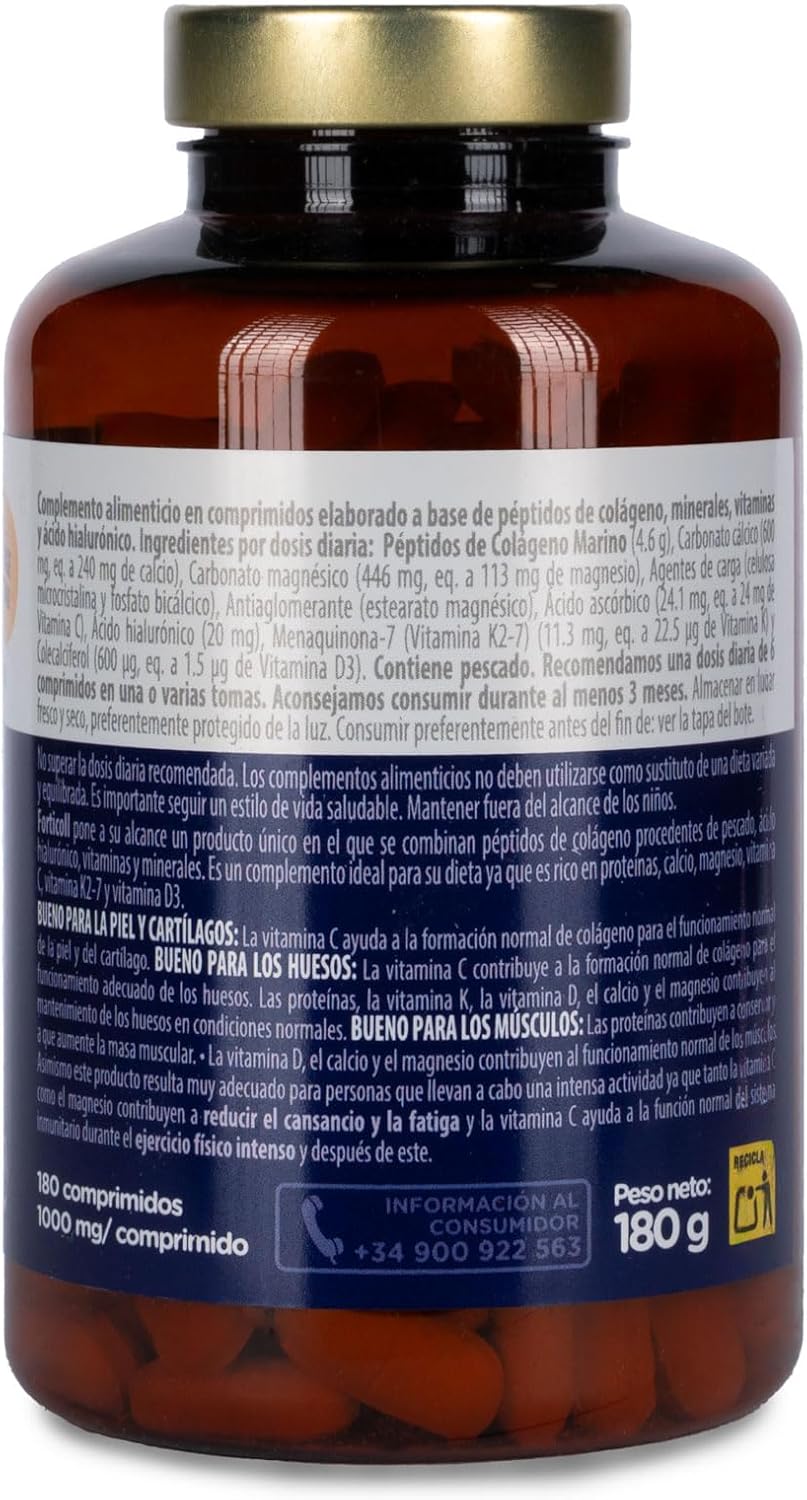 Marine collagen 180 tablets comes from fish. A recent study has shown that marine collagen is assimilated more easily than other collagen sources, such as porcine. Collagen has a high percentage of glycine, proline and hydroxyproline (major amino acids of collagen) and essential amino acids. How to use: Do not exceed the recommended daily dose. Food supplements should not be used as a substitute for a varied and balanced diet. It is important to follow a healthy lifestyle. Keep out of reach of children. Nutritional values: Energy value (1,212 kJ / 285 kcal), Fats (0 g), Saturated (0 g), Carbohydrates (0 g), Sugars (0 g), Proteins (71 g), Salt (1 g), Vitamin D (71.1 g), ug), Vitamin K (375.0 ug), Vitamin C (400.0 mg), Calcium (4,000.0 mg), Magnesium (1,875 mg). It comes preserved in a bottle of 180 tablets.