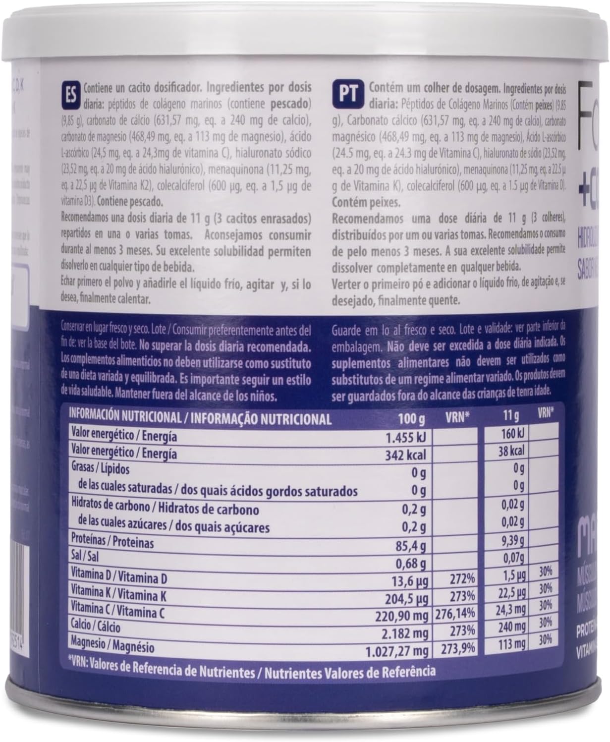 How to use: We recommend a daily dose of 11 g (3 scoops flush) in one or more feedings. We advise consuming for at least 3 months. Its excellent solubility and totally neutral taste allow it to be dissolved in any type of beverage. Put the powder first and add the cold liquid, stir and, if desired, finally heat.