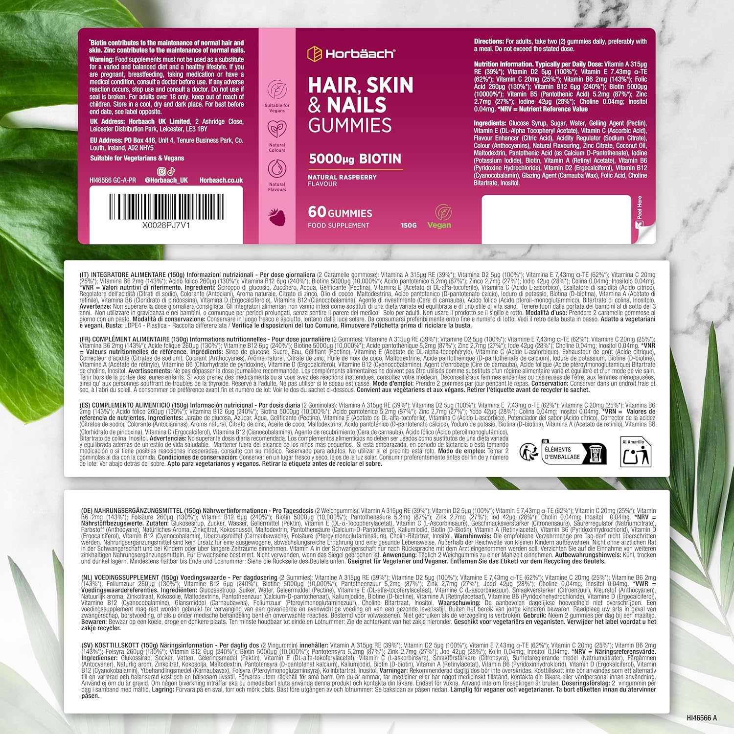 SUITABLE FOR: Horbaach Hair, Skin & Nails gummies are vegan and vegetarian, and contain no artificial colors or preservatives. The perfect formula for both women and men.