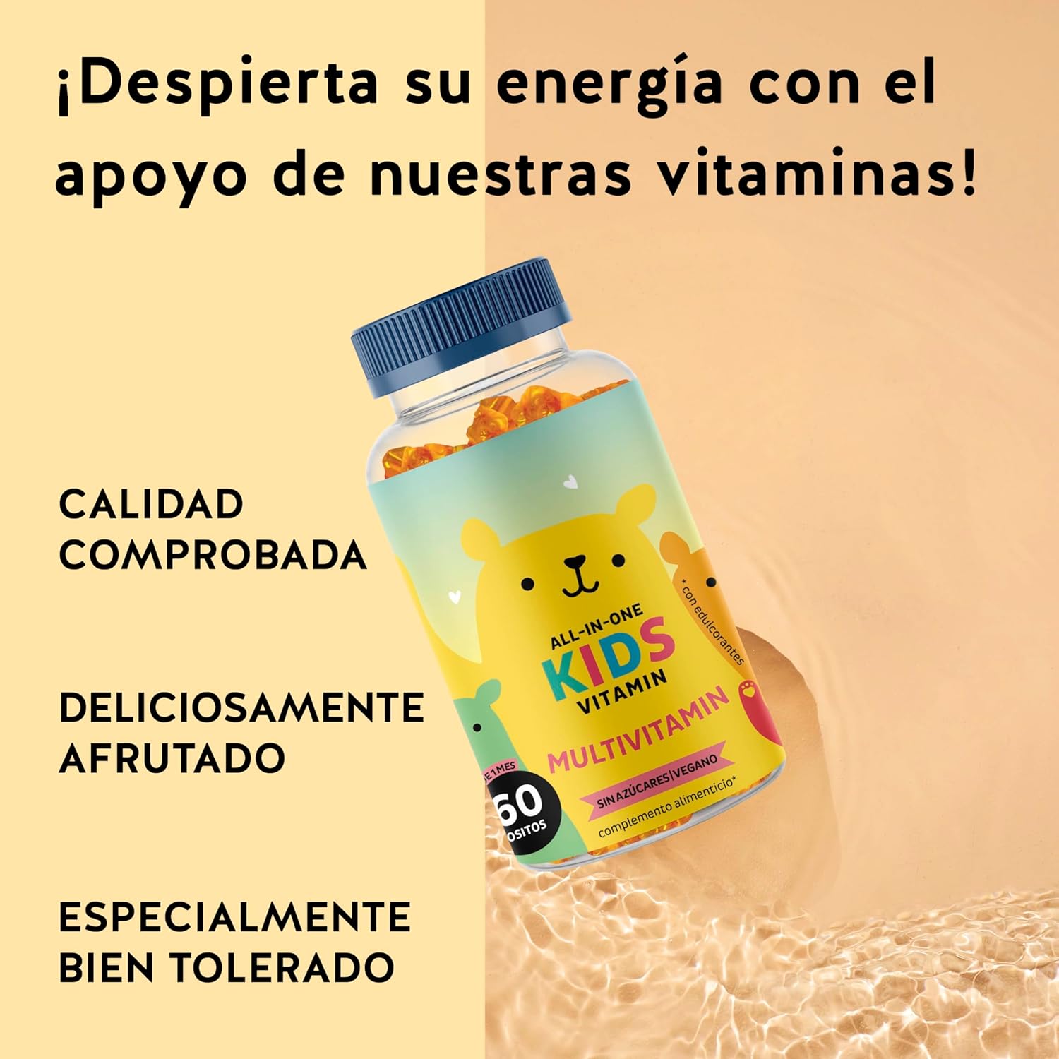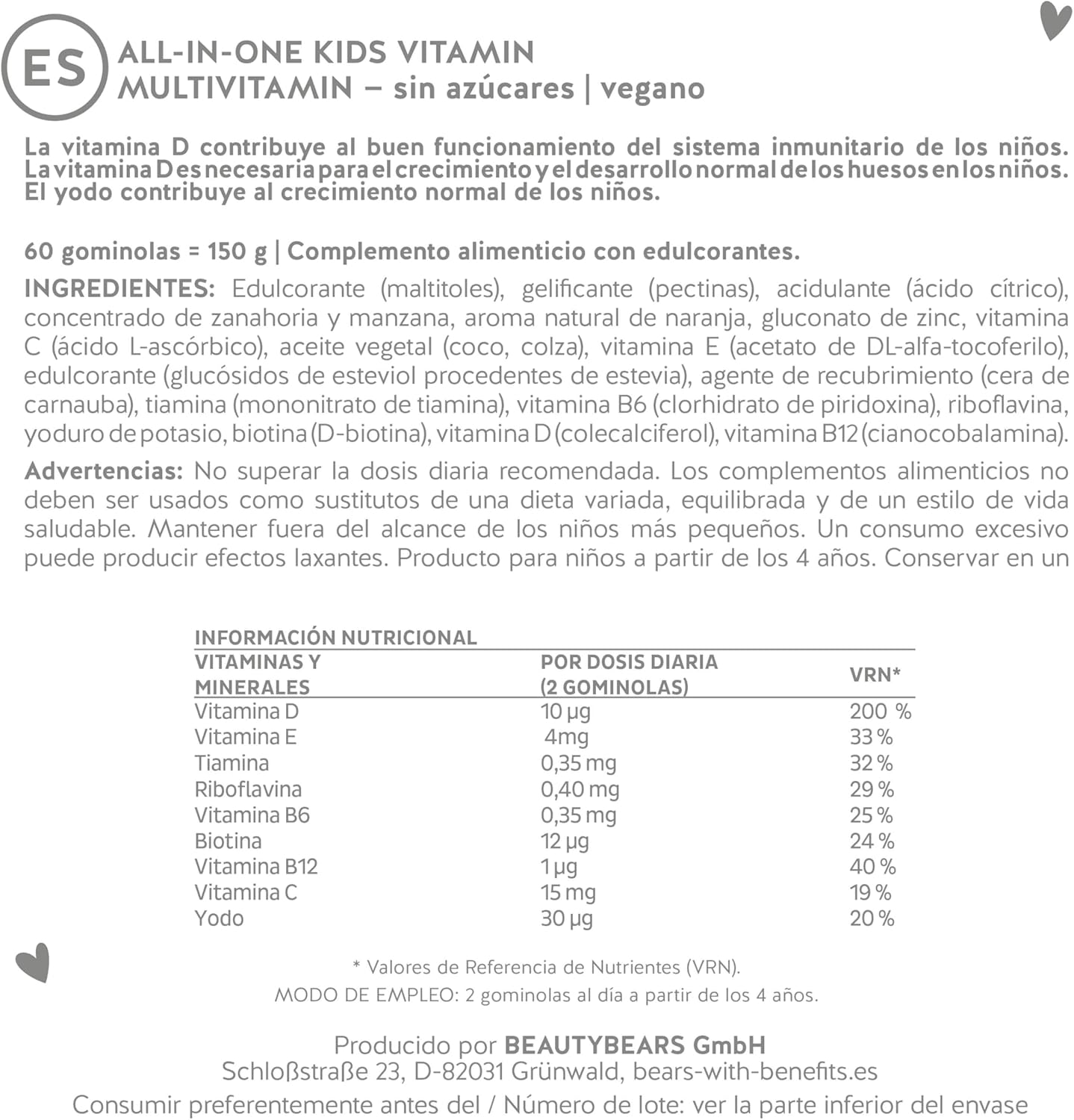 All in One Kids Vitamin is a multivitamin supplement specially formulated for children ages 4 and up, combining essential vitamins and minerals to support their growth and well-being. Presented in the form of delicious orange flavored gummy bears, it offers a practical and enjoyable way to ensure daily intake of essential nutrients. Its formula contributes to the normal functioning of the immune system: Vitamin D helps the immune system of children and is necessary for their normal bone growth and development. The included iodine promotes normal growth in children. It is recommended to take 2 bears a day as a simple and rich support for children’s health. No added sugars, vegan and suitable for children ages 4 and up.