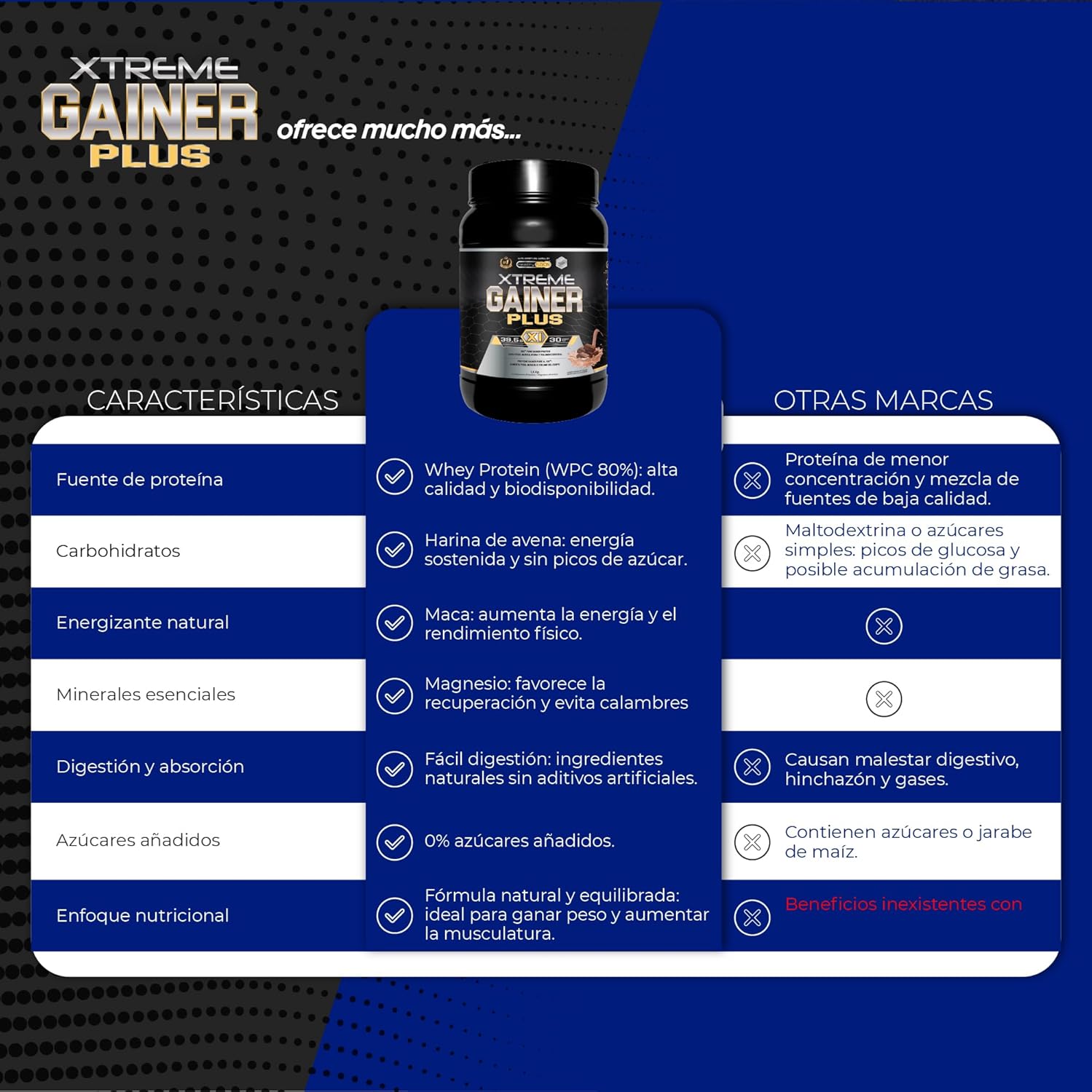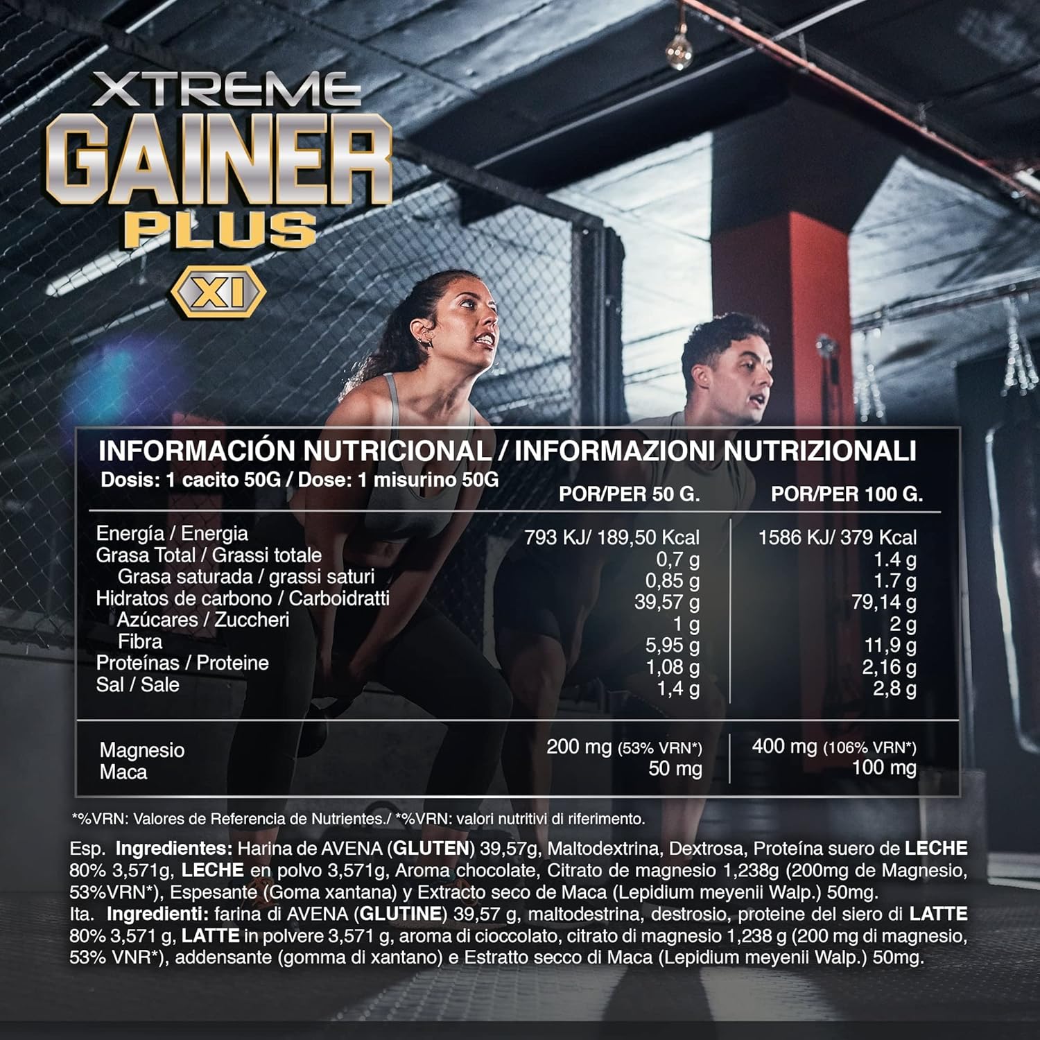 Extreme Gainer Plus – Protein and Carbohydrates Extreme Gainer Plus – Gain Weight & Muscle Mass Extreme Gainer is a high-calorie supplement, formulated with Oat Flour, Whey Protein, Maca and Magnesium ideal for gaining weight and muscle mass quickly and effectively. Its high concentration of quality carbohydrates and amino acids helps build larger, stronger and more defined muscles. In addition, it improves performance in workouts, increasing strength and endurance. Developed by Laboratorios Fersa Ibérica, it has GMP, ISO 9001 and ISO 9002 certifications, guaranteeing quality and satisfaction.