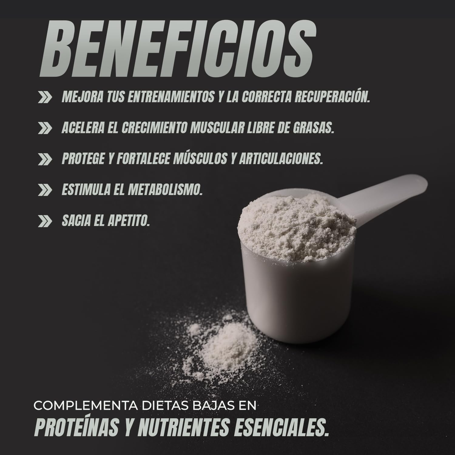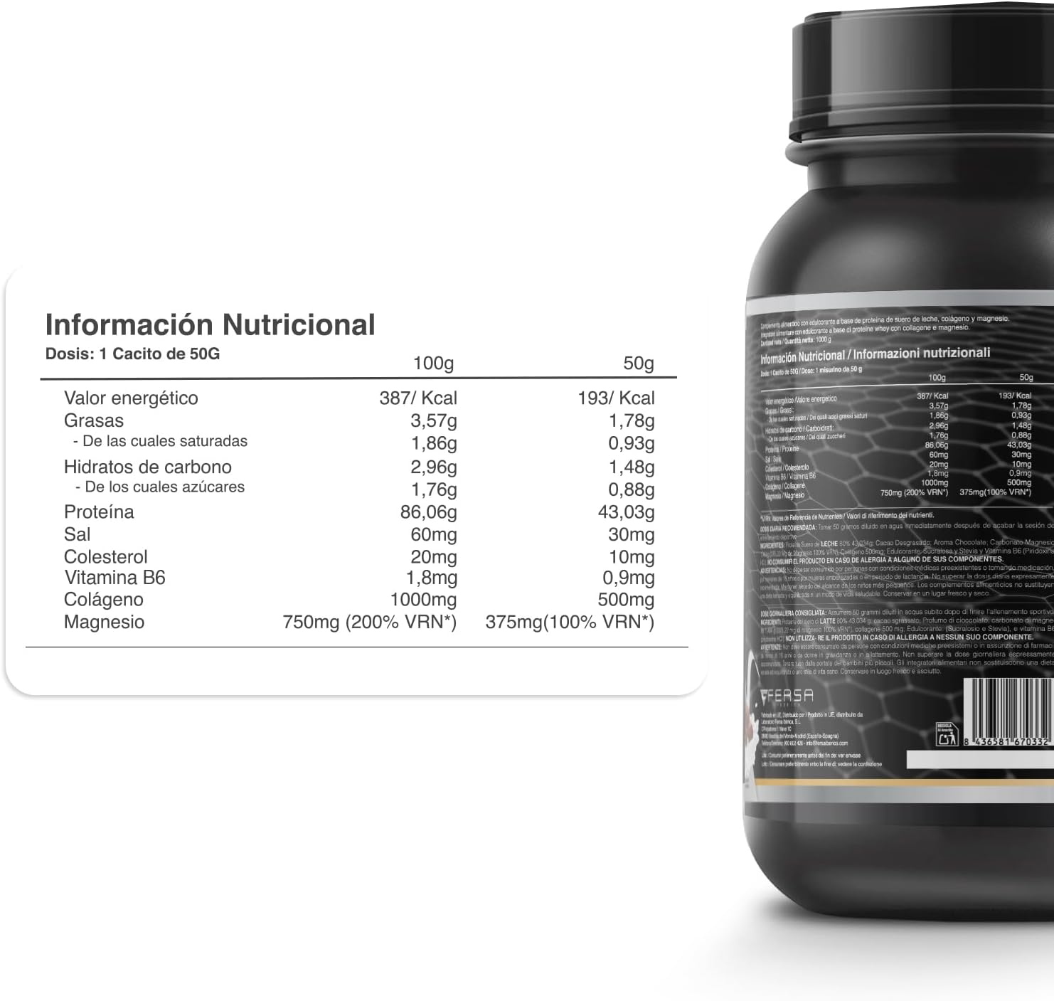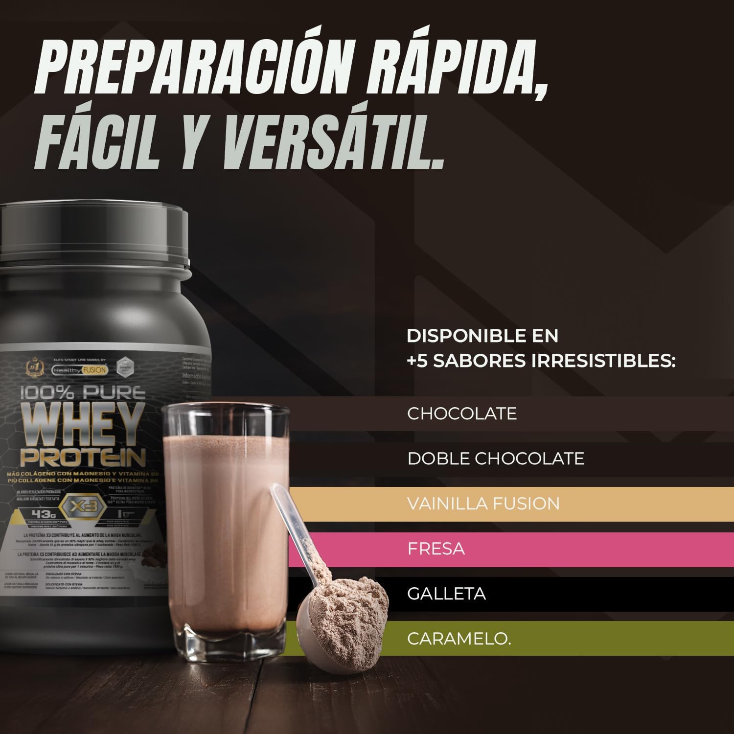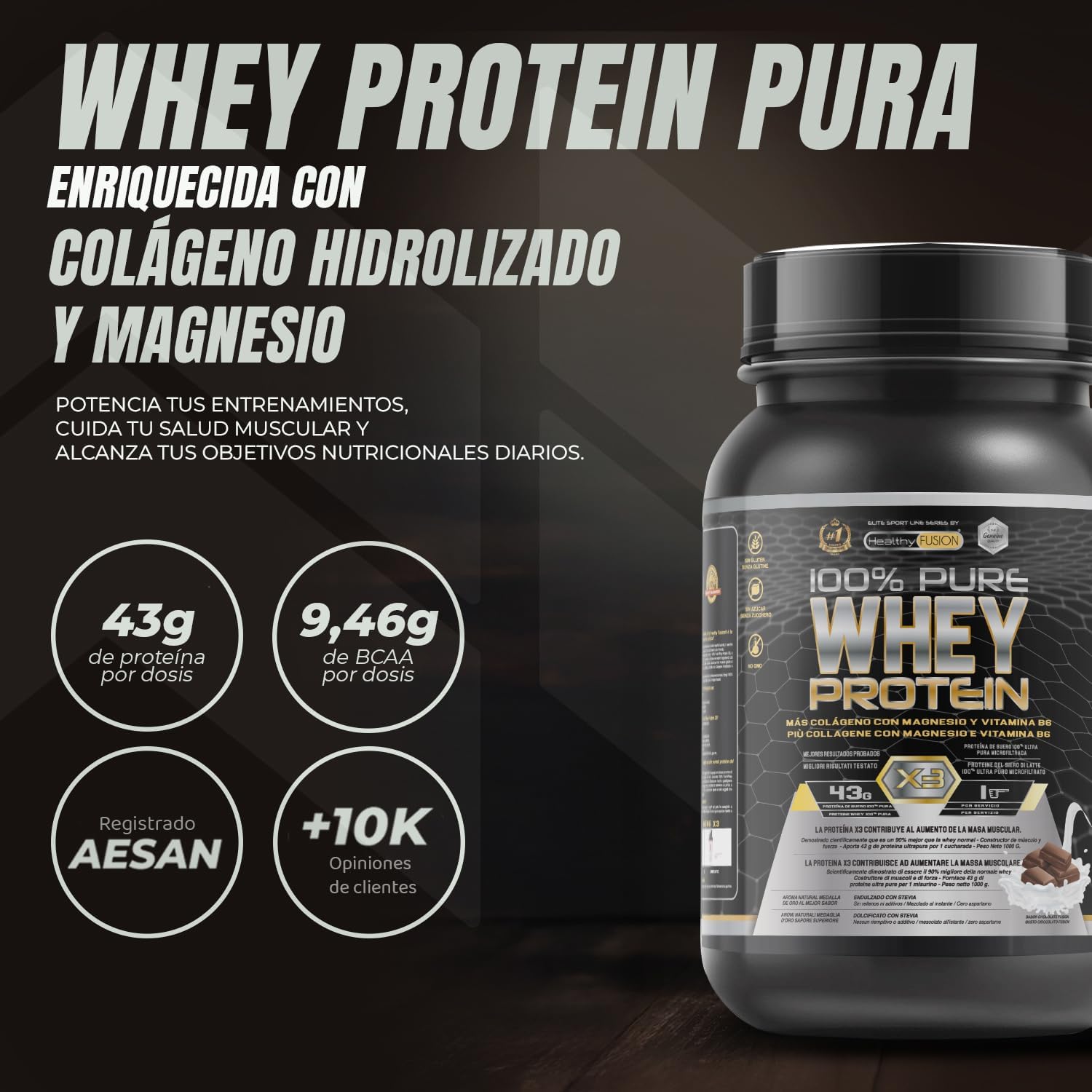 Whey Protein. 100% Pure with Collagen + Magnesium. Tones and increases muscle mass. Protects muscles. 1000 grams of pure protein. Chocolate flavor.