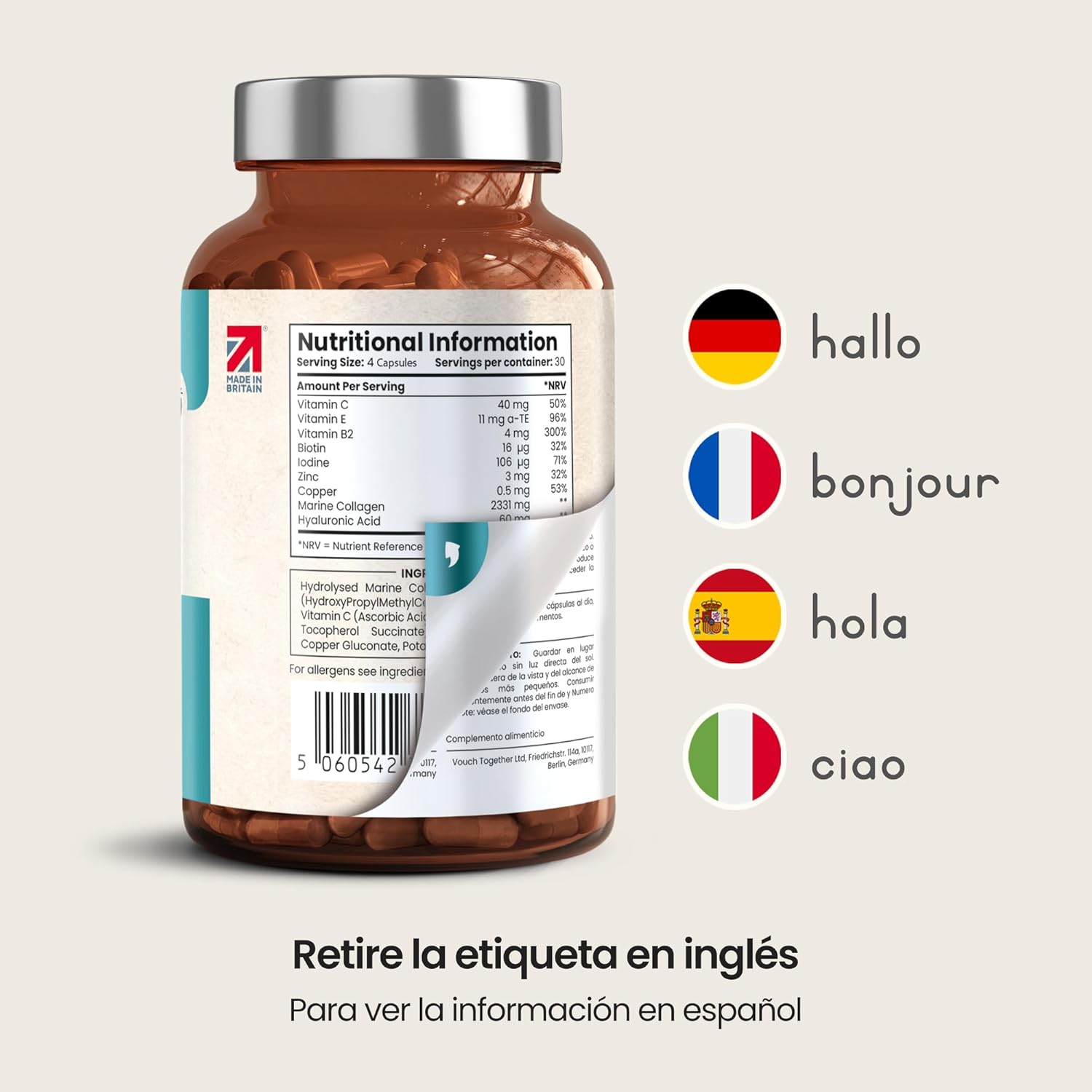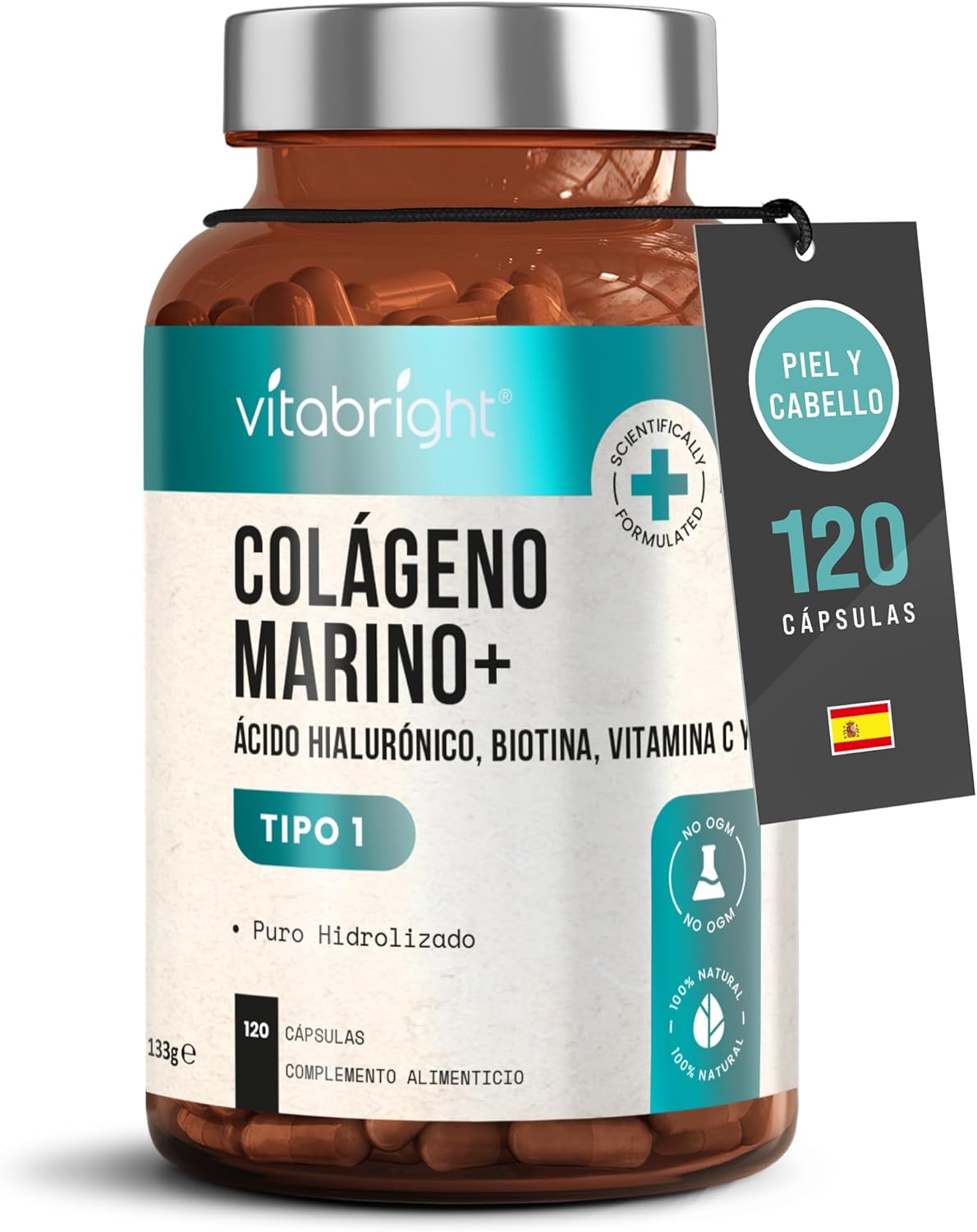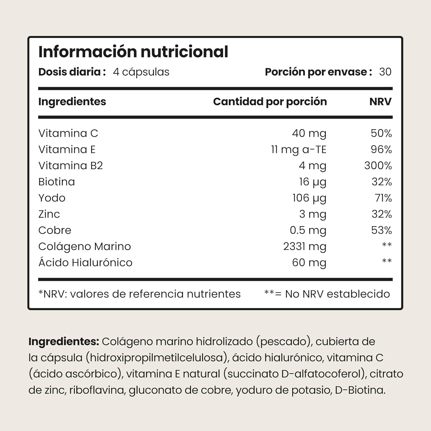 UNIQUE NUTRITIVE FORMULA FOR SKIN, HAIR AND NAILS: With biotin, vitamins B2, C and E, zinc, iodine and copper, which contribute to the maintenance of skin, hair and nails and protect cells from oxidative stress (EFSA benefits). Hyaluronic acid promotes the skin’s natural hydration, helping to maintain a firmer, smoother and more radiant appearance from the inside. Marine Collagen with Hyaluronic Acid – Beauty Capsules!
