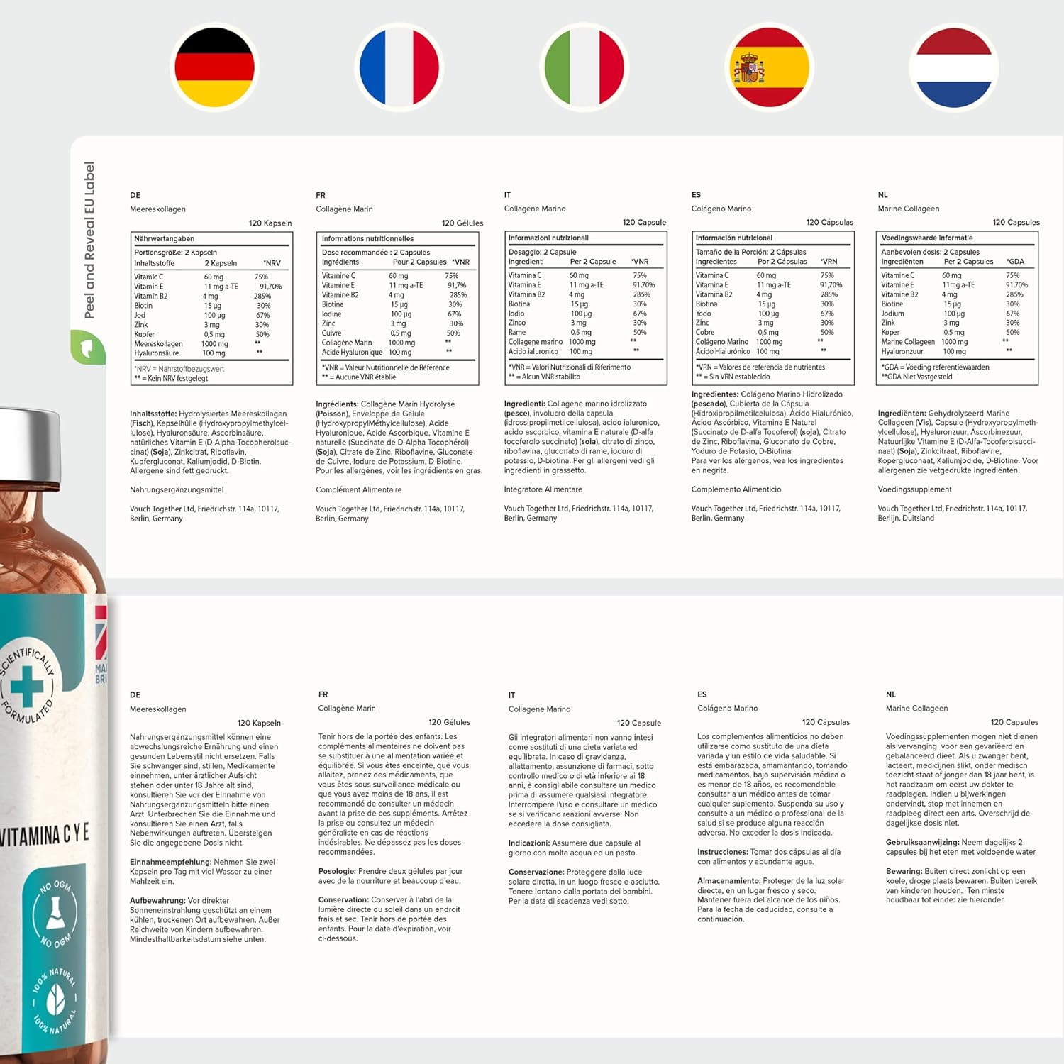 UNIQUE MARINE COLLAGEN FORMULA DESIGNED BY NUTRITIONISTS WITH 9 NUTRIENTS: Hydrolyzed collagen with 8 nutrients scientifically proven to nourish the body from within and support flexible joints and visibly younger skin. Formulated by VitaBright nutritionists, this potent combination supports the natural formation of types I, II, III, V and X collagen present in the skin, cartilage, joints and bones.