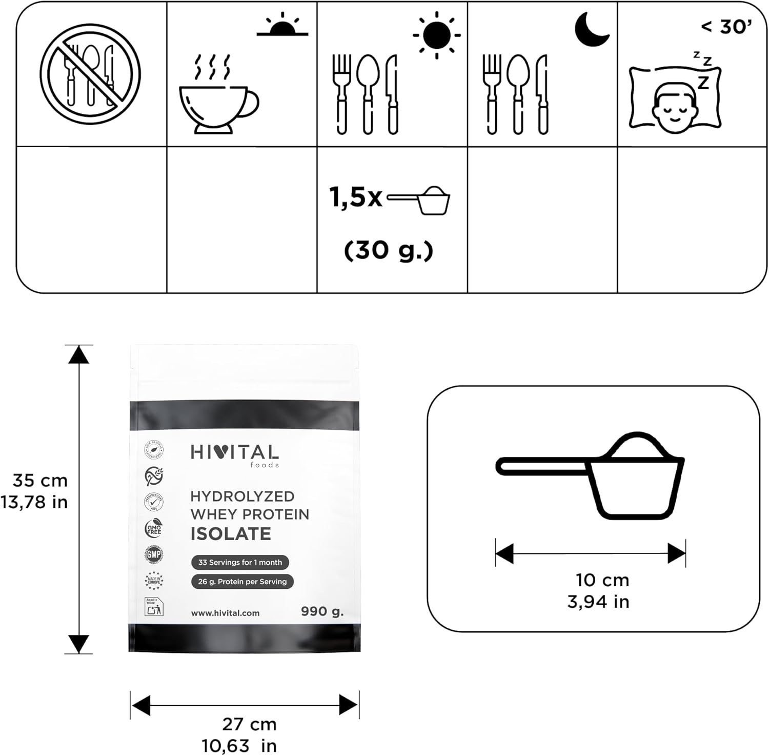 EXCELENTE FÓRMULA a base de AISLADO de Proteína Natural de Suero de LECHE. Sin Saborizantes pero con Aroma Natural de Chocolate. Todas nuestras proteínas están Hidrolizadas para garantizar la máxima absorción y biodisponibilidad. Contiene LACTOSA.GRAN CANTIDAD DE PRODUCTO EN CADA ENVASE: Ofrecemos 990 gramos de polvo por envase, para 1 mes de tratamiento (dosis diaria de 30 gramos).LA MEJOR ISOLATE WHEY: Cada dosis de 30 gramos de polvo contiene 26 gramos de proteína pura, de los cuales 26 g. (el 100%) proceden de Aislado Natural de Proteina Hidrolizada de Suero de LECHE. Sin azúcares añadidos. Contiene LACTOSA. POSOLOGÍA: Tomar 30 g al día, equivalente a un cazo y medio (incluido en el interior), disuelto en 250 ml de agua.NO UTILIZAMOS Estearato de Magnesio ni ningún tipo de Dióxido ni producto químico, aditivos poco recomendables muy utilizados en la mayoría de los complementos alimenticios de otras marcas.MÁXIMA CANTIDAD Y CALIDAD: Ofrecemos 990 gramos de polvo por envase, para 1 mes de tratamiento (dosis diaria de 30 gramos). Producto 100% Natural, Sin Gluten, Sin Soja, Sin Estearato de Magnesio, Sin Dióxidos de ningún tipo, Sin Azúcar añadido, Sin Conservantes ni Colorantes, No transgénico (GMO Free).FABRICADO EN ESPAÑA bajo certificados GMP e ISO. Hivital Foods está registrada en AESAN con número 26.019181B.100% SATISFACCIÓN TOTAL ¡Si no quedas completamente satisfecho, te devolvemos tu dinero!EBOOK DE REGALO: Al comprar nuestro producto, solicítanos nuestro ebook (en pdf) sobre la Proteína Aislada y te lo enviaremos. Conocerás en detalle todas sus propiedades y beneficios para tu salud.