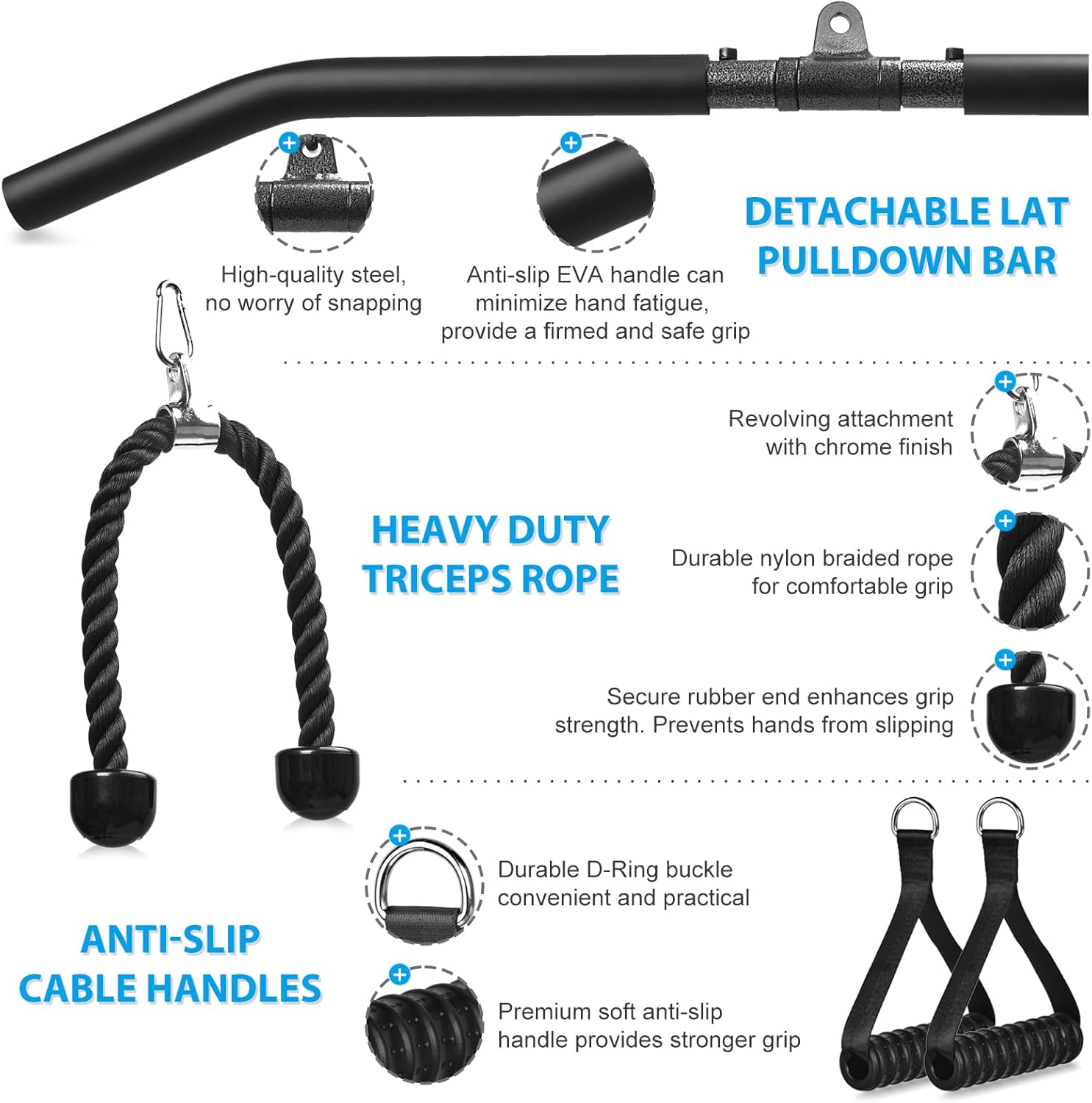 【Versatile Gym Accessories】 FASPUP pulley gym home comes with several attachments. You get three cables in this cable pulley system set, allows you to do many different exercises, train biceps, triceps, arm, shoulders, back etc.