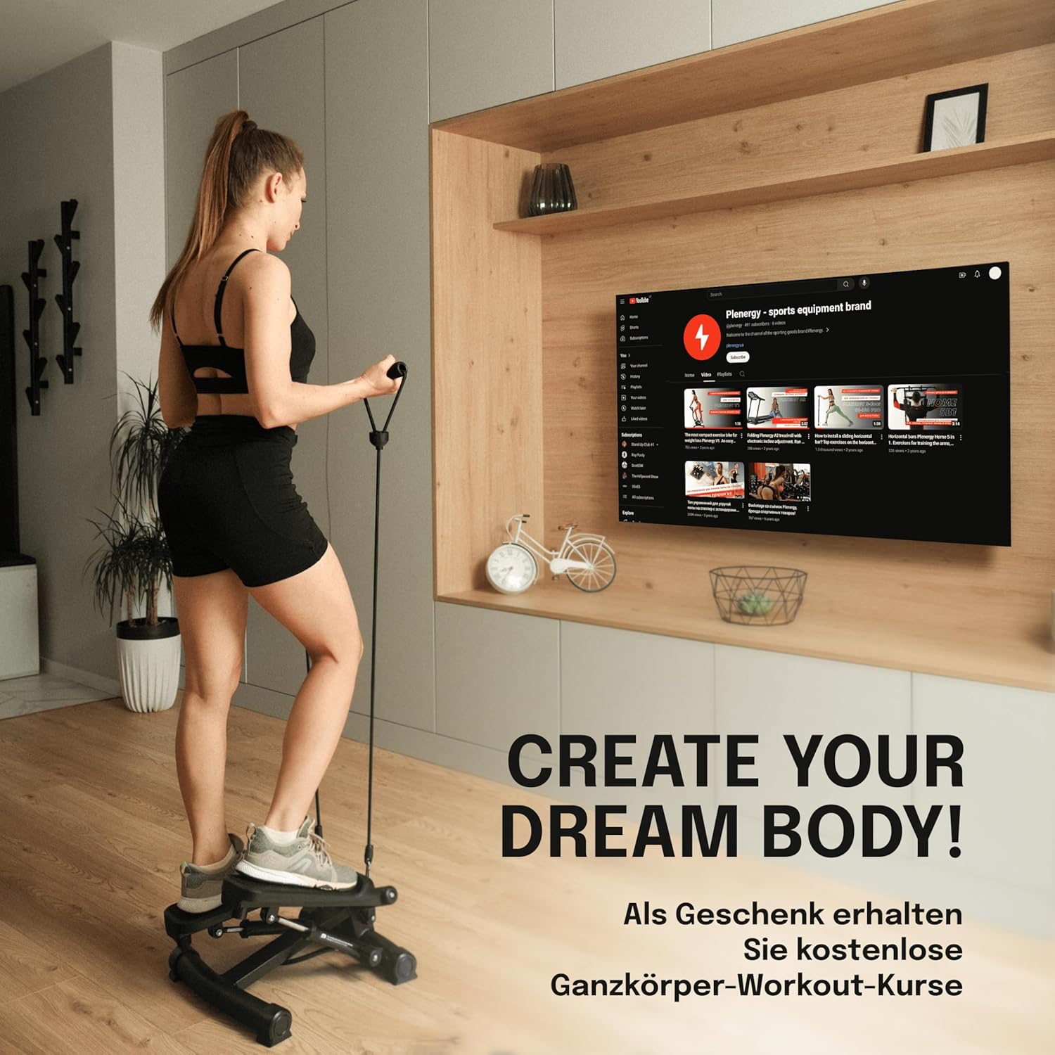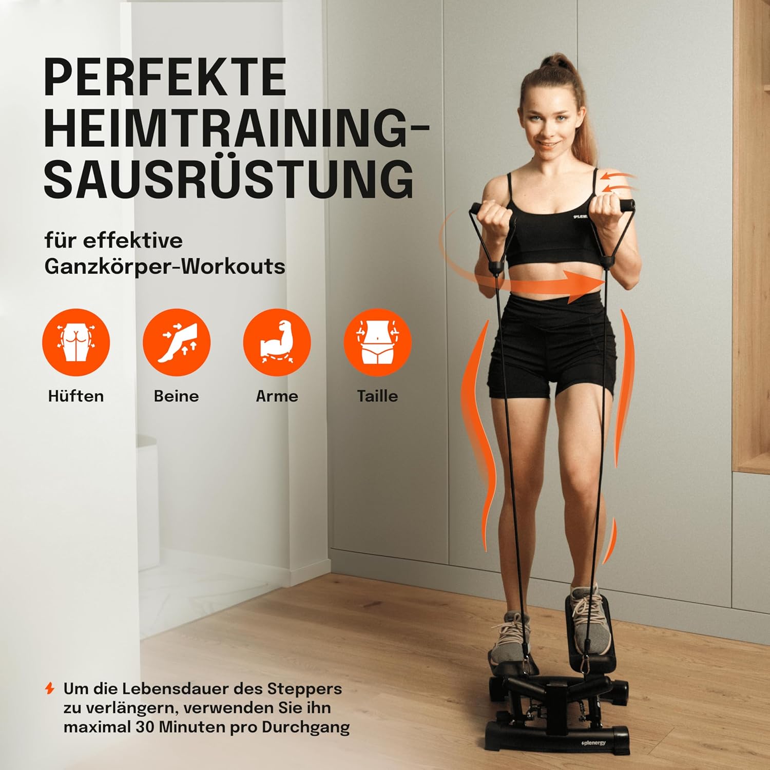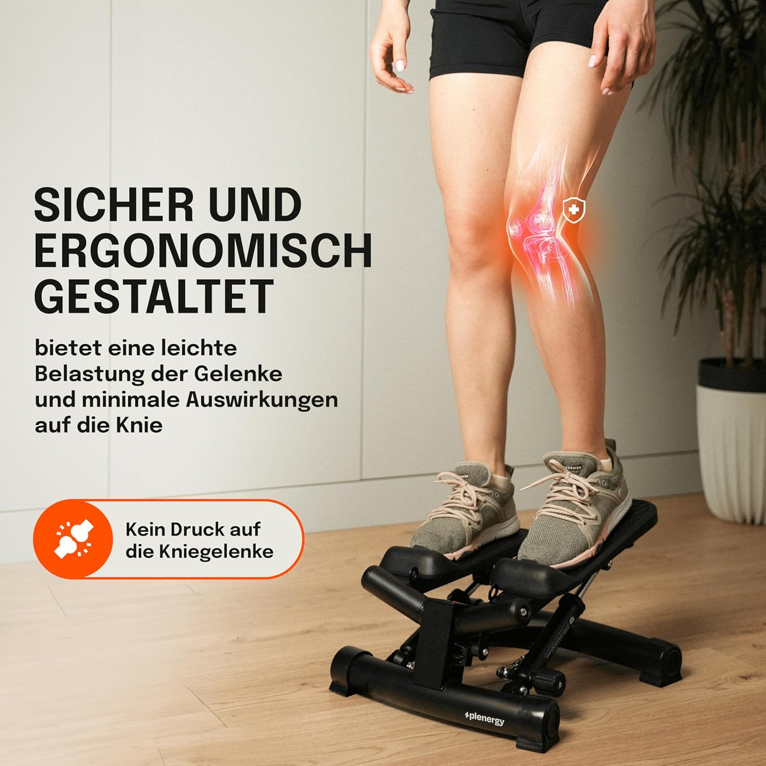 Our Step Z2 for Homegym offers unique functions for an effective and enjoyable training experience. Adjust the height of hydraulic levels according to your preferences to match the intensity of your workout exactly to your needs. Use the included bands to customize your arm training to train even more effectively. Enjoy a quiet and even movement, which is possible thanks to two hydraulic cylinders, which guarantee constant and quiet performance. These provide a comfortable workout environment where you can fully focus on your workout. With a load capacity of up to 120kg, it is suitable for a wide target group. SAFETY IS OUR NUMBER ONE PRIORITY – Our smooth, even movements reduce stress on joints and non-slip pedals ensure stability during exercise, especially for people with knee and leg problems. It is a great home leg trainer. Regular use of our stepper not only helps improve your cardiovascular health, strengthen your muscles and lose weight, but also serve your overall fitness and healthy lifestyle. It is easy to use and easy to store thanks to its compact design, perfect for use at home or in the office. With its virtually silent operation, you can train at any time without disturbing others. In addition, we offer free Plenergy workout programs specifically designed to support your fitness goals and provide a variety of exercises you can perform with your new stepper. Smart sport at home with Plenergy!