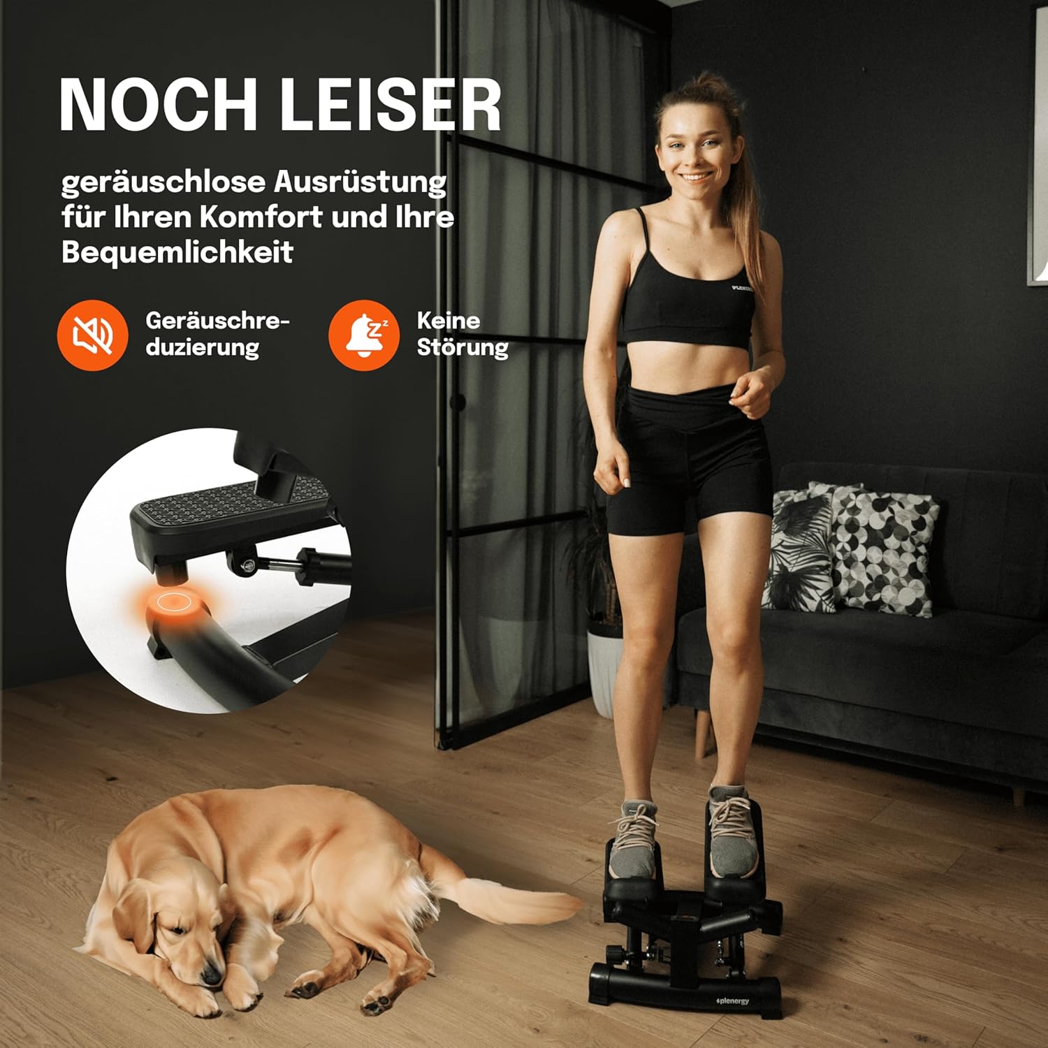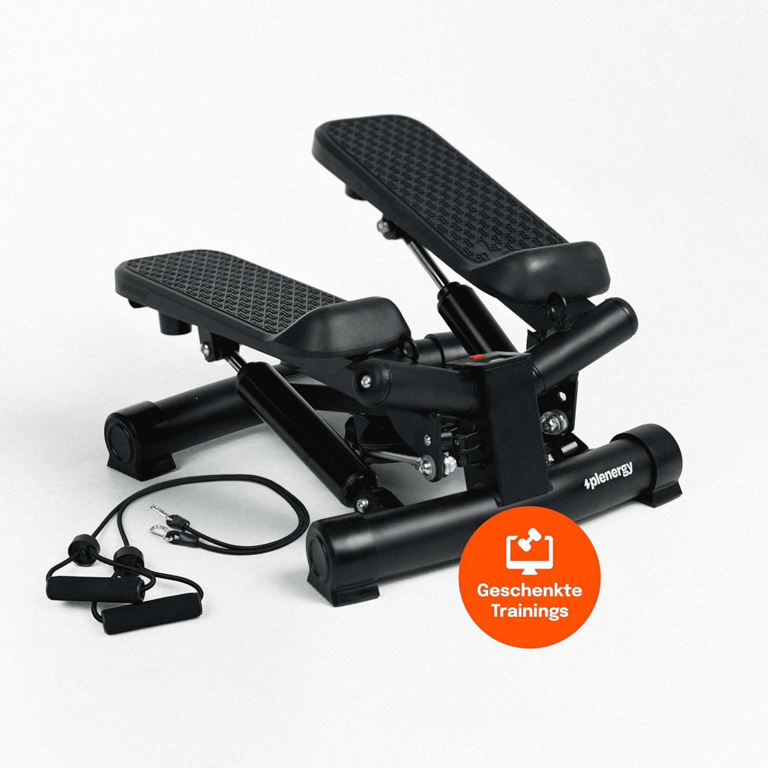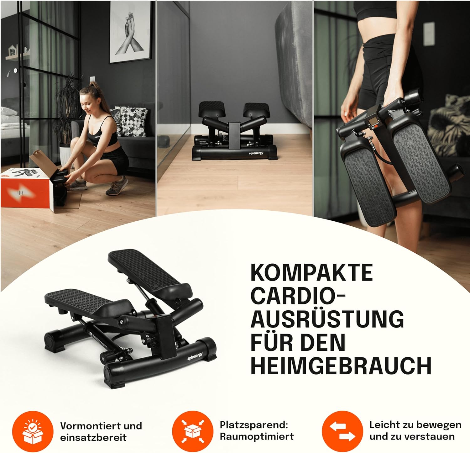 Our Step Z2 for Homegym offers unique functions for an effective and enjoyable training experience. Adjust the height of hydraulic levels according to your preferences to match the intensity of your workout exactly to your needs. Use the included bands to customize your arm training to train even more effectively. Enjoy a quiet and even movement, which is possible thanks to two hydraulic cylinders, which guarantee constant and quiet performance. These provide a comfortable workout environment where you can fully focus on your workout. With a load capacity of up to 120kg, it is suitable for a wide target group. SAFETY IS OUR NUMBER ONE PRIORITY – Our smooth, even movements reduce stress on joints and non-slip pedals ensure stability during exercise, especially for people with knee and leg problems. It is a great home leg trainer. Regular use of our stepper not only helps improve your cardiovascular health, strengthen your muscles and lose weight, but also serve your overall fitness and healthy lifestyle. It is easy to use and easy to store thanks to its compact design, perfect for use at home or in the office. With its virtually silent operation, you can train at any time without disturbing others. In addition, we offer free Plenergy workout programs specifically designed to support your fitness goals and provide a variety of exercises you can perform with your new stepper. Smart sport at home with Plenergy!