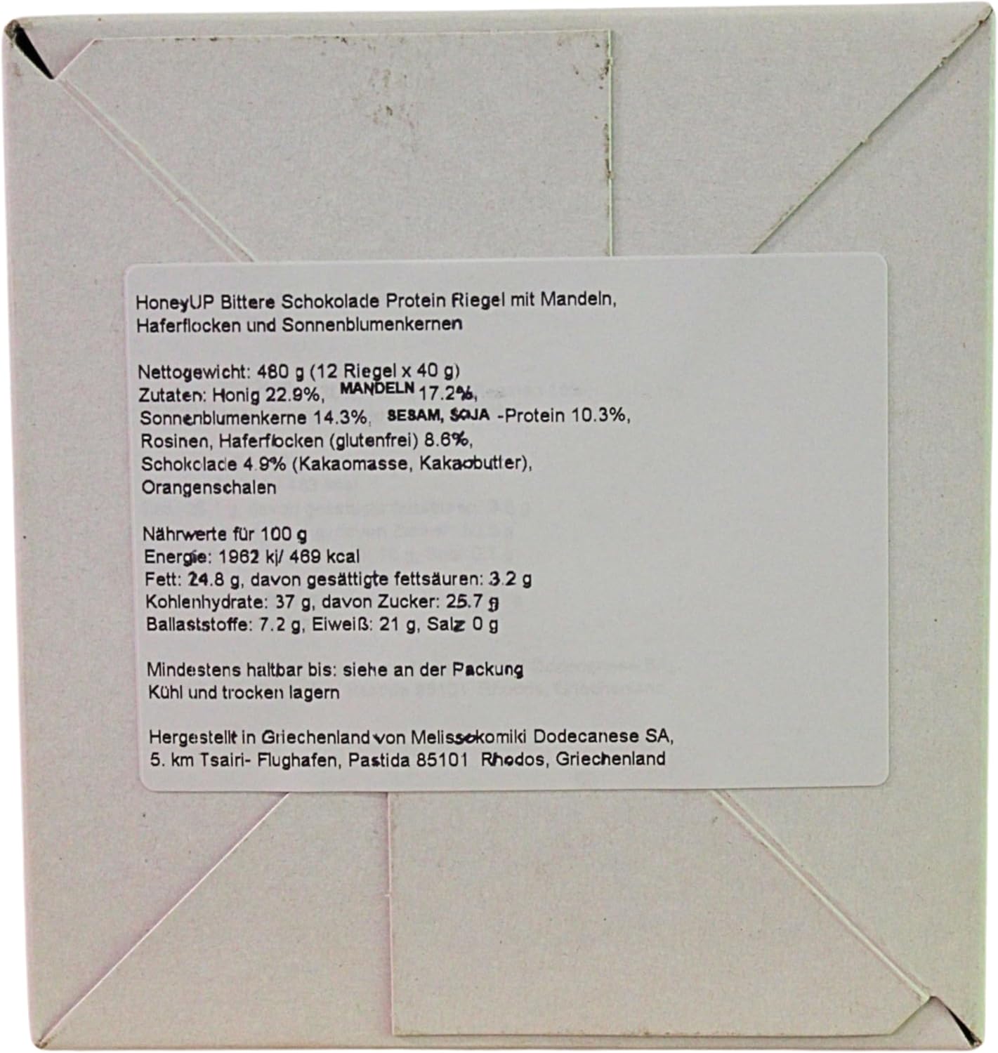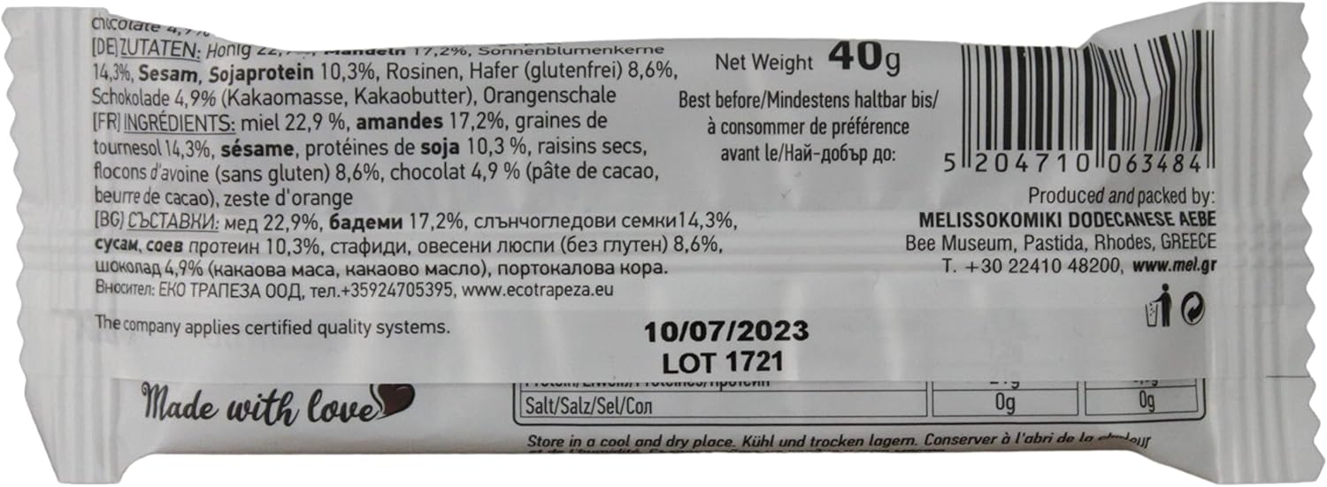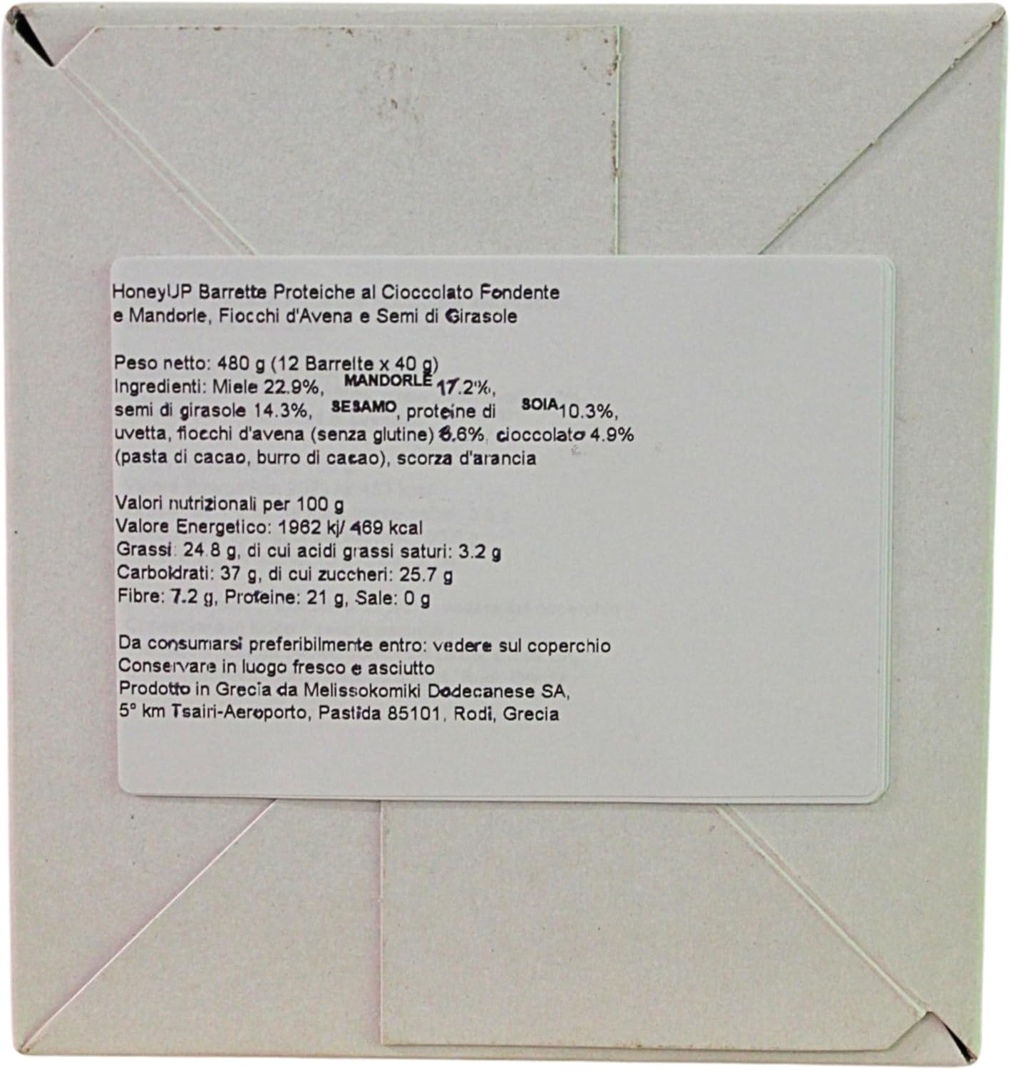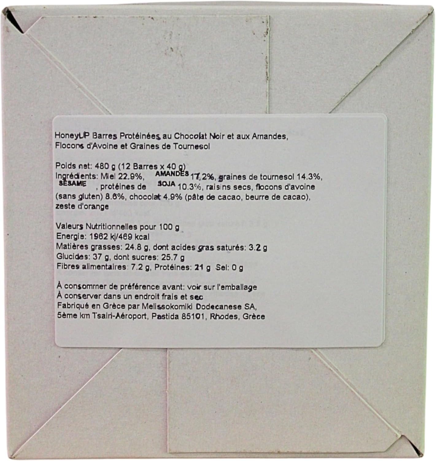 HoneyUp Dark Chocolate Almond Protein Bars combine the best of Greek tradition with a crunchy texture and irresistible flavor. Each bar contains oat flakes, almonds and sunflower seeds, creating a convenient and delicious snack ready to go. The pack includes 12 bars of 40 g, perfect to consume at any time of the day: as a snack at school, in the office or as a quick alternative before and after training. Made with 100% Greek ingredients, these bars contain no added sugars, preservatives, gluten or GMOs. Plus, they’re suitable for vegetarians and offer a crispy texture and intense flavor that combines natural sweetness with quality ingredients.