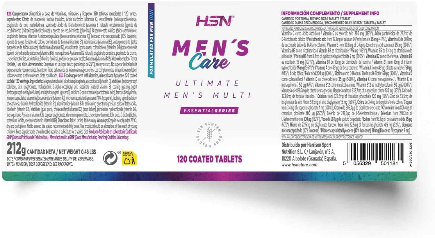 [ MEN’S MULTIVITAMINS ] Gluten-free food supplement in tablets, which contains a complex with the 8 water-soluble vitamins of group B, Vitamin C, the 4 fat-soluble vitamins (A, D, E and K), and lycopene. Specially designed formula to meet the specific needs of men. 4 month supply.