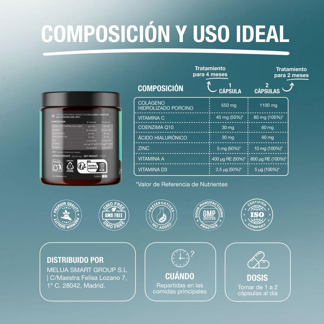 ADVANCED FORMULA OF HYDROLYZED COLLAGEN, HYALURONIC ACID AND VITAMINS | Our optimized formula contains highly absorbable hydrolyzed collagen peptides, which stimulate collagen production and hydrate from the inside, improving skin elasticity and strengthening hair and nails. Includes Hyaluronic Acid, the most powerful natural moisturizer for skin and joints. Vitamins C, A and D3 with antioxidant and immunoprotective properties, plus zinc and coenzyme Q10.