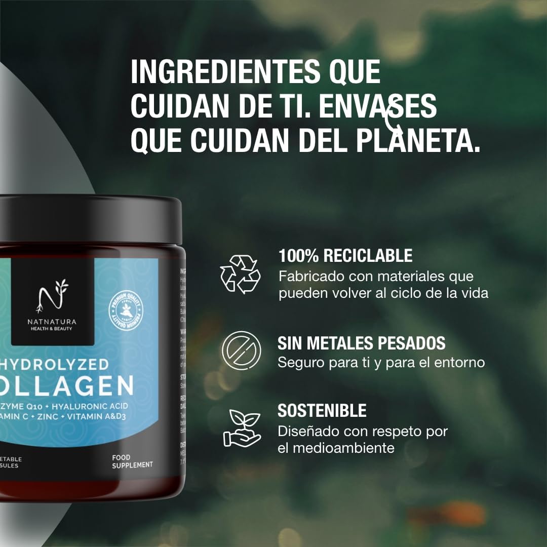 PREMIUM QUALITY, MADE IN SPAIN AND WITH 100% RECYCLED BOTTLE WITHOUT HEAVY METALS | Developed by experts and manufactured in Spain under strict quality controls, our hydrolyzed collagen meets all European standards. We use vegetable capsules and a 100% recycled packaging, because we believe that health should go hand in hand with respect for the planet. Safe, traceable formula, no unnecessary additives and backed by Spanish health registers