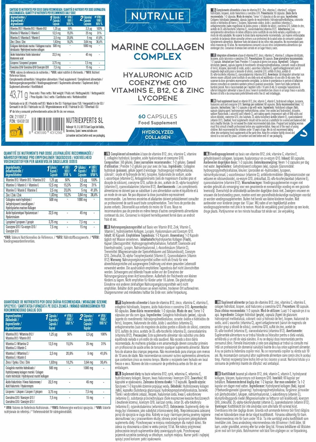 Marine Hydrolyzed Collagen 1000MG: Each dose of 2 capsules Nutralie Marine Collagen Complex contains 1000mg of Marine Hydrolyzed Collagen, 45mg of Hyaluronic Acid.