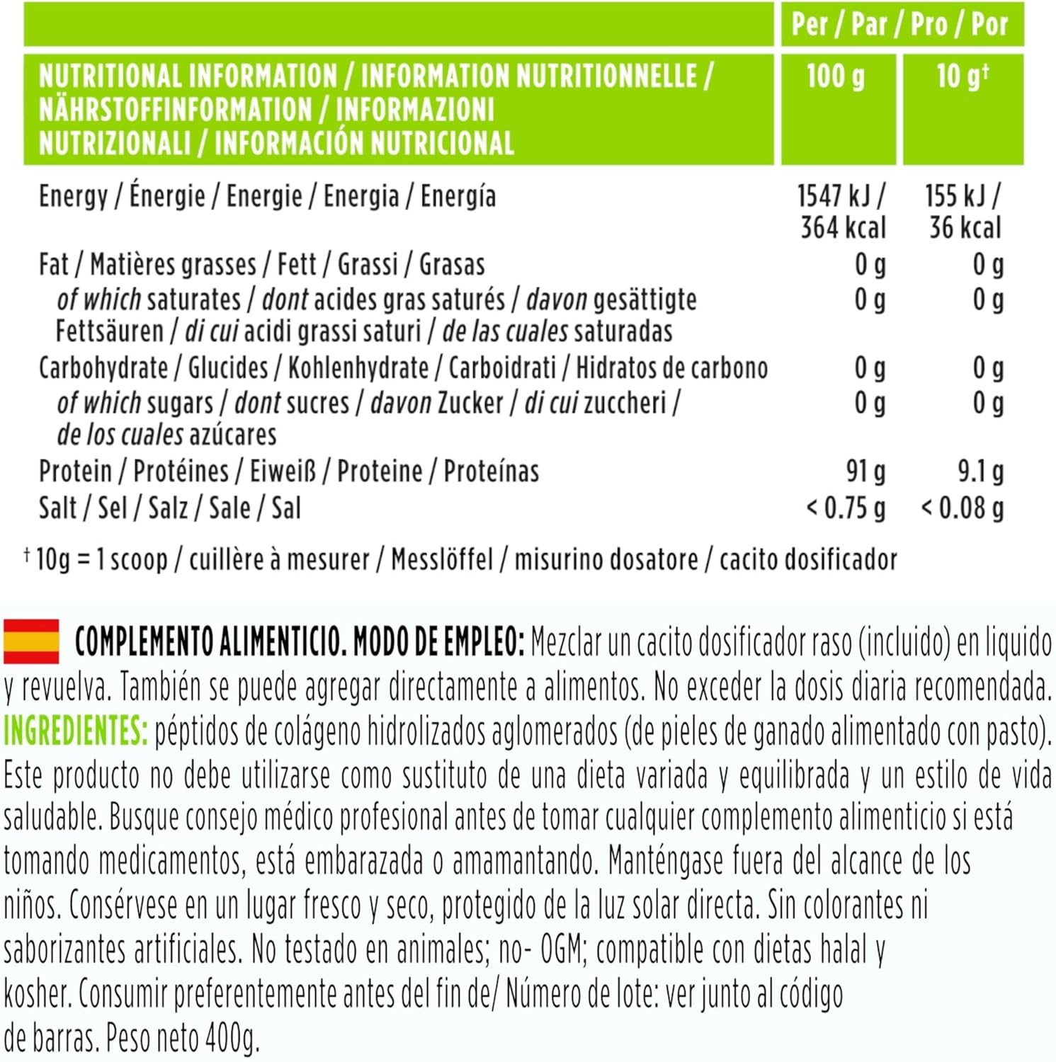 BOOSTER FOR BONES, HAIR, SKIN AND NAILS: Collagen is an essential component for healthy skin, hair, joints and blood vessels. As protein helps the growth and maintenance of muscle mass and bones, key for athletes