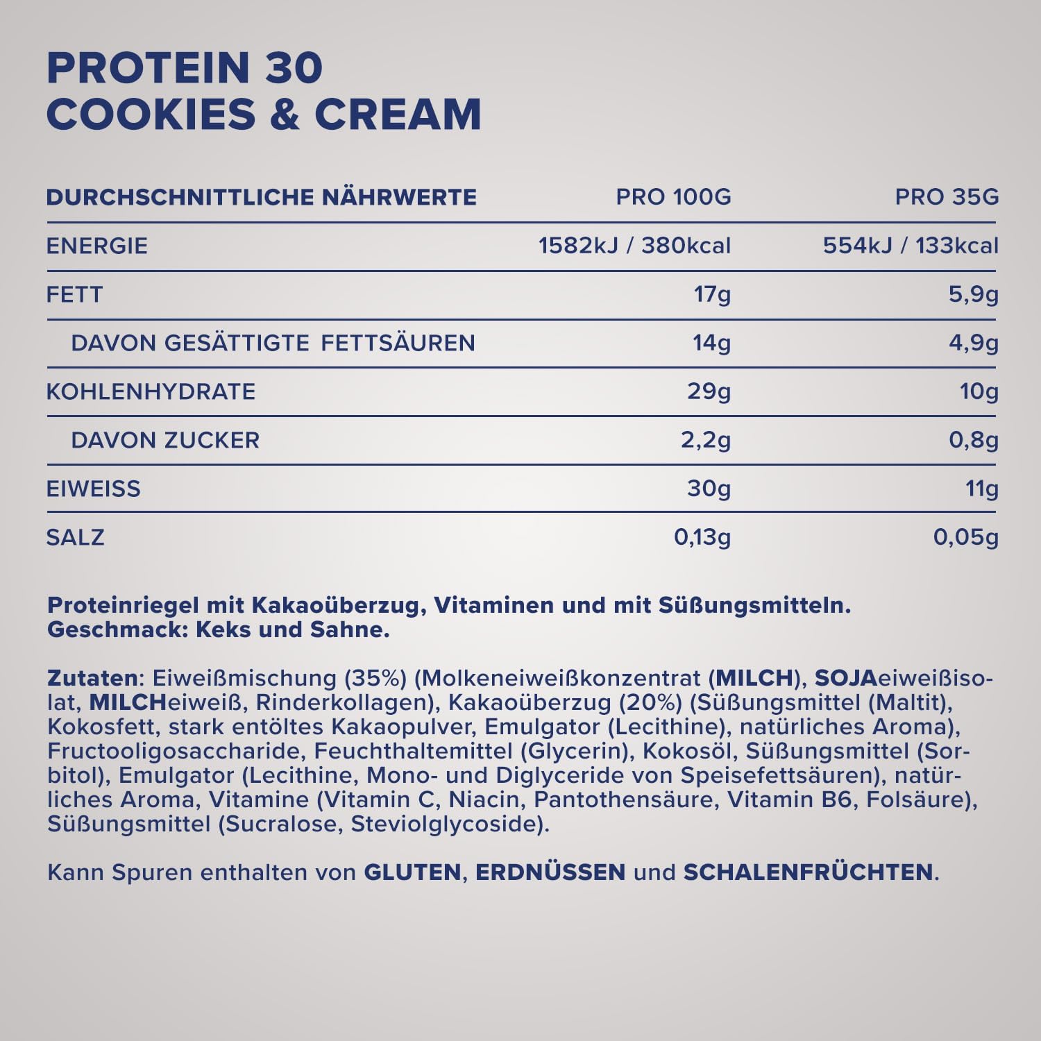 There are currently many protein bars on the market but which one is perfect for you? The protein and vitamins in this high protein bar provide an extra serving of protein for function and muscle development with few sugars. The Protein 30 bar only contains 0.9 grams of sugars per bar (35 grams) and 11 grams of the best protein and comes made without palm oil. Total protein energy for your workout and also as a snack, when a decline in performance and a feeling of hunger are imminent! A fitness bar that has been developed as an alternative and as a complement to your protein shake. And what about the taste? It’s just good! Find your favorite bar and choose from flavors: chocolate, peanuts, coconut, vanilla, cookies and cream or banana.