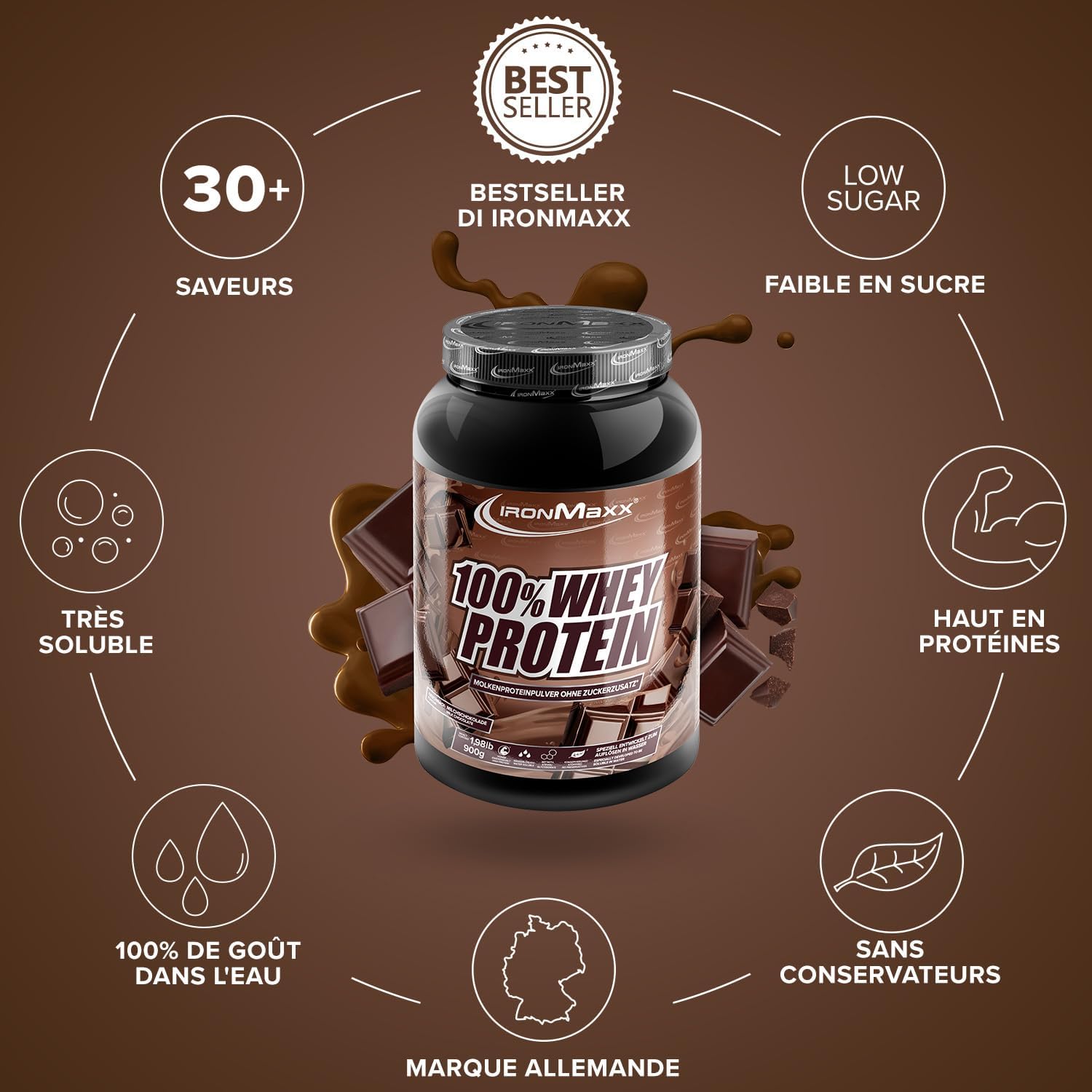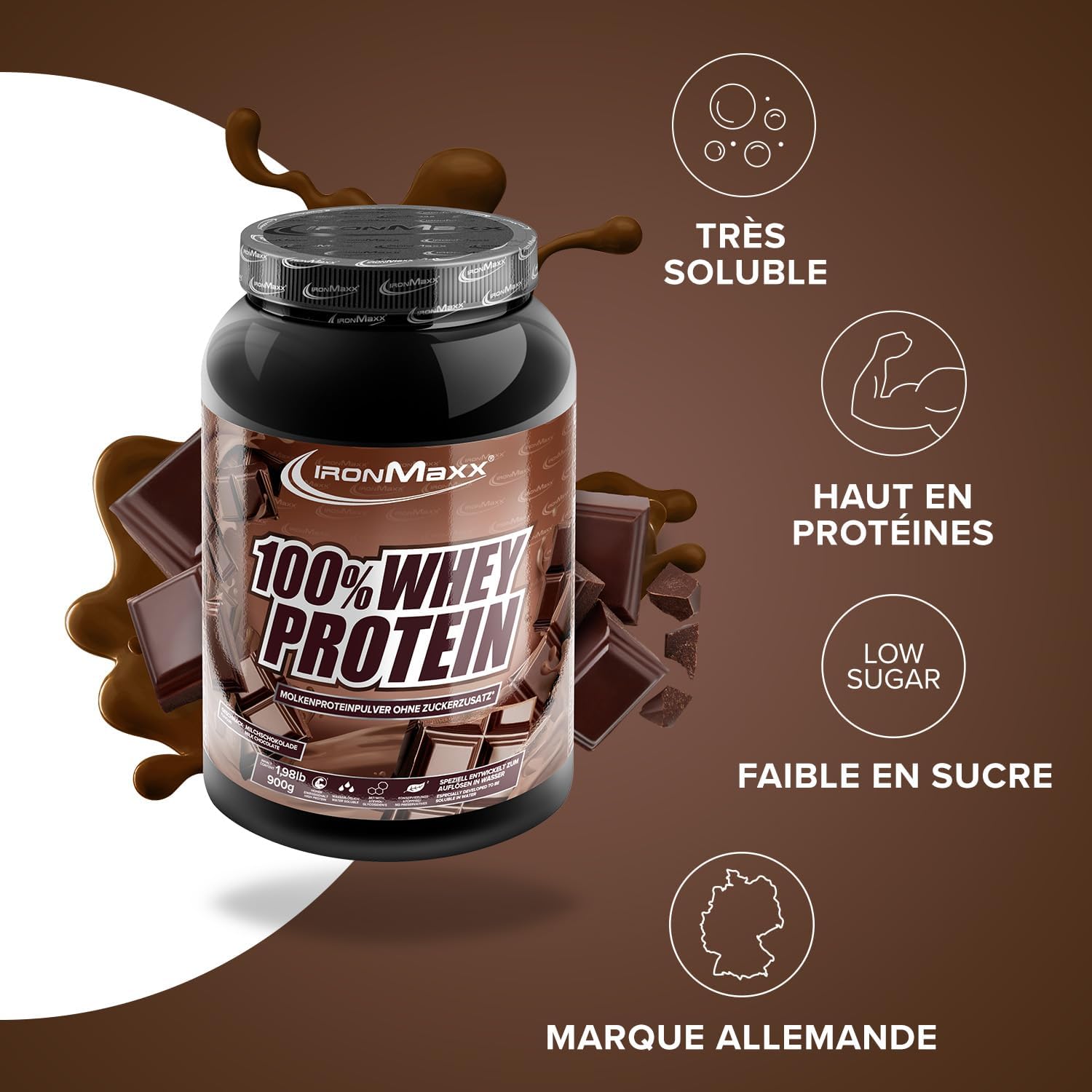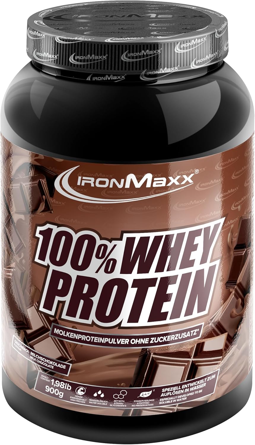 IronMaxx Whey 100% Por ciento Proteína de suero en polvo- soluble en agua- sabor: chocolate con leche – bote de 900g (1 paquete)