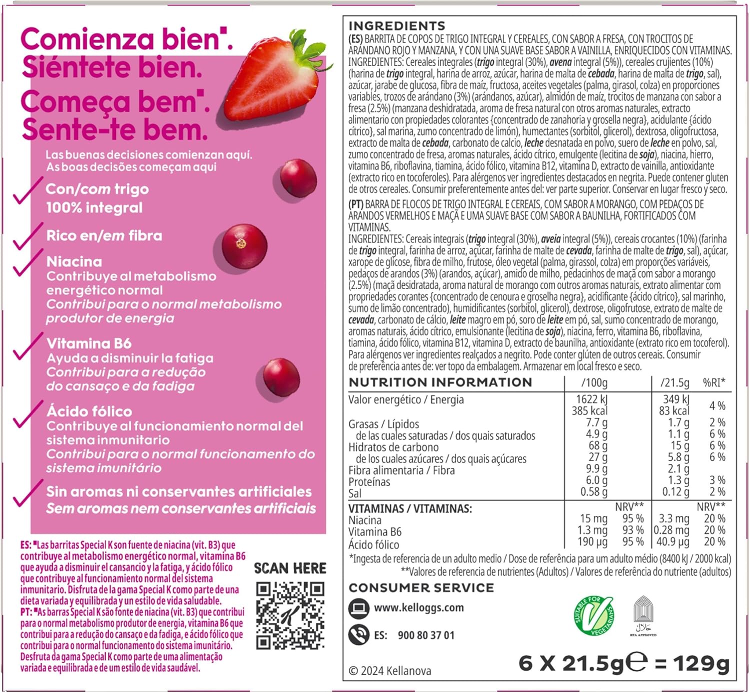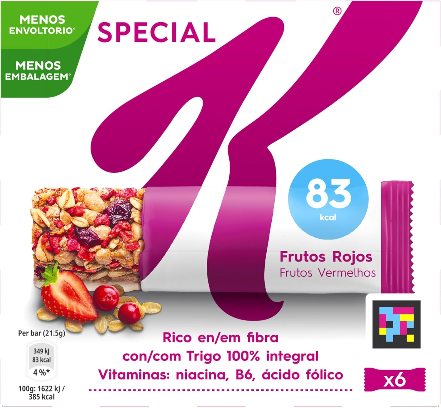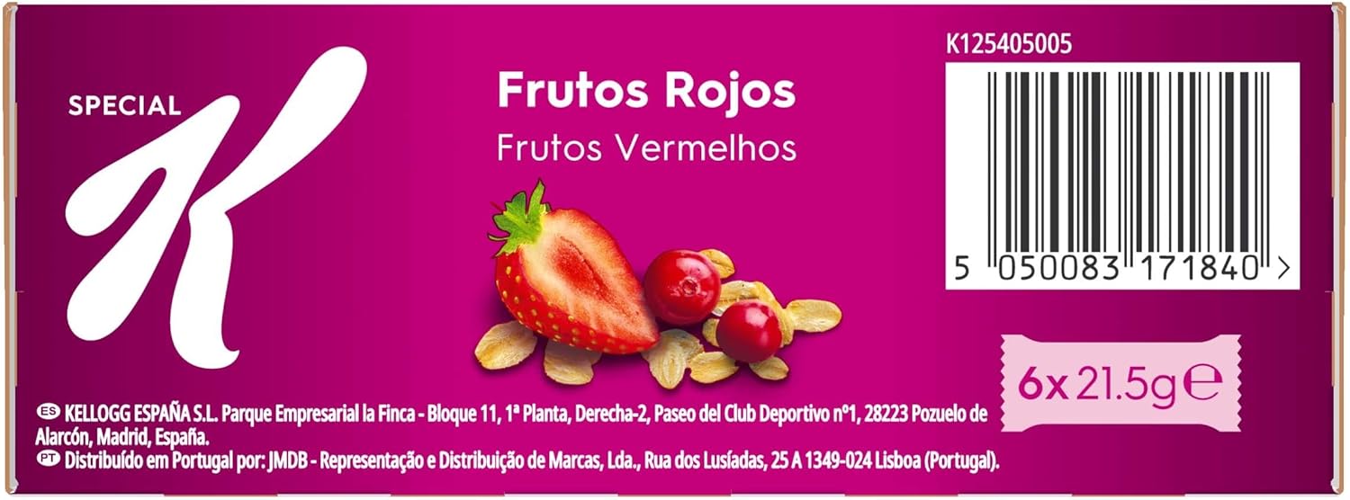 Special K Red Fruits bars are bars of whole wheat flakes and cereals with fruit pieces flavored with strawberry and lingonberry. They are ideal at any time. The bars are rich in fiber, with no artificial flavors or preservatives and come in a pack of 6 bars of 21.5g.