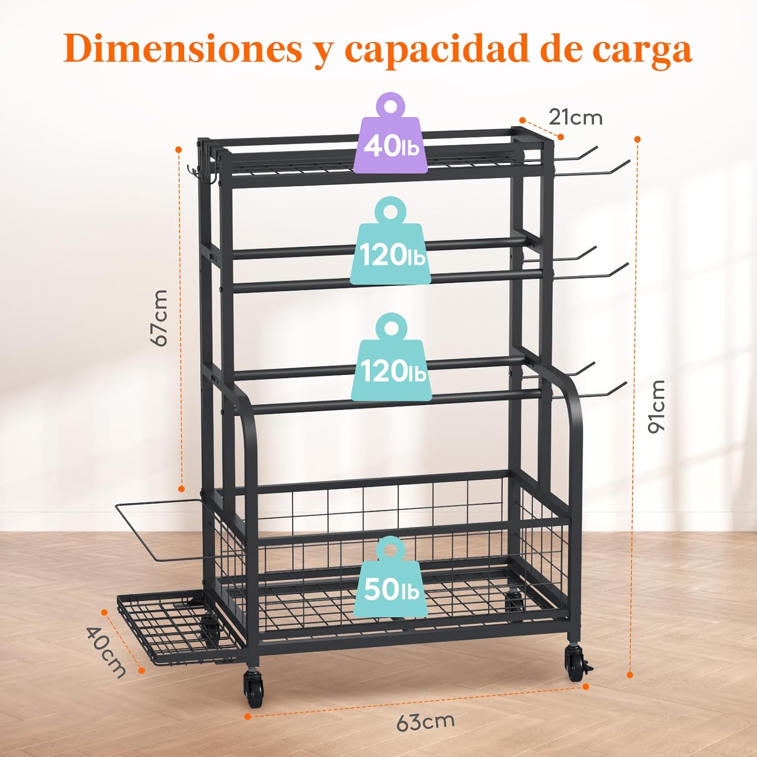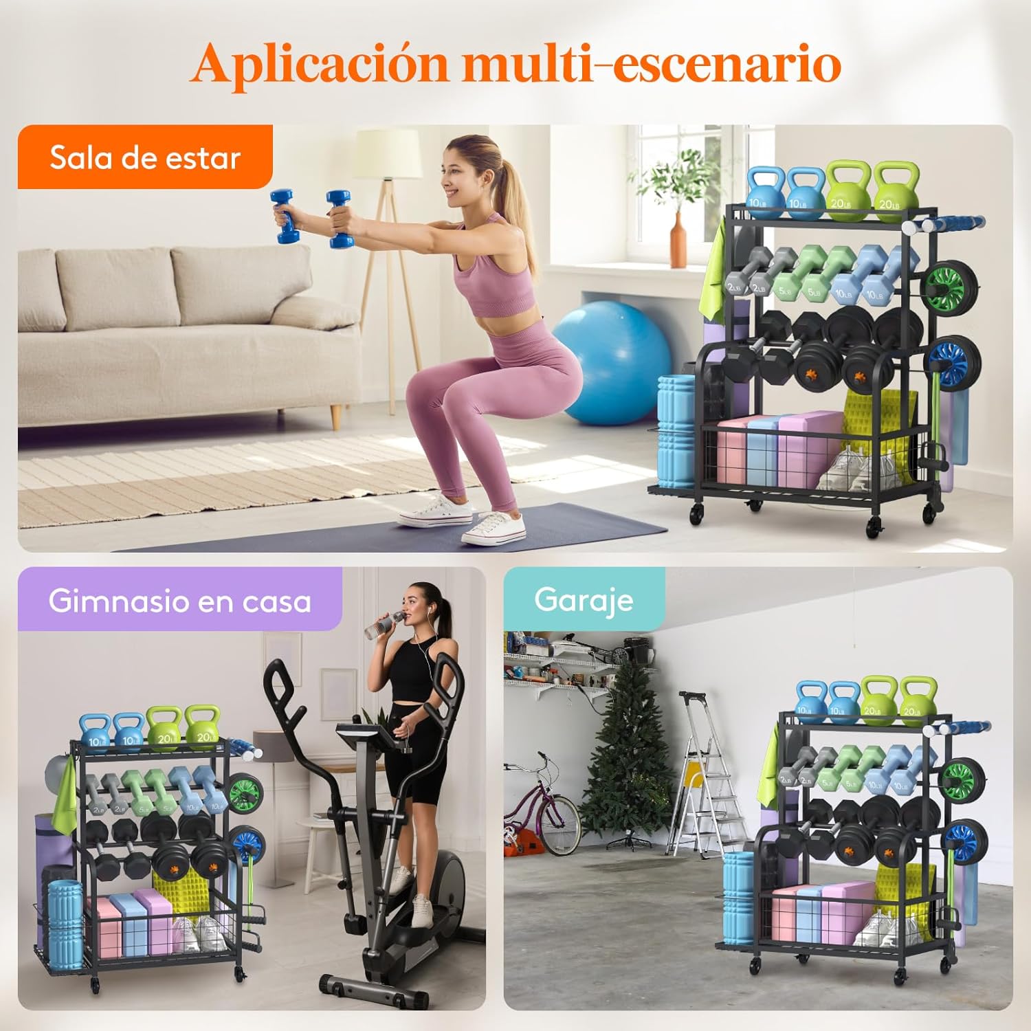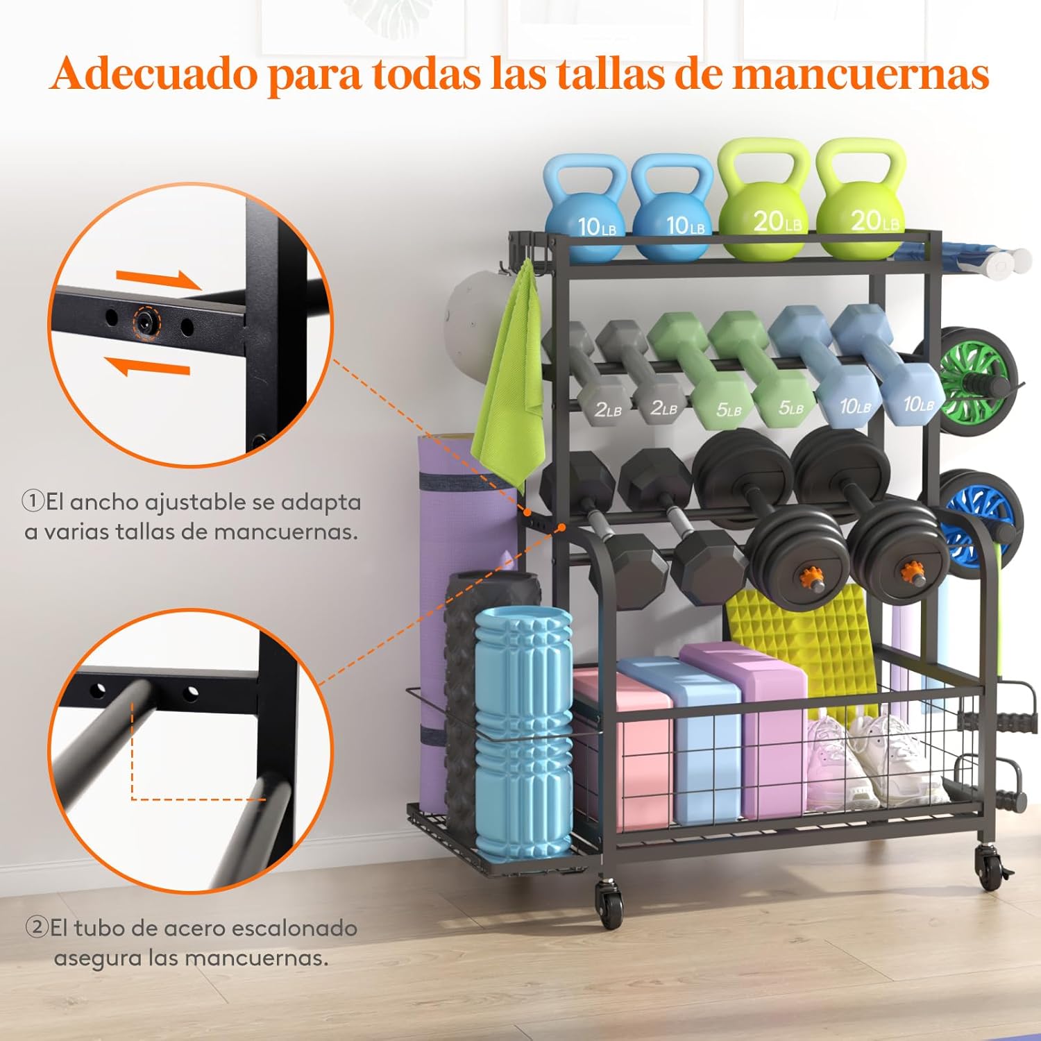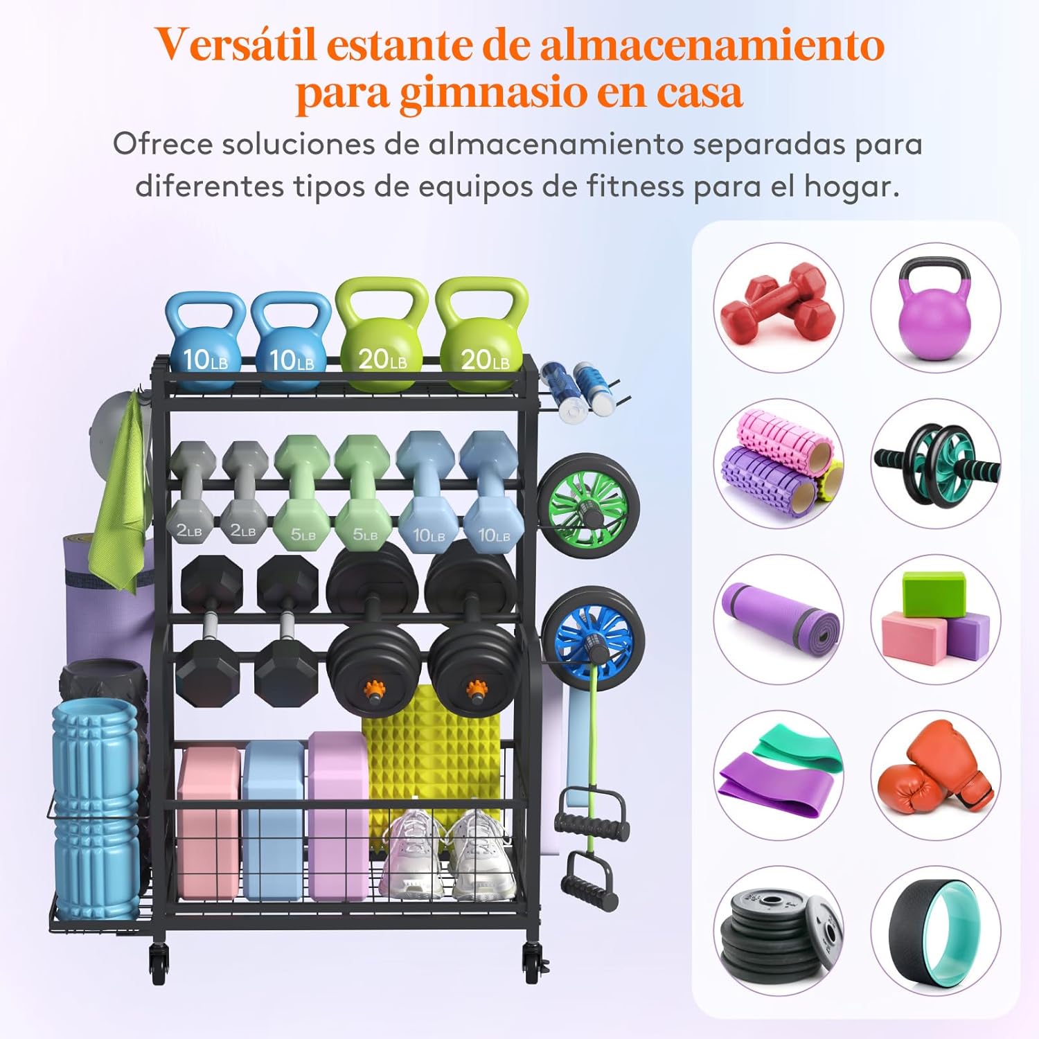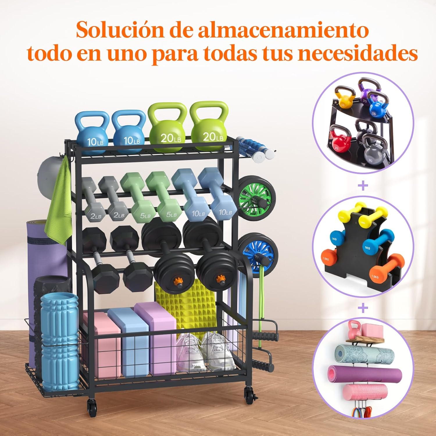 El estante superior de malla de hierro es ideal para pesas rusas, rodillos y guantes de boxeo. El estante de 2 niveles sostiene tus mancuernas de forma segura, manteniéndolas ordenadas y evitando que rueden. La cesta inferior acomoda pelotas, bloques de yoga, discos y zapatos. Los ganchos laterales son perfectos para colgar bandas de resistencia, cinturones, ruedas y toallas.