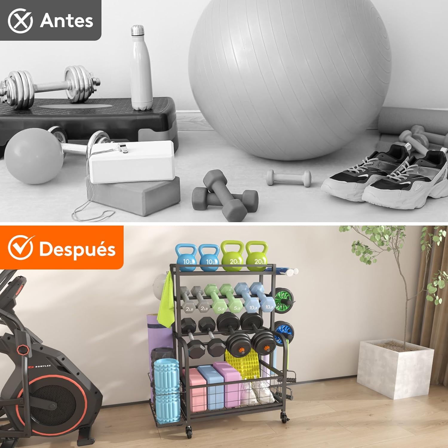 Puedes almacenar todos estos equipos utilizando solo un estante. Se acabaron los espacios desordenados con múltiples estantes para cada artículo. Con nuestro estante todo en uno, puedes almacenar eficientemente mancuernas, pesas rusas, esterillas de yoga o rodillos de espuma en un solo lugar. No más buscar el estante correcto o perder tiempo organizando equipos por separado. Esta solución de almacenamiento todo en uno es un verdadero cambio total.