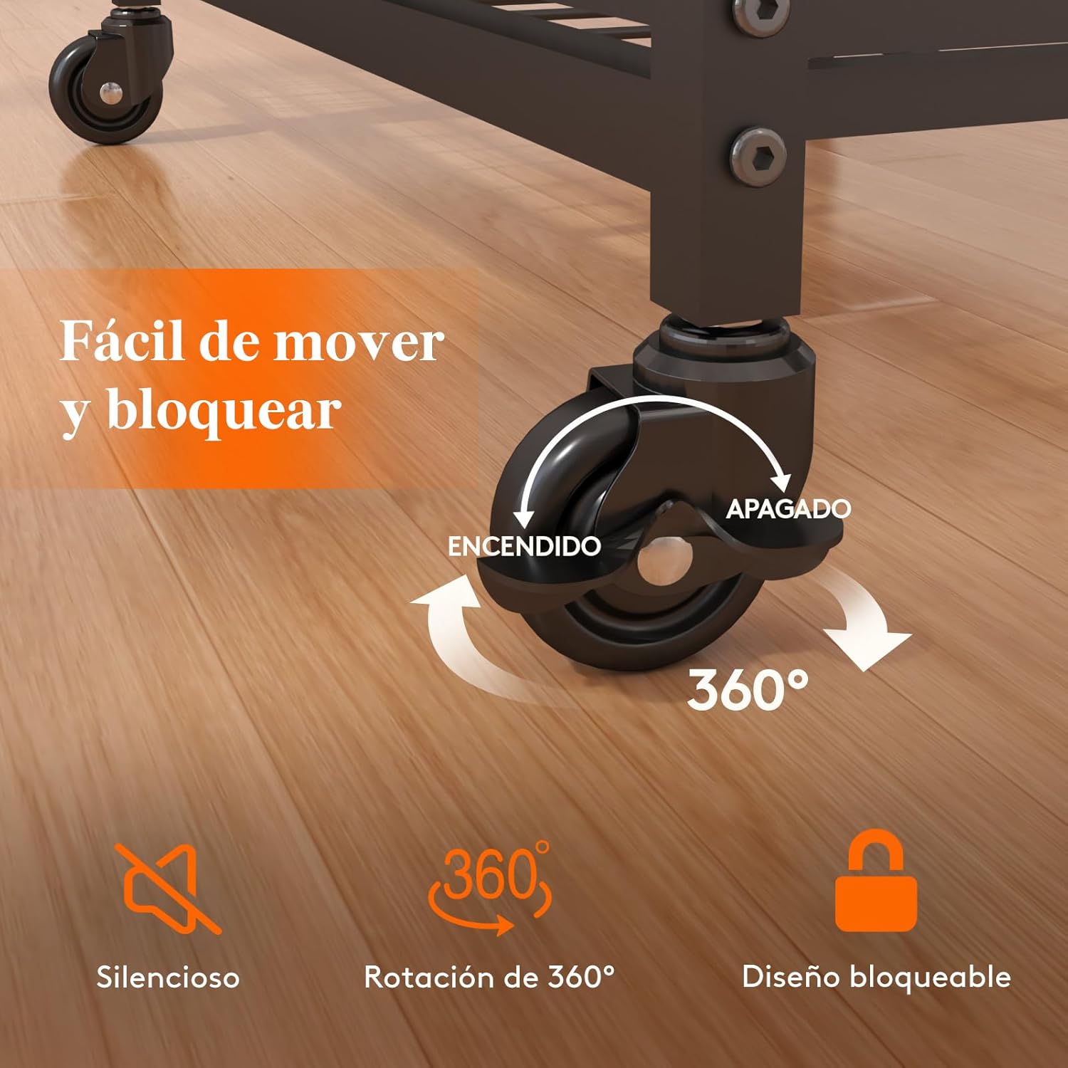 Viene con 4 ruedas giratorias, incluidas dos bloqueables, permitiendo una fácil movilidad y una colocación segura en cualquier lugar que desees.