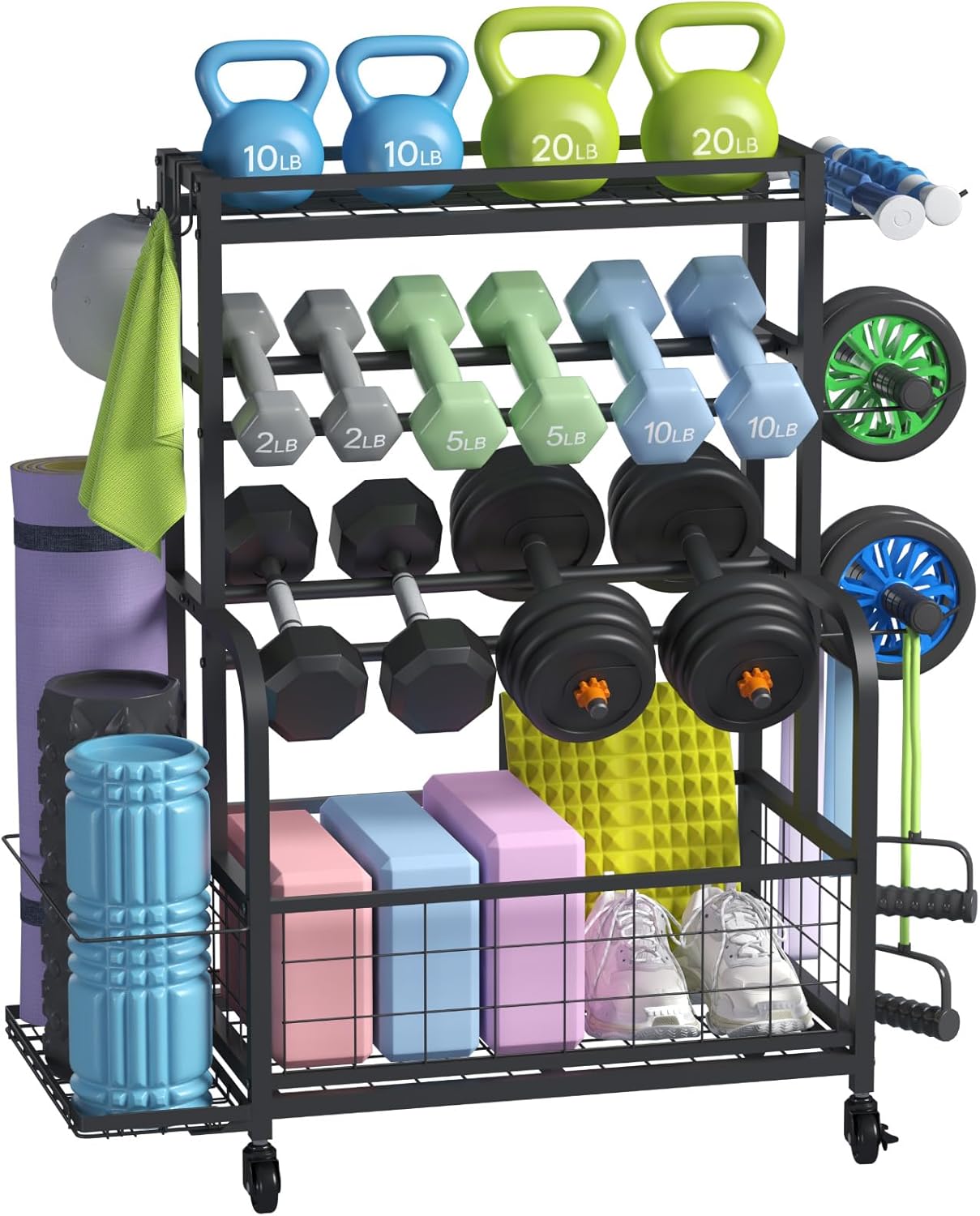 VERSATILE HOME GYM STORAGE RACK – Offers storage solutions for different fitness equipment. Top rack is ideal for kettlebells, rollers and boxing gloves. The 2 tier rack is perfect for dumbbells. The side basket accommodates mats and foam rollers, while the lower basket is for balls, yoga blocks, discs, shoes, etc. In addition, there are side hooks for resistance bands, belts, wheels and towels.