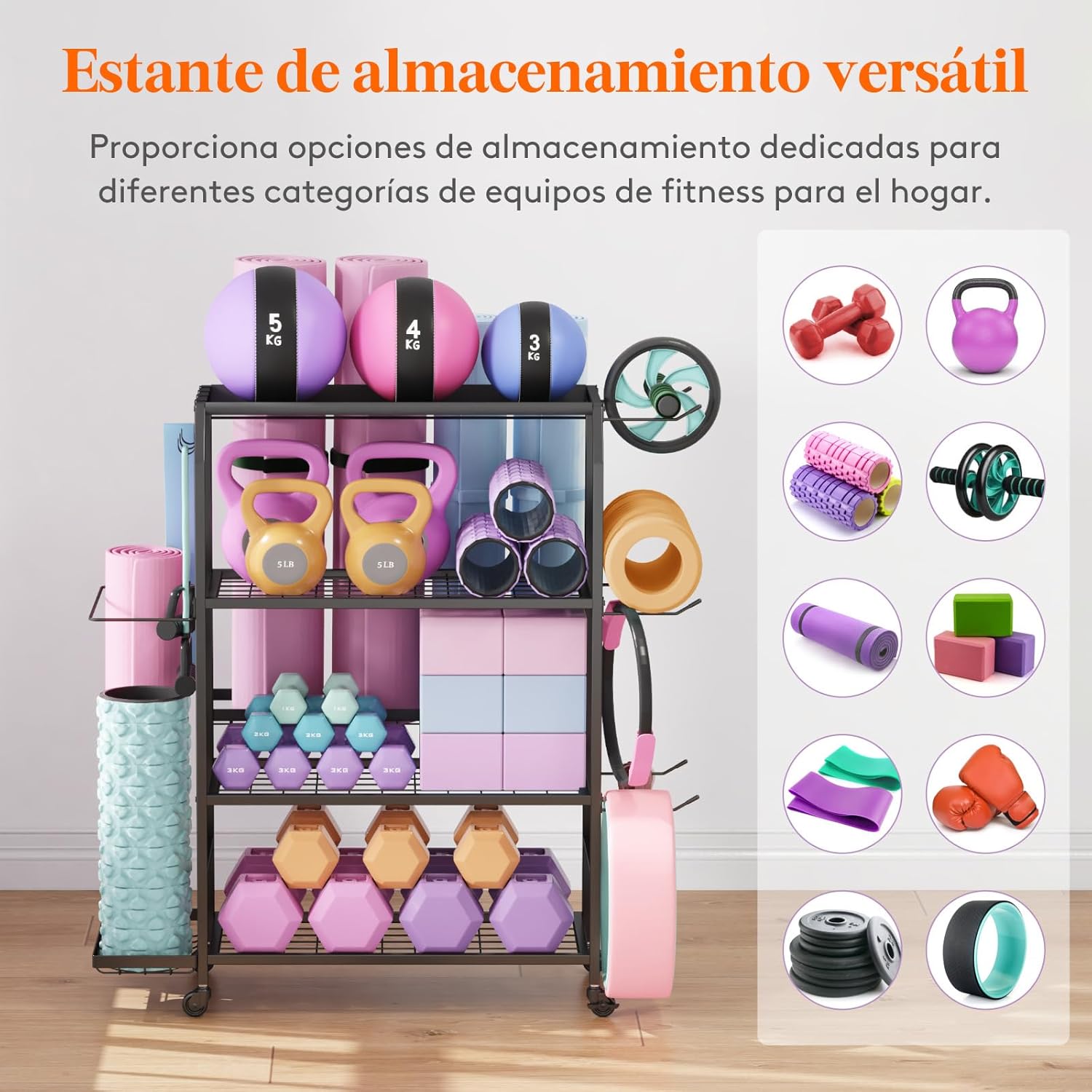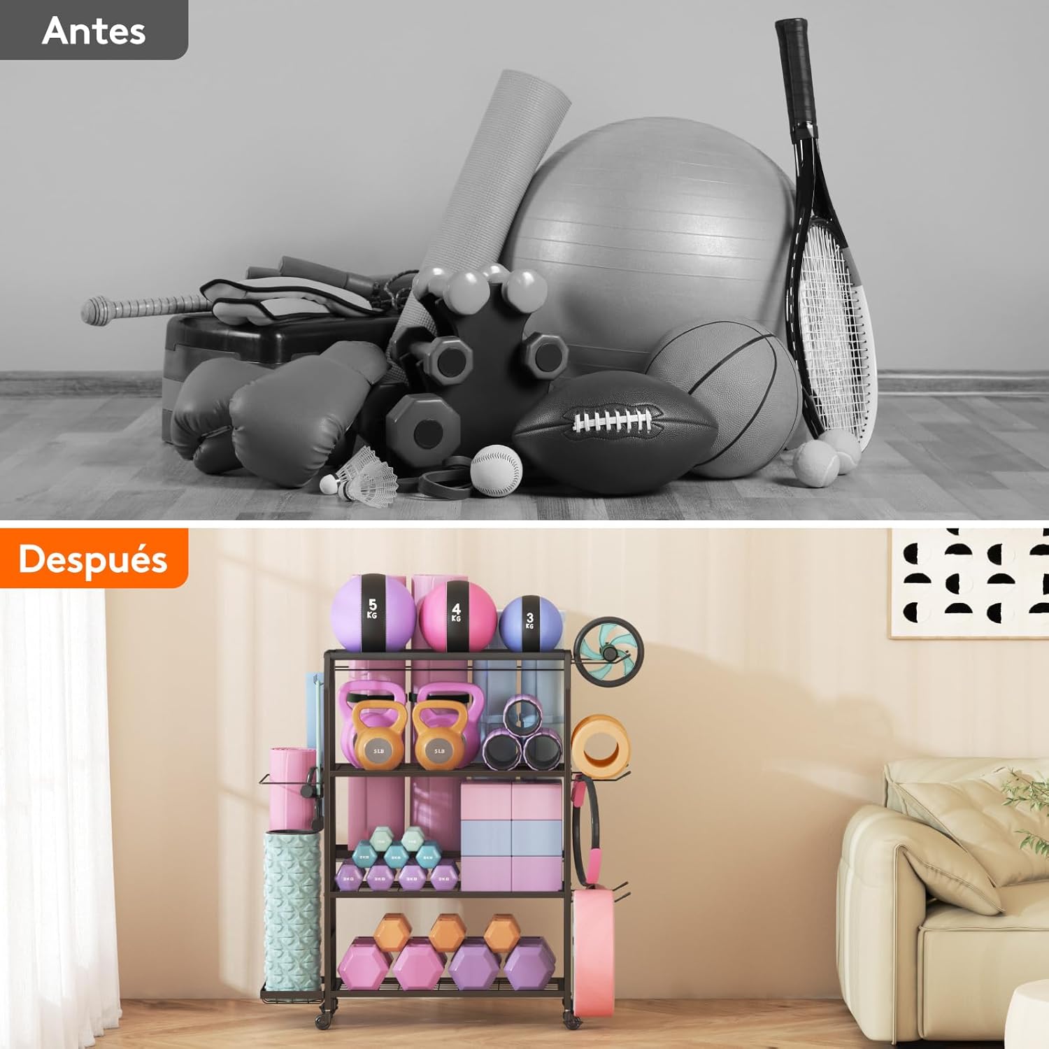 Ideal para gimnasios en casa, estudios de yoga o garajes, este estante de almacenamiento está diseñado para acomodar una amplia gama de equipos de fitness. Desde esterillas de yoga y rodillos de espuma hasta mancuernas, pesas rusas y bandas de resistencia, ofrece un almacenamiento conveniente para todos sus elementos esenciales de ejercicio. Mantenga su equipo de fitness organizado y fácilmente accesible con este estante de almacenamiento multifuncional.