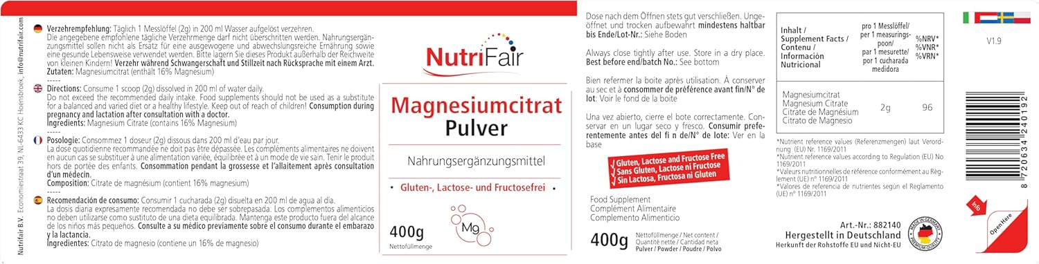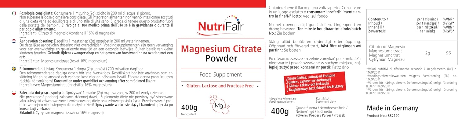 Magnesium Citrate Powder – 400g – Highly Dosed – 100% Vegan – German Production and Laboratory Tests – NutriFair | Premium & Fair
