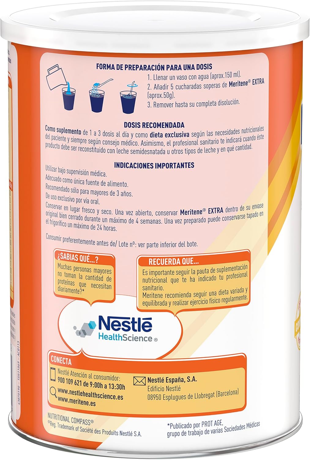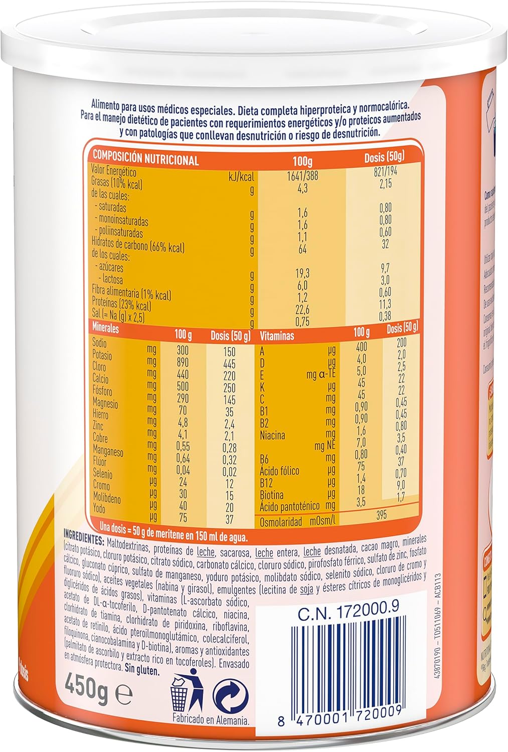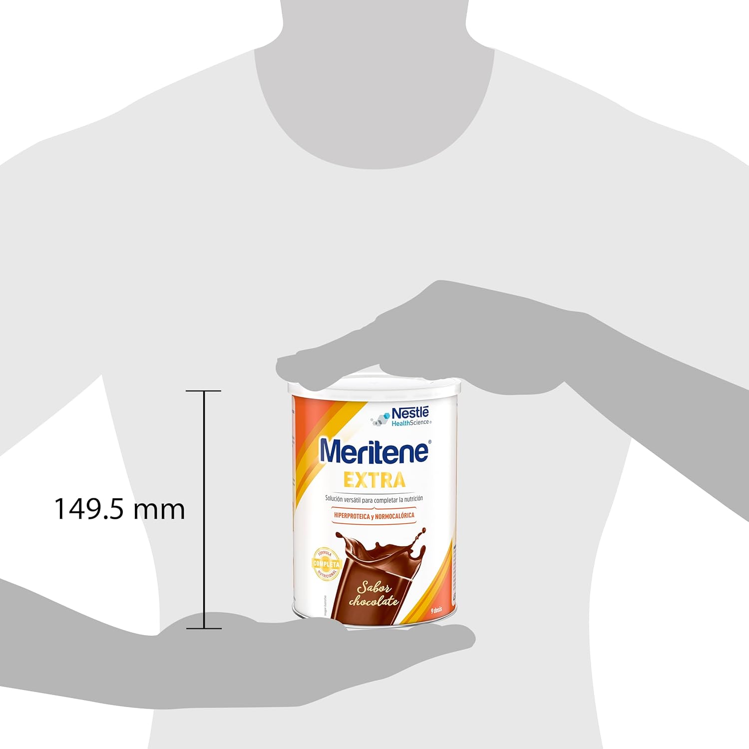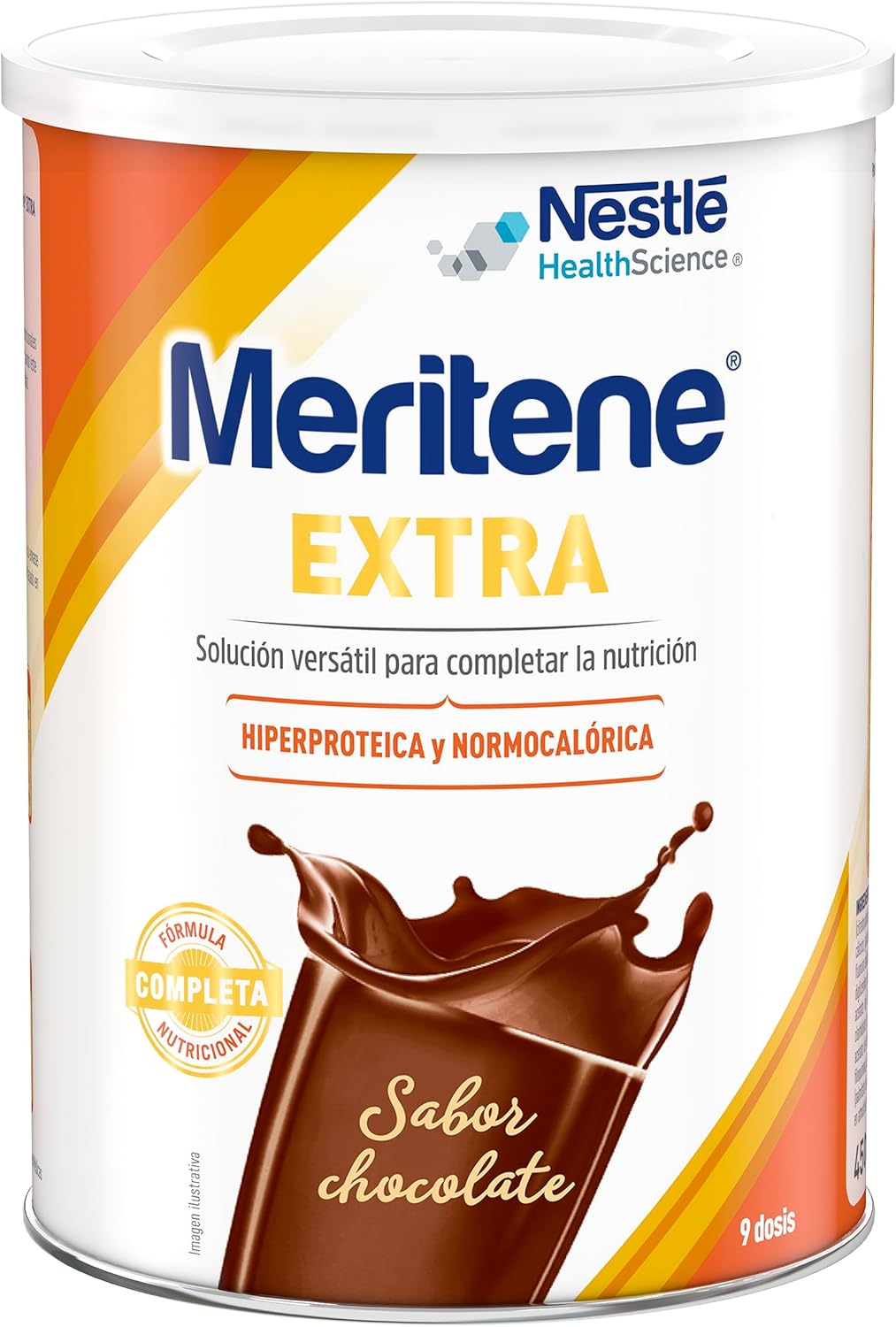 Meritene® EXTRA in delicious chocolate flavor offers a nutritional supplement designed for patients with increased energy and protein needs, as well as for those with pathologies associated with malnutrition or risk thereof. This product, recommended for use under medical supervision, provides a concentrated source of protein and calories, ideal for clinical situations that require an additional supply of nutrients. Presented in a convenient 450g jar, each serving is easily prepared by mixing 50g of the product with 150ml of semi-skimmed milk, either hot or cold. It can be used as a supplement up to 3 times a day, or even as an exclusive diet according to the needs of the patient and medical advice. In addition, its preservation is practical: once opened, the original packaging ensures its freshness for up to 4 weeks, while once prepared, it can be stored in the refrigerator for up to 24 hours. Meritene® EXTRA, a reliable nutritional ally for adults over 3 years of age who require special care.