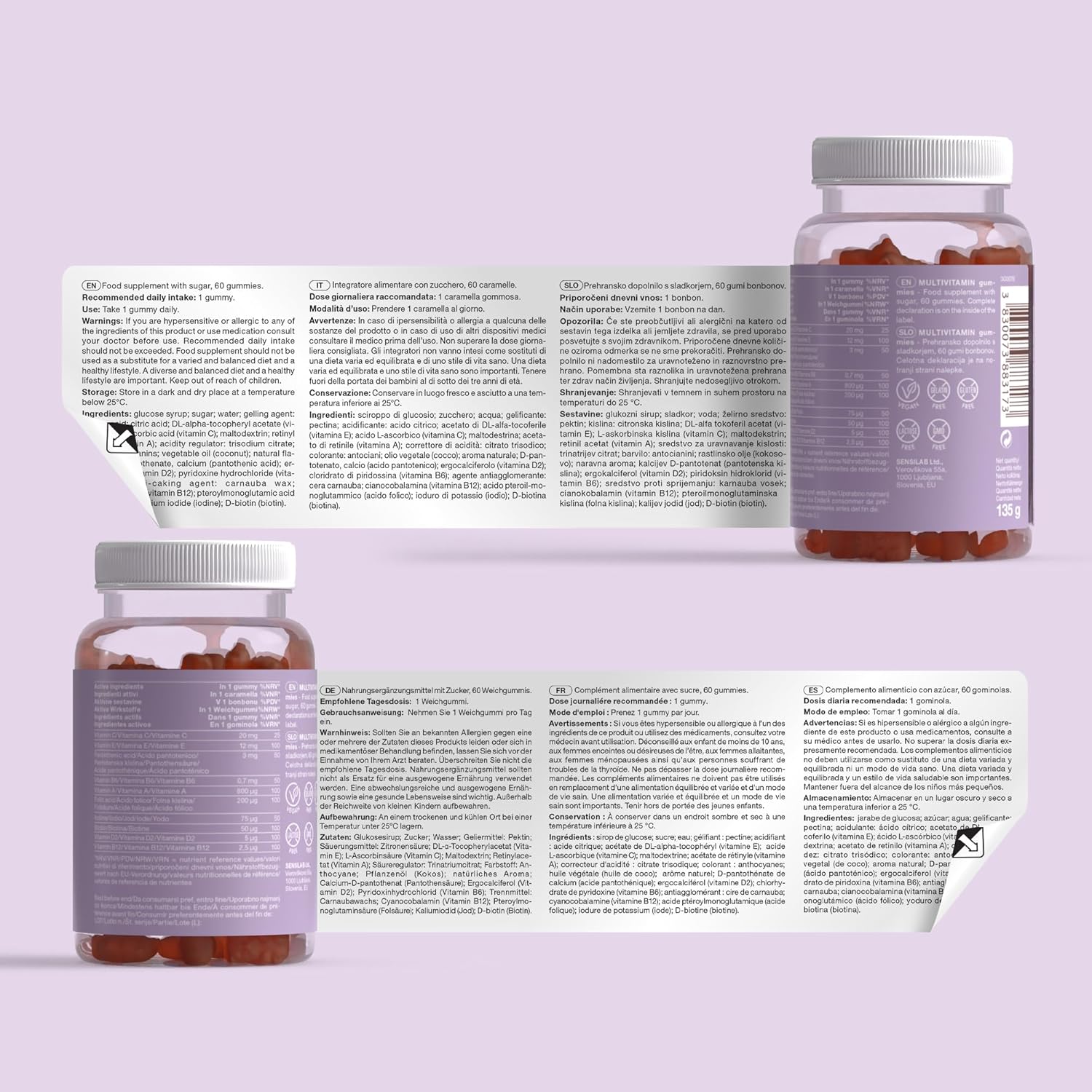 Everything your body needs for a strong immune system in 1 single gummy bear – Vitamin C, Vitamin A, Vitamin E, Vitamin D, Vitamin B6, Vitamin B12, Biotin, Folic Acid, Pantothenic Acid, Iodine.