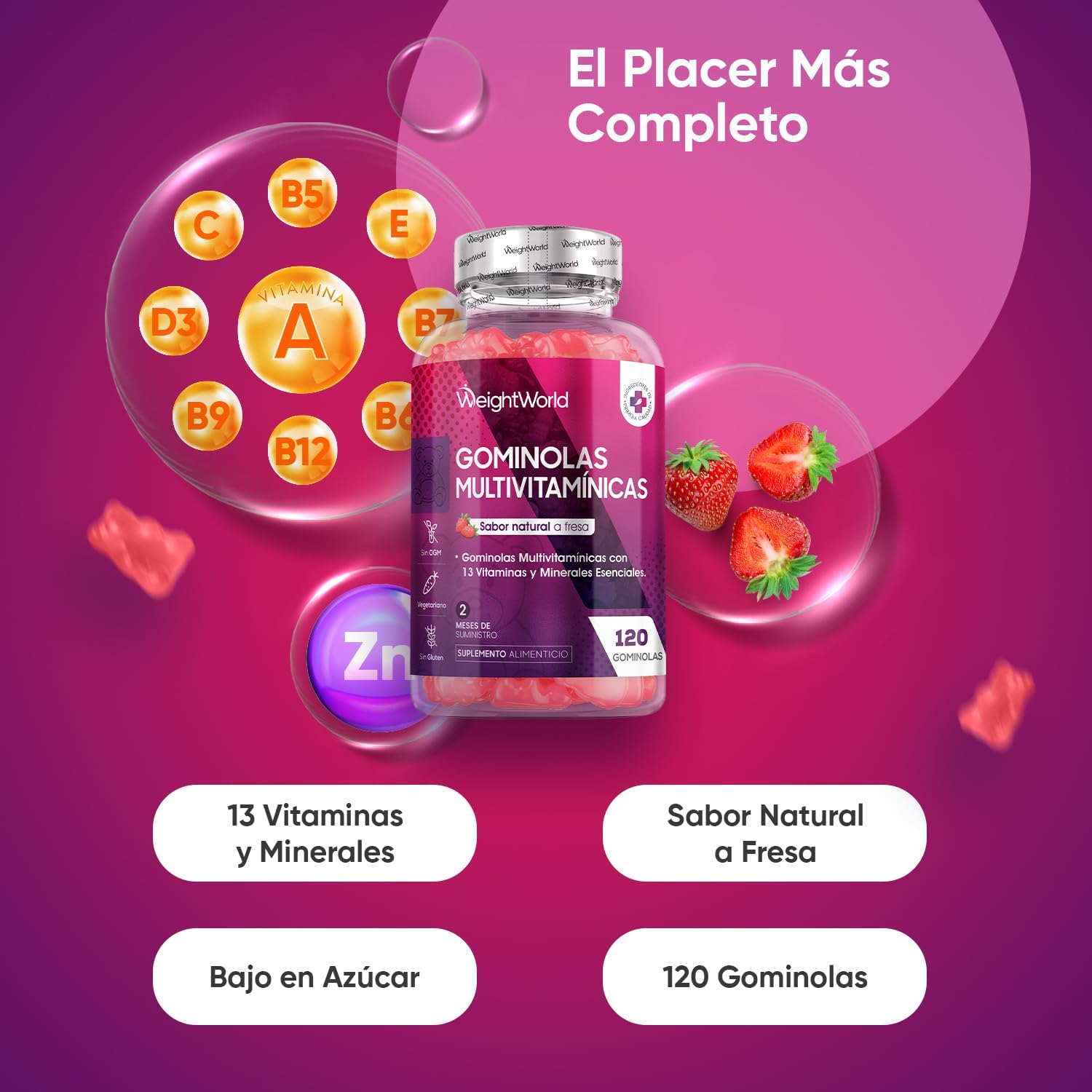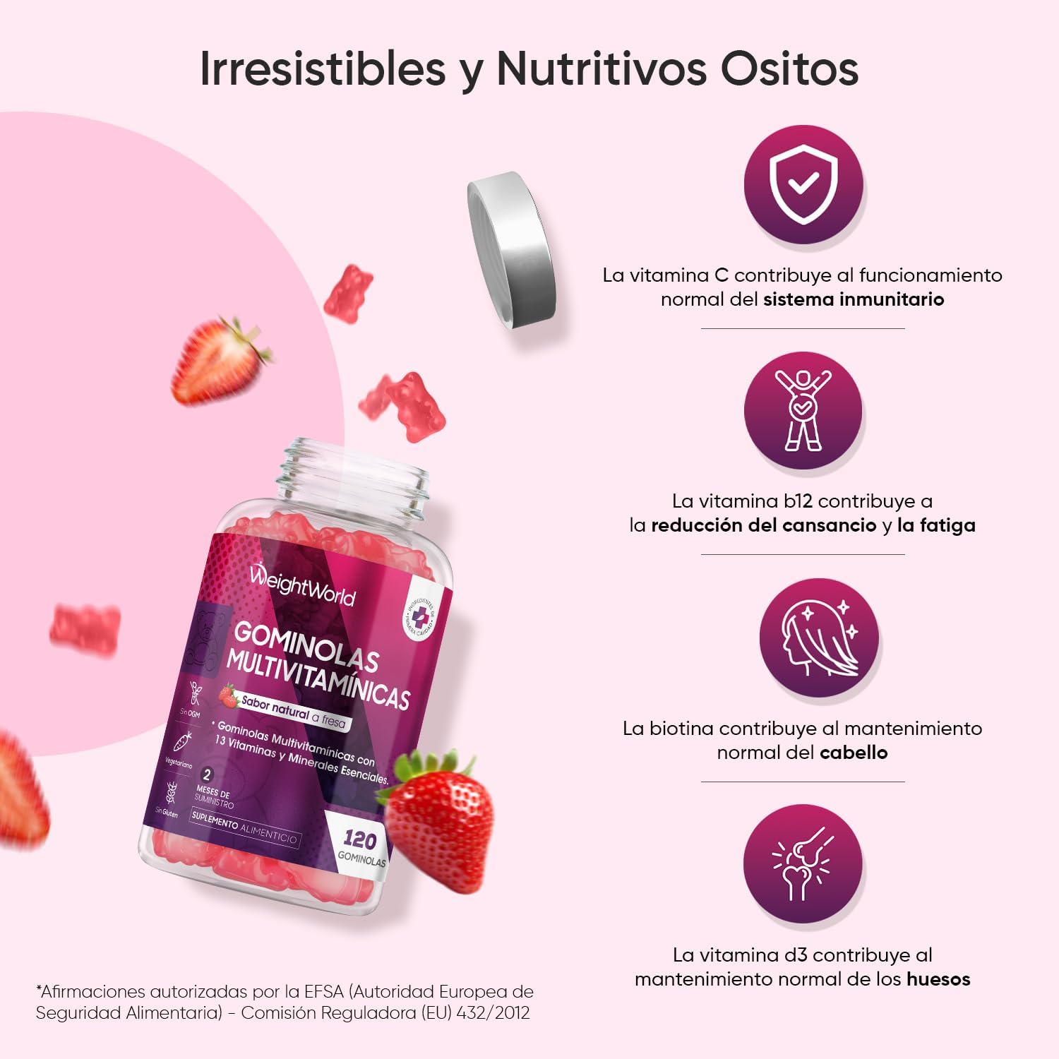 A burst of 13 vitamins and minerals – You start taking them for their irresistible natural strawberry flavor, and end up conquering for their fascinating formula of 13 essential nutrients. Vitamin A, Vitamin C, Vitamin D3, Vitamin E, Vitamin B6, Vitamin B12, Biotin, Folic Acid, Zinc, Choline, Inositol, Iodine, Pantothenic Acid… everything you could ask for and more!