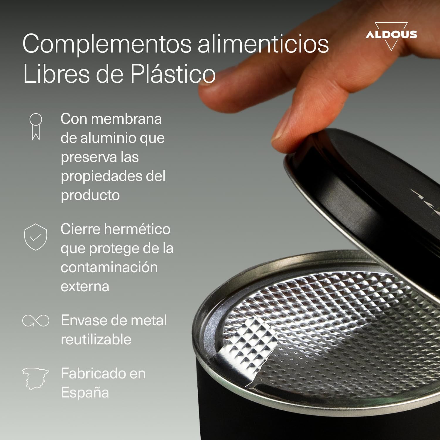 ♻️MULTIVITAMINAS LIBRE DE PLÁSTICO CON ENVASE DE METAL REUTILIZABLE. FABRICADO EN ESPAÑA – Los alimentos envasados en plástico corren el riesgo de que sustancias como el bisfenol A y ftalatos se liberen del envase y contaminen el alimento envasado. Evite ingerir productos en contacto prolongado con plástico. Con los suplementos Aldous evitarás este riesgo ya que no utilizamos plástico y podrás dar una segunda vida a nuestro envase metálico reutilizándolo como más te guste.