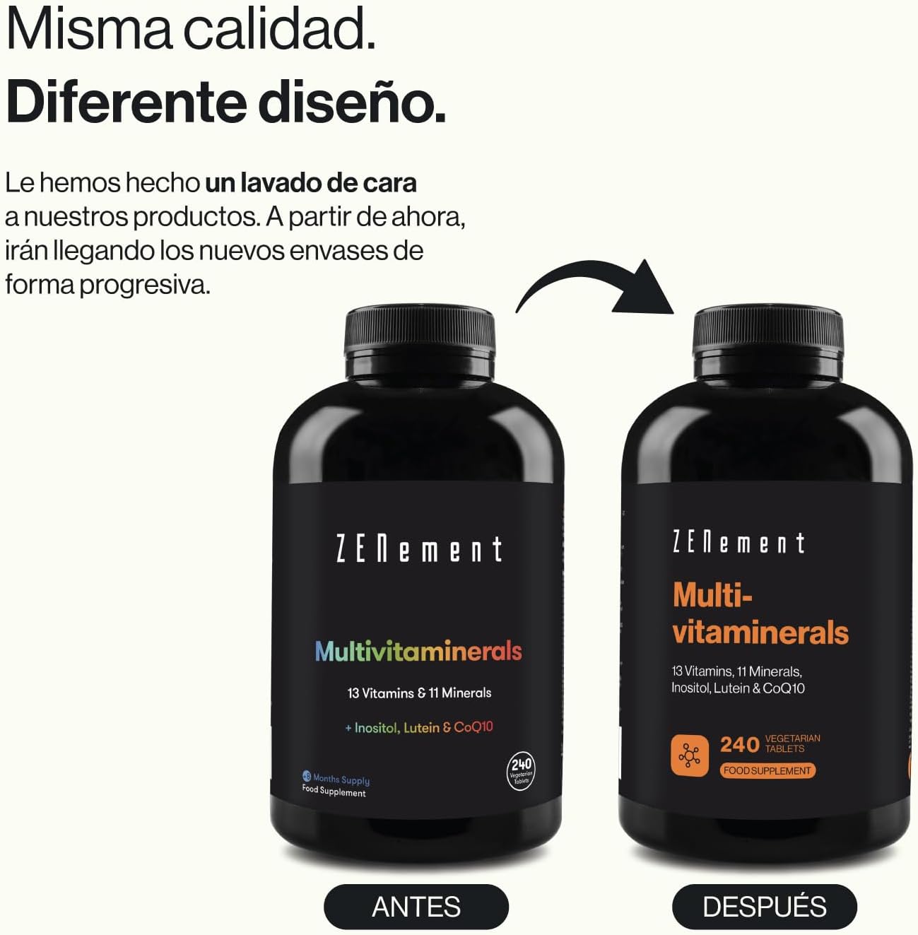 👌 MOST COMPLETE MULTIVITAMIN ON THE MARKET: With just one tablet a day, you will get 29 micronutrients: all Vitamins (A, B1, B2, B3, B5, B6, B7, B9, B12, C, D, E, K), Minerals (Calcium, Chrome, Copper, Iodine, Iron, Lean. nesium, Manganese, Molybdenum, Phosphorus, Potassium, Selenium, Sodium and Zinc) and, unlike other Multivitamins, we have added Inositol, Lutein and Coenzyme Q10, obtaining the most complete formula on the market.