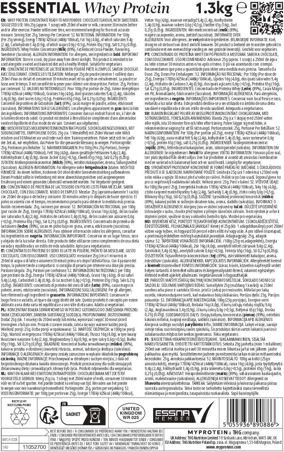 Fuel your fitness goals without compromising your budget with Myprotein Essential Whey Protein, our best value whey protein shake. Designed to support muscle growth, recovery and maintenance of muscle mass. Each serving provides up to 18 grams of high-quality protein, perfect for keeping you on track of your nutritional goals, whether you’re working out, looking to conserve your muscle mass, or simply increasing your daily protein intake. With low sugar content and less than 110 calories per serving, it’s a lightweight and effective choice for those who care for their macronutrients. Plus, it mixes easily with water or milk, achieving a creamy, lump-free shake in seconds. Developed by nutritionists and backed by the #1 brand in the UK, Essential Whey Protein is trusted by over 20 million people worldwide. It is an affordable and effective supplement that fits into any lifestyle, helping you perform at your best every day.