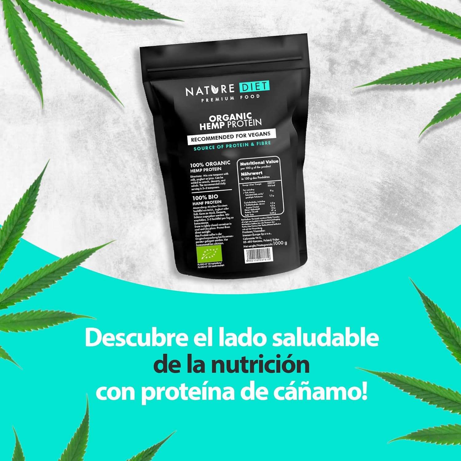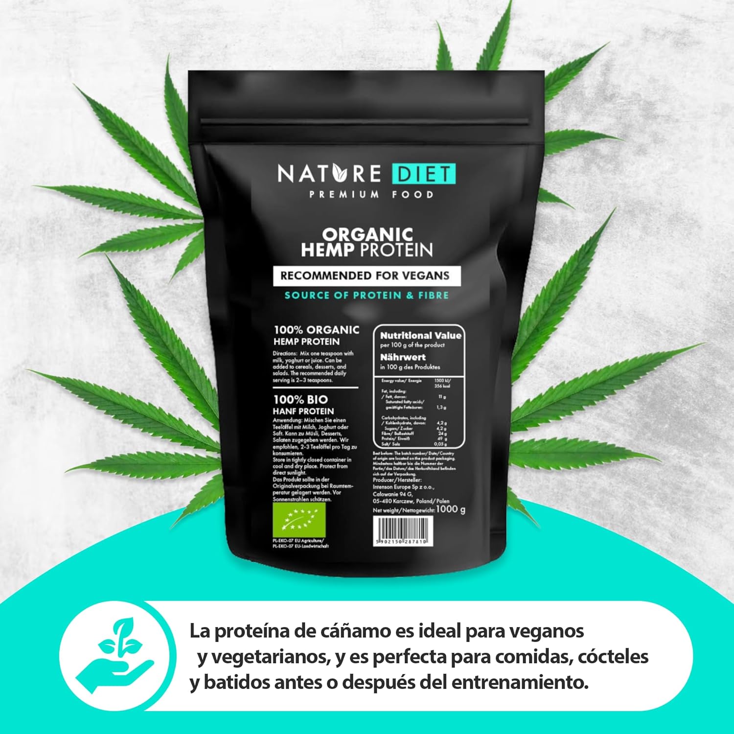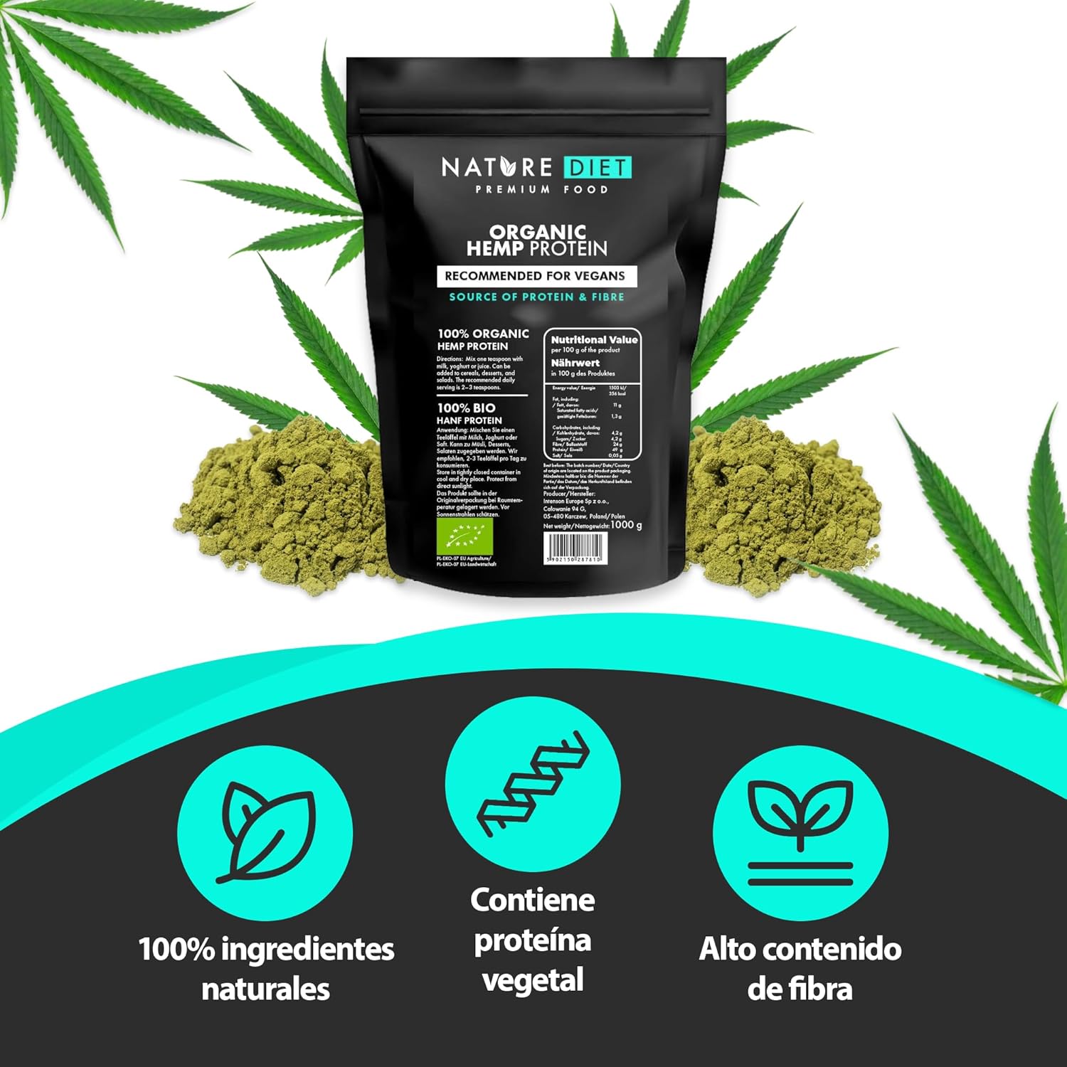 Our hemp protein is healthy and contains all 20 essential amino acids for the proper functioning of the body. It is obtained by cold pressing the seeds of the hemp plant, considered one of the most valuable in the world for its properties. Hemp protein is an excellent choice for vegans and vegetarians, physically active people and those who work or study. In addition, it promotes the muscle building process and provides energy, which translates into a more effective workout. The fiber contained in the protein causes a feeling of satiety, which helps to lose weight. It is widely used in cooking and can be added to various dishes: omelets, oat flakes, muesli or baked goods. Hemp protein is well digestible for everyone. Discover its value and enter health on your menu today.