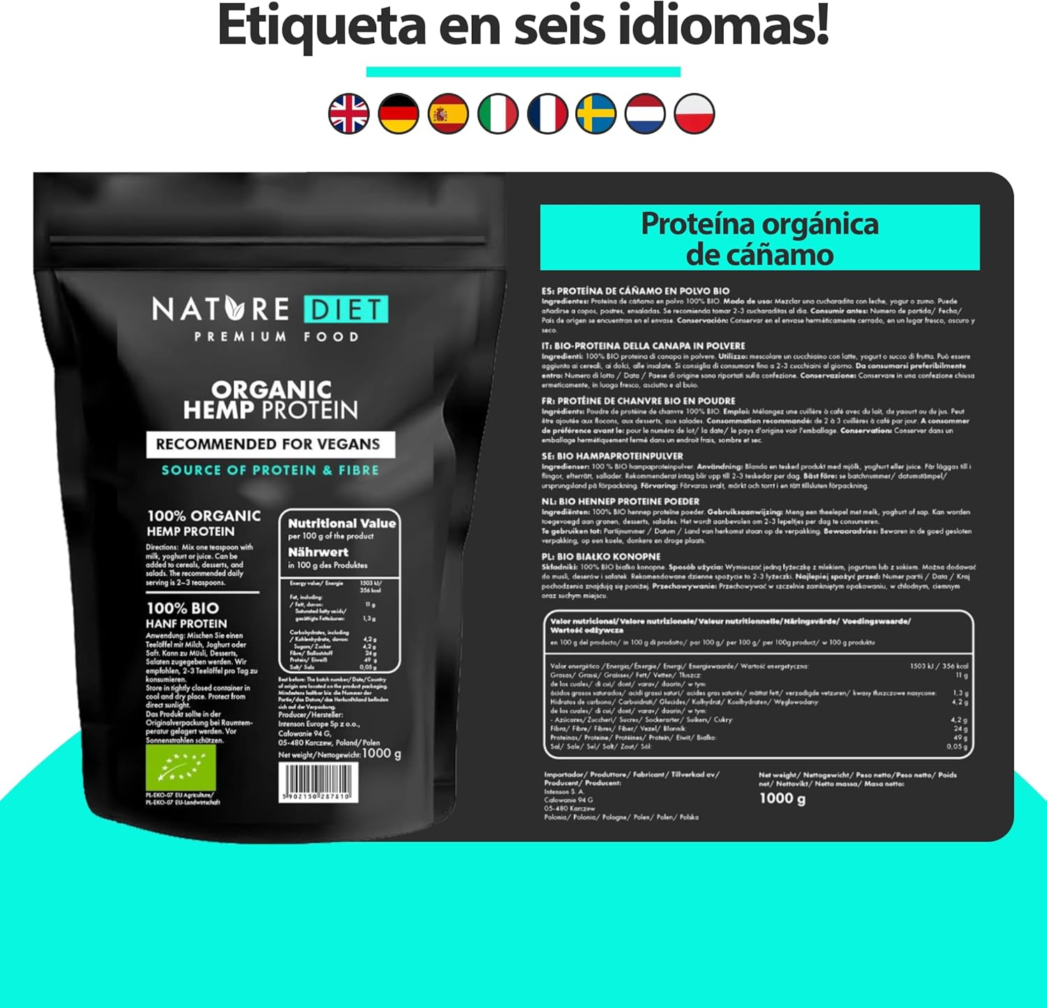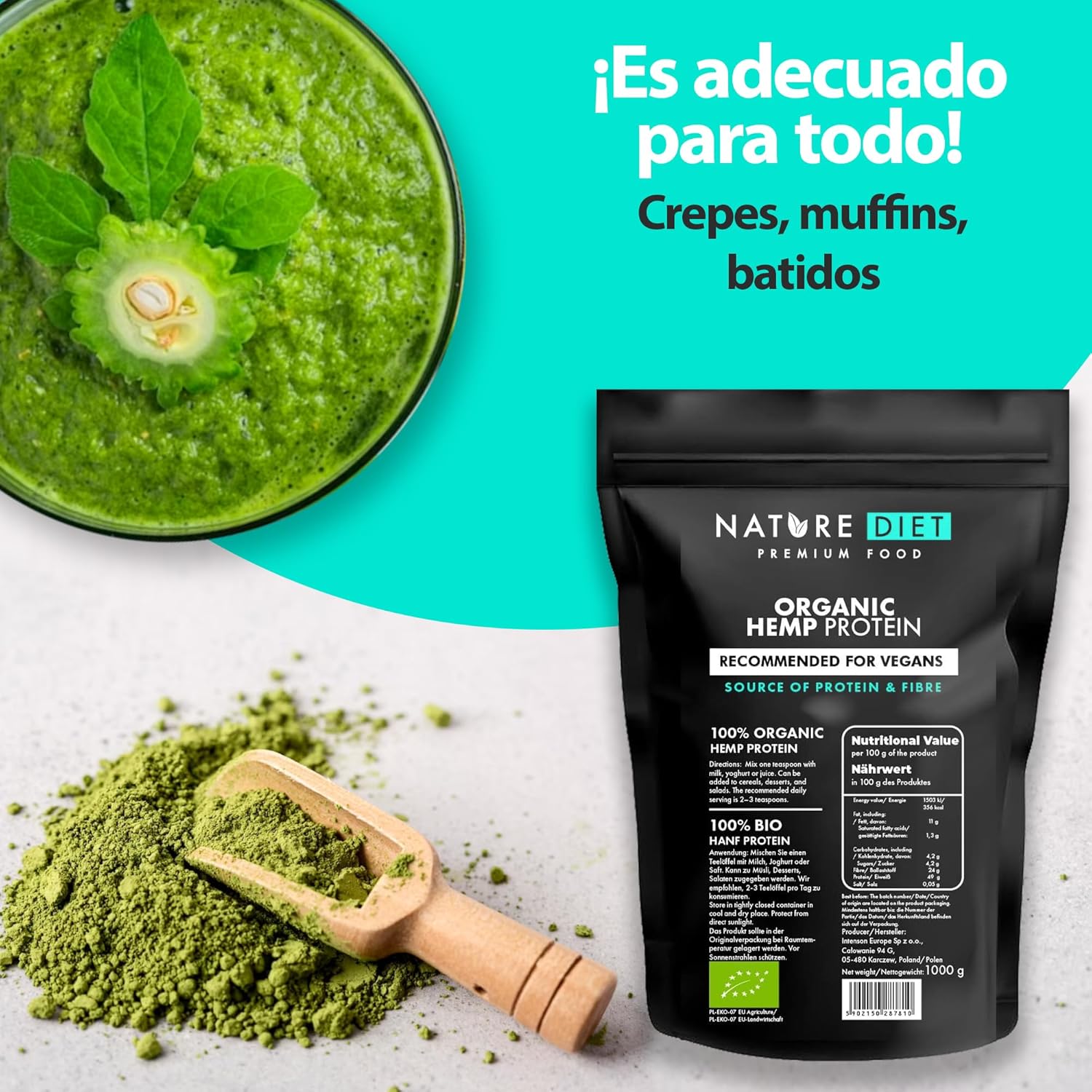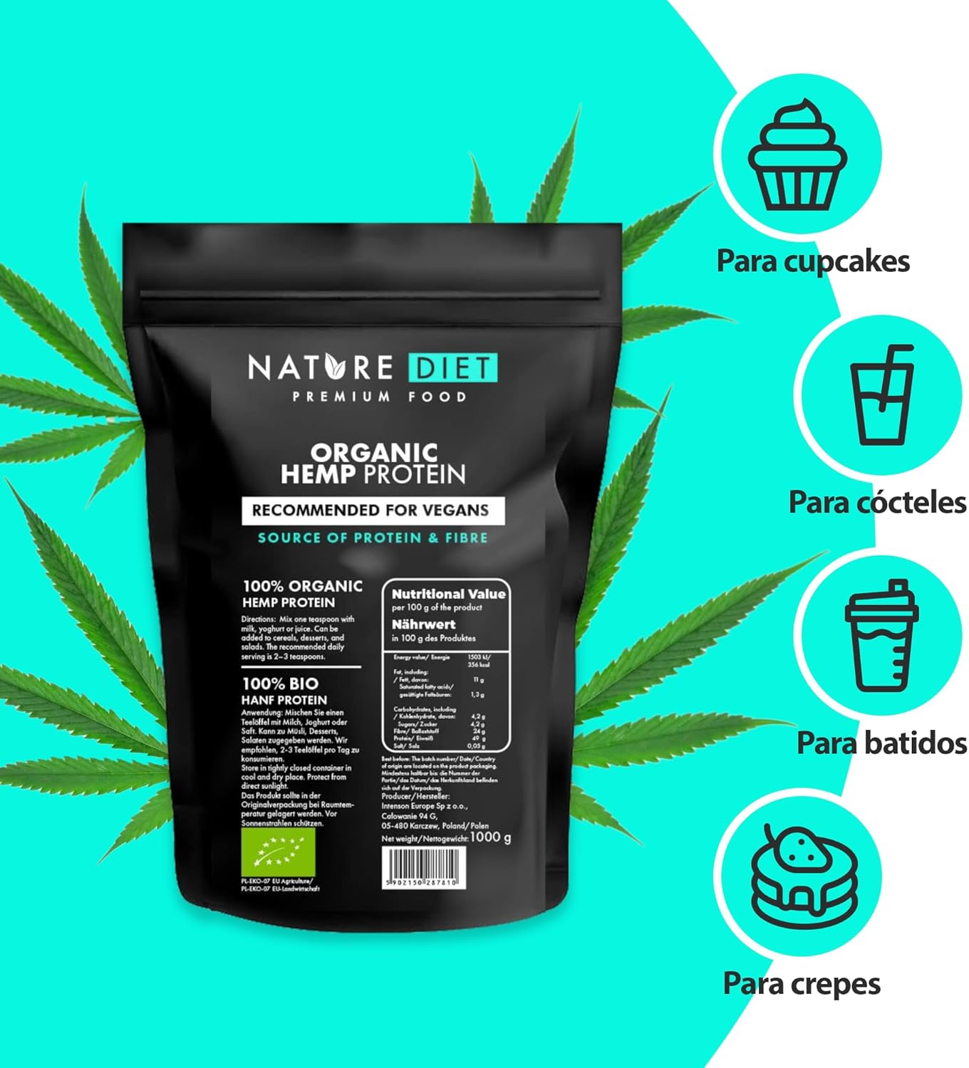 Our hemp protein is healthy and contains all 20 essential amino acids for the proper functioning of the body. It is obtained by cold pressing the seeds of the hemp plant, considered one of the most valuable in the world for its properties. Hemp protein is an excellent choice for vegans and vegetarians, physically active people and those who work or study. In addition, it promotes the muscle building process and provides energy, which translates into a more effective workout. The fiber contained in the protein causes a feeling of satiety, which helps to lose weight. It is widely used in cooking and can be added to various dishes: omelets, oat flakes, muesli or baked goods. Hemp protein is well digestible for everyone. Discover its value and enter health on your menu today.