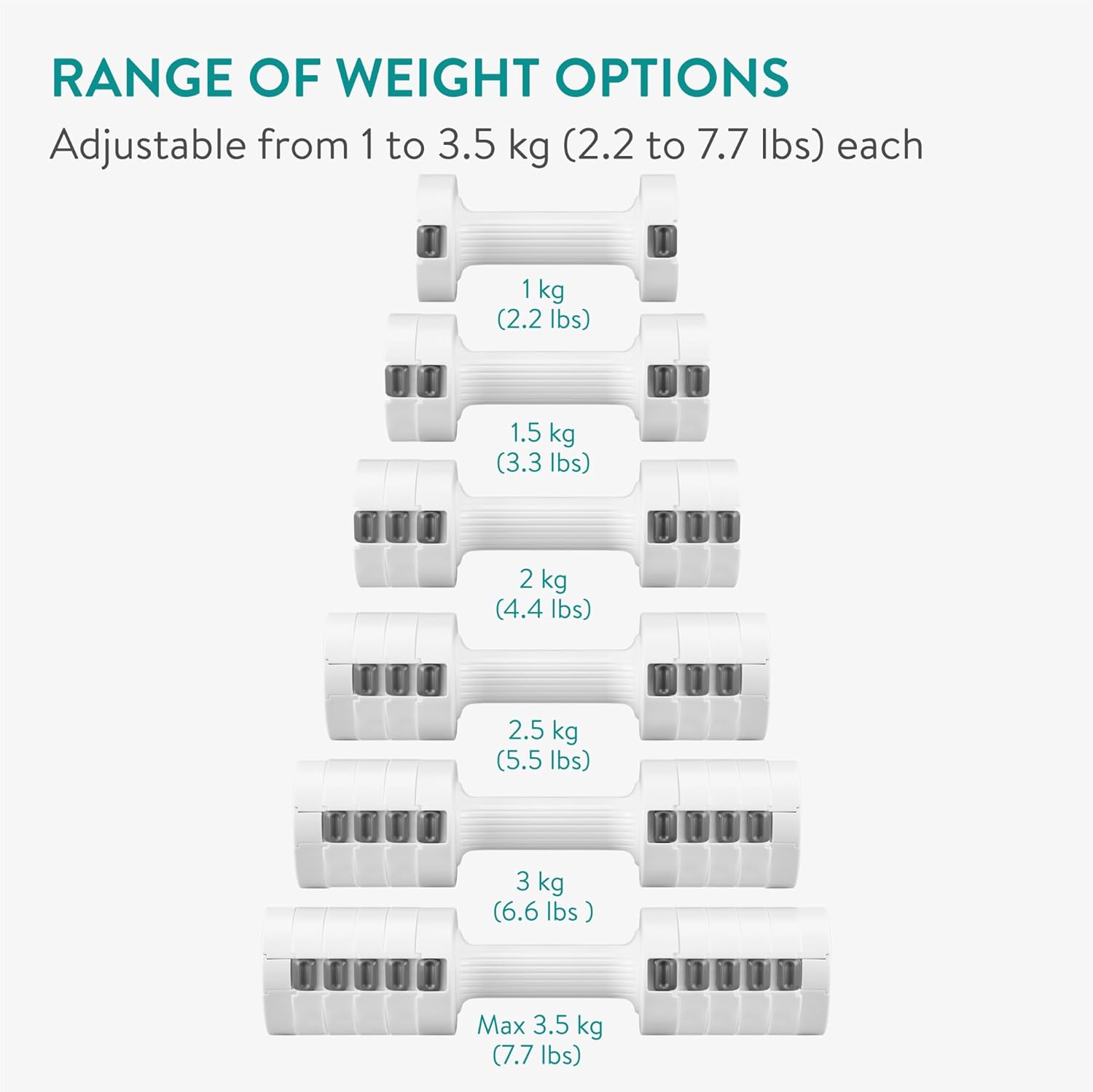 - Maximum weight per dumbbell: 3.5 kg