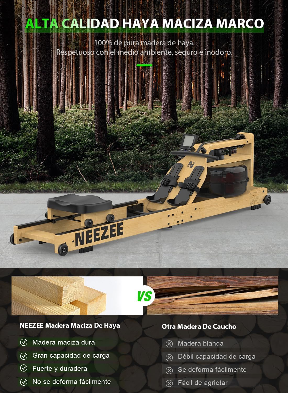 100% SUSTAINABILITY – The Neezee indoor rowing machine is virtually maintenance-free and the premium beech wood frame makes it extremely stable and durable, with a maximum load capacity of 200kg. High-quality aerospace materials improve the water tank resistance to impact, abrasion and corrosion.