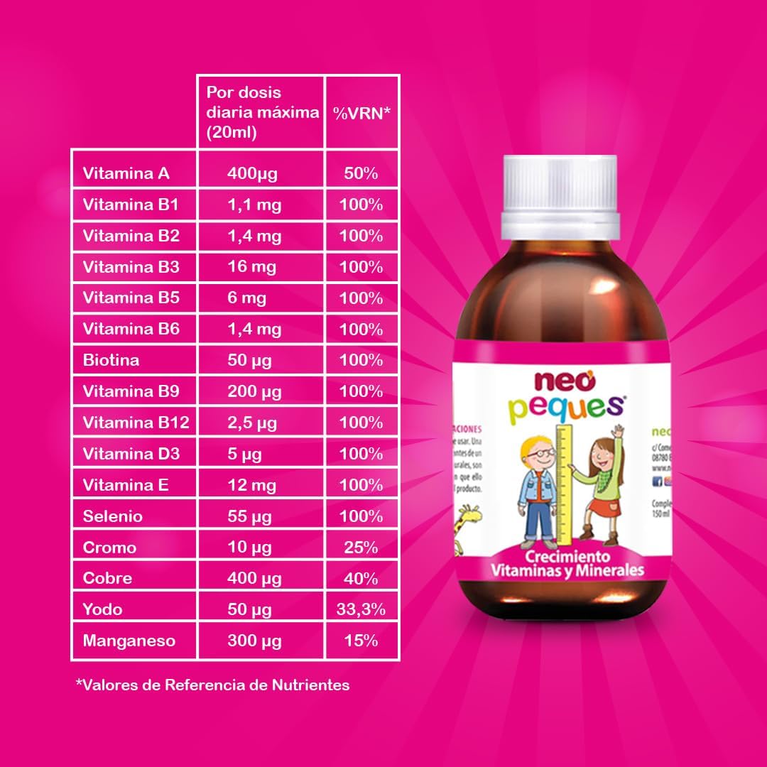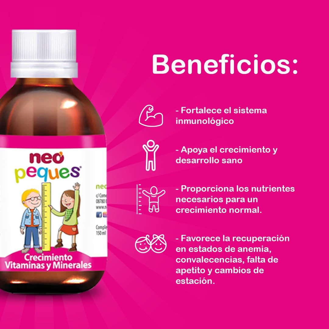 Neo Peques It is the natural option to take care of them in the face of various health circumstances such as colds, lack of appetite; neo Peques always offers a solution for every health problem of children; vitamins and minerals for children with deficits in their diet or for their recovery after convalescences, changes of season or anemias; mainly contains Vitamins, Minerals, Carrot and Spinach.