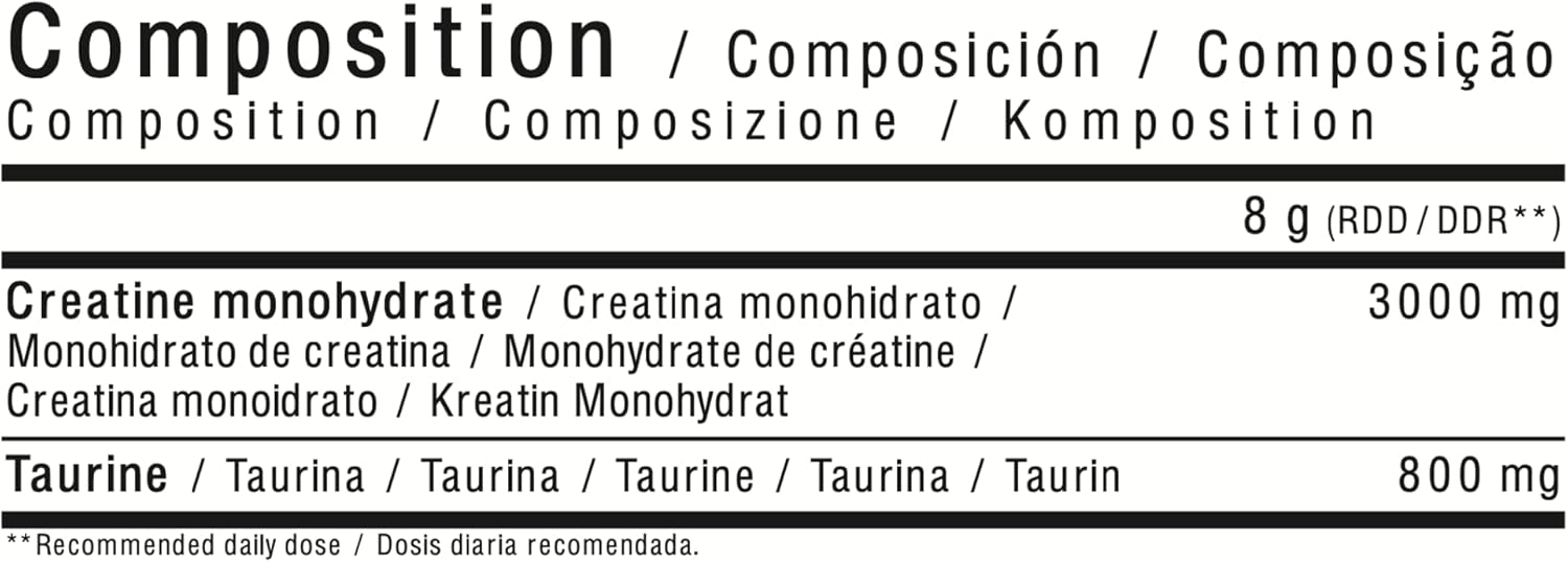 Nuestra increíble creatina monohidratada con sabor, está además reforzada con taurina. Por cada dosis, podrás encontrar 3000 mg de creatina monohidrato y 800 mg de taurina.