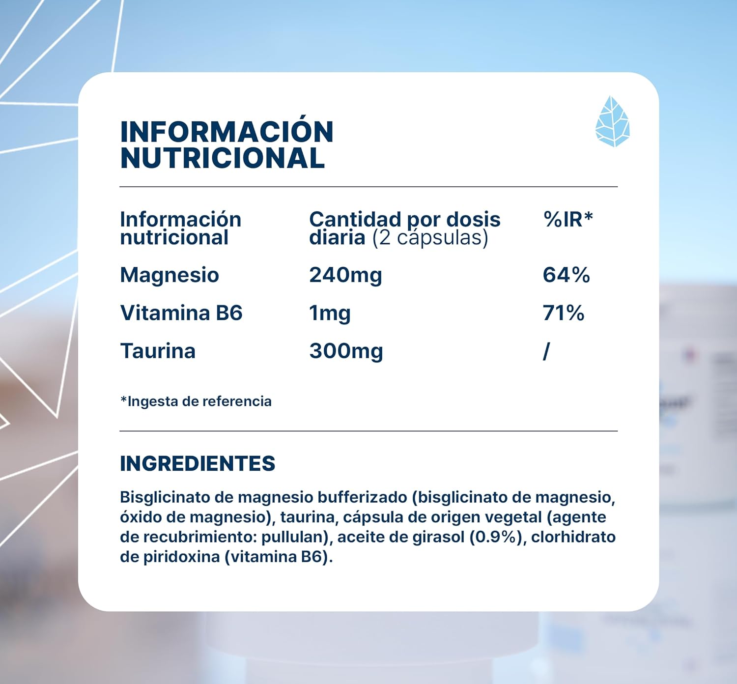 IMPROVE YOUR MENTAL AND PHYSICAL CONDITION A state-of-the-art dietary supplement containing magnesium bisglycinate, the best combination of bioavailability and magnesium concentration. Cell absorption is facilitated by vitamin B6 and taurine. Magnesium Taurine B6 acts as a muscle and cellular relaxant, without stimulating effects.