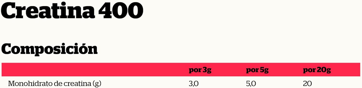 FLEXIBLE USE AND COMFORTABLE FORMAT FOR YOUR DAY TO DAY Available in a practical 400g bottle with dispenser included, Creatine 400 is designed for easy and comfortable consumption. It is recommended to take between 3 and 5 grams a day, dissolved in water, juice or a protein shake, ideally before and/or after training. Its fine, crystalline powder texture allows for quick mixing without lumps, adapting to your daily routine without hassle.