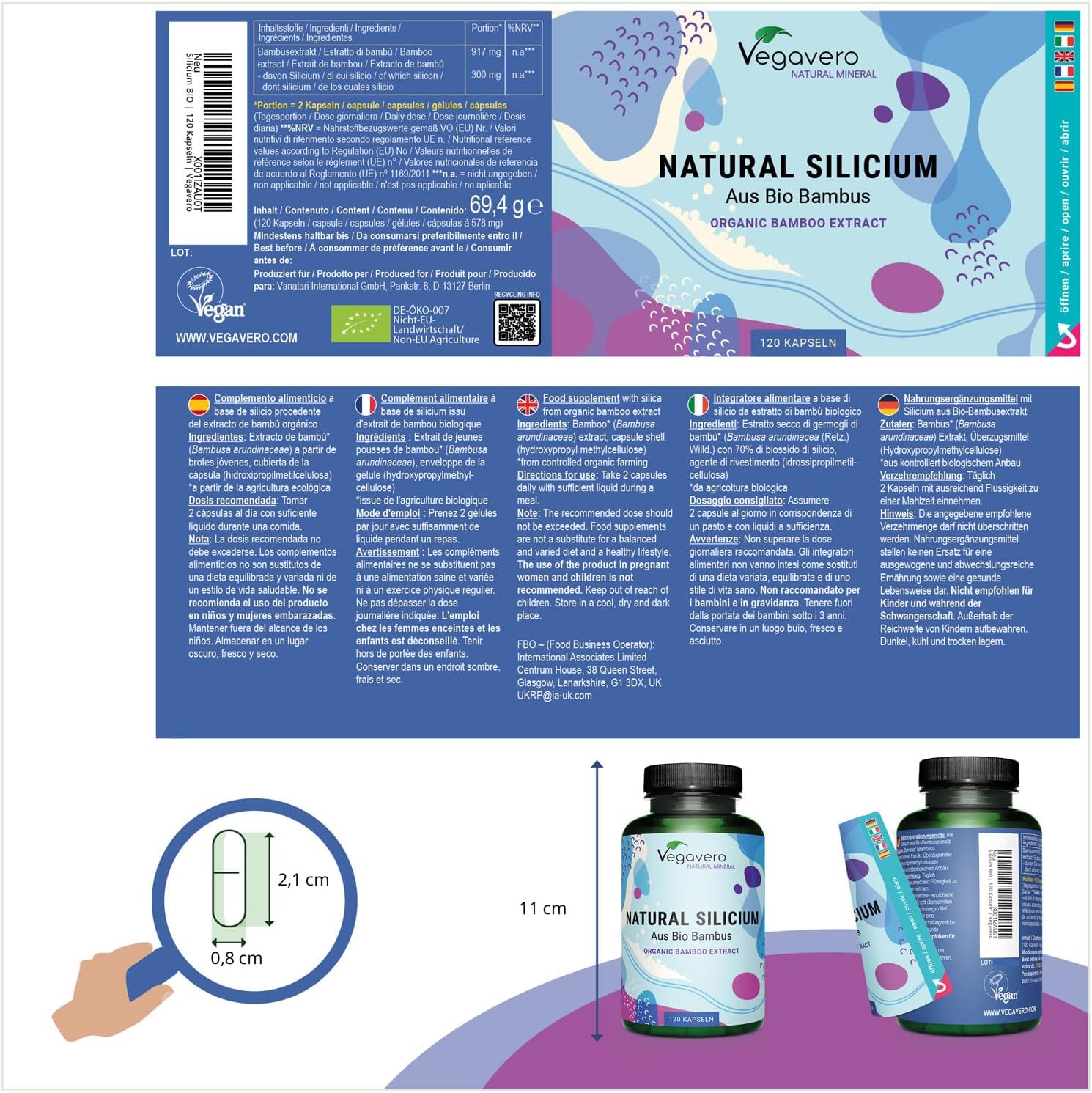 ✅ NO ADDITIVES: Two pills of our food supplement contains 300mg of silicon, extracted from 920mg of organic bamboo. Of course, our product contains no GMOs, no additives, and is suitable for vegans. Per container: 120 capsules. Recommended dose: 2 capsules per day.