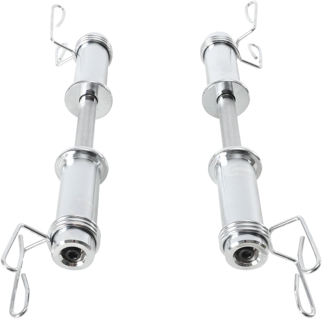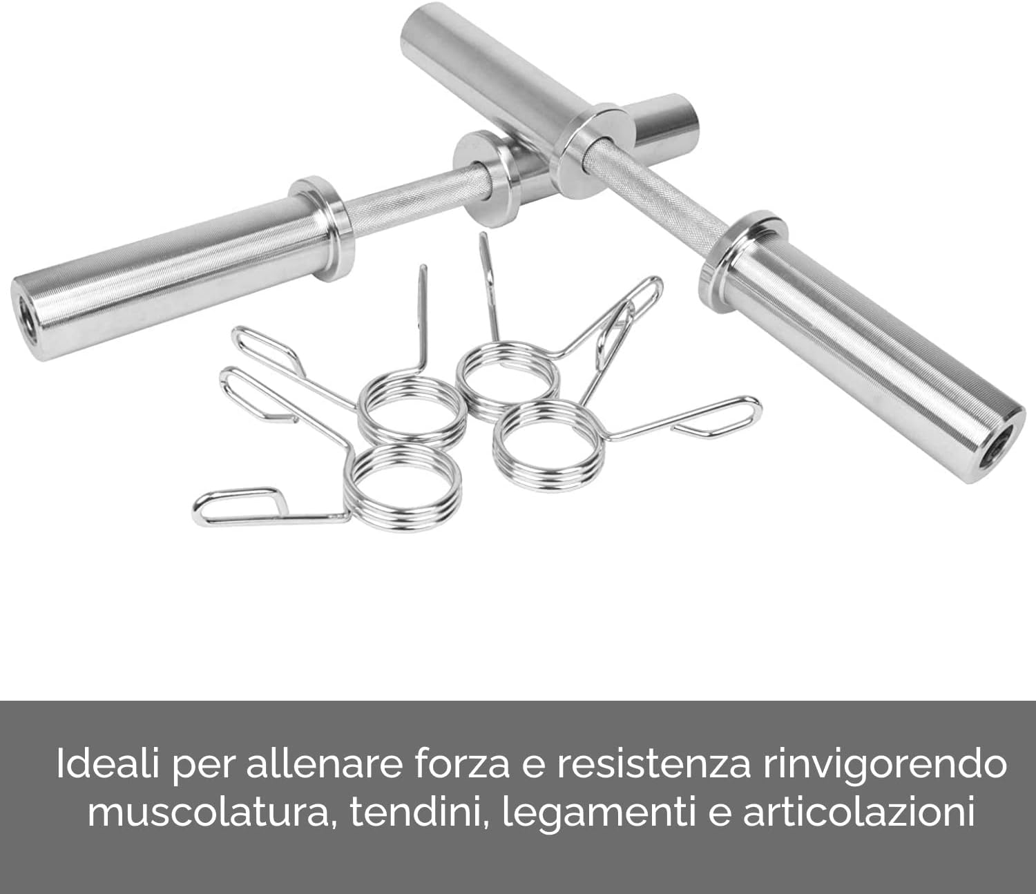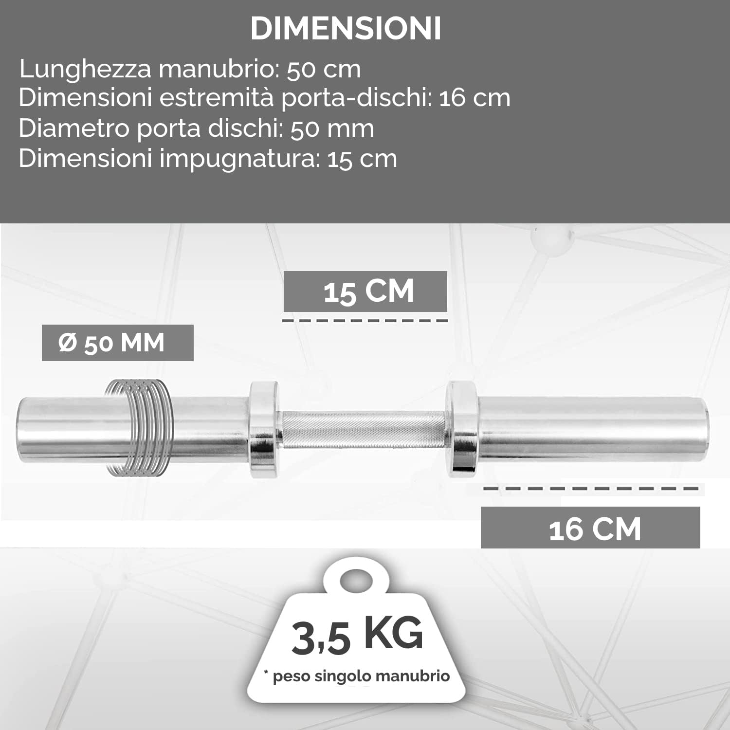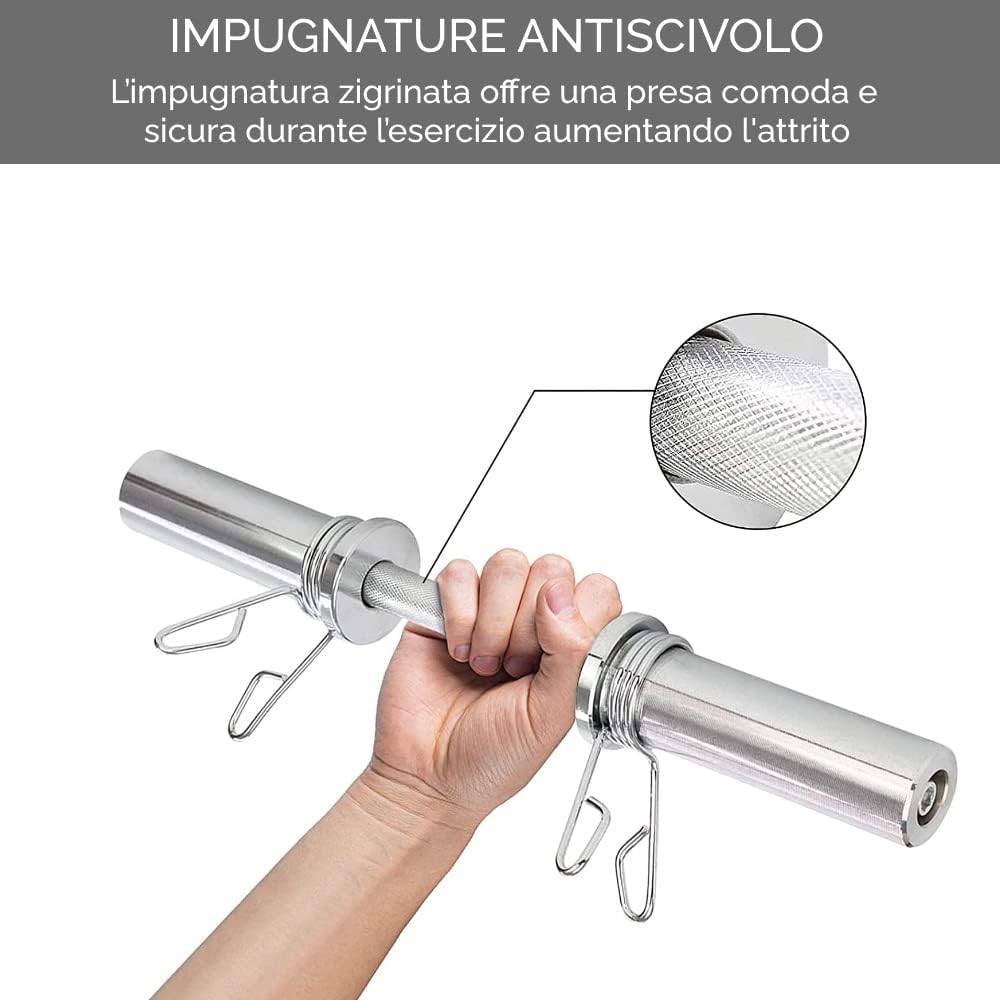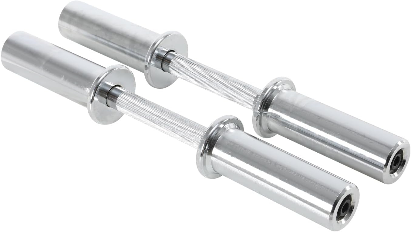 ✅ The set consists of 2 dumbbells with a length of 50 cm and a diameter of 50 mm, so they are suitable for discs or bumpers with a 50 mm hole. Loading ends are 16cm long each. Bars made of chrome-plated steel extremely resistant to wear and tear and external agents such as water, sun and sweat