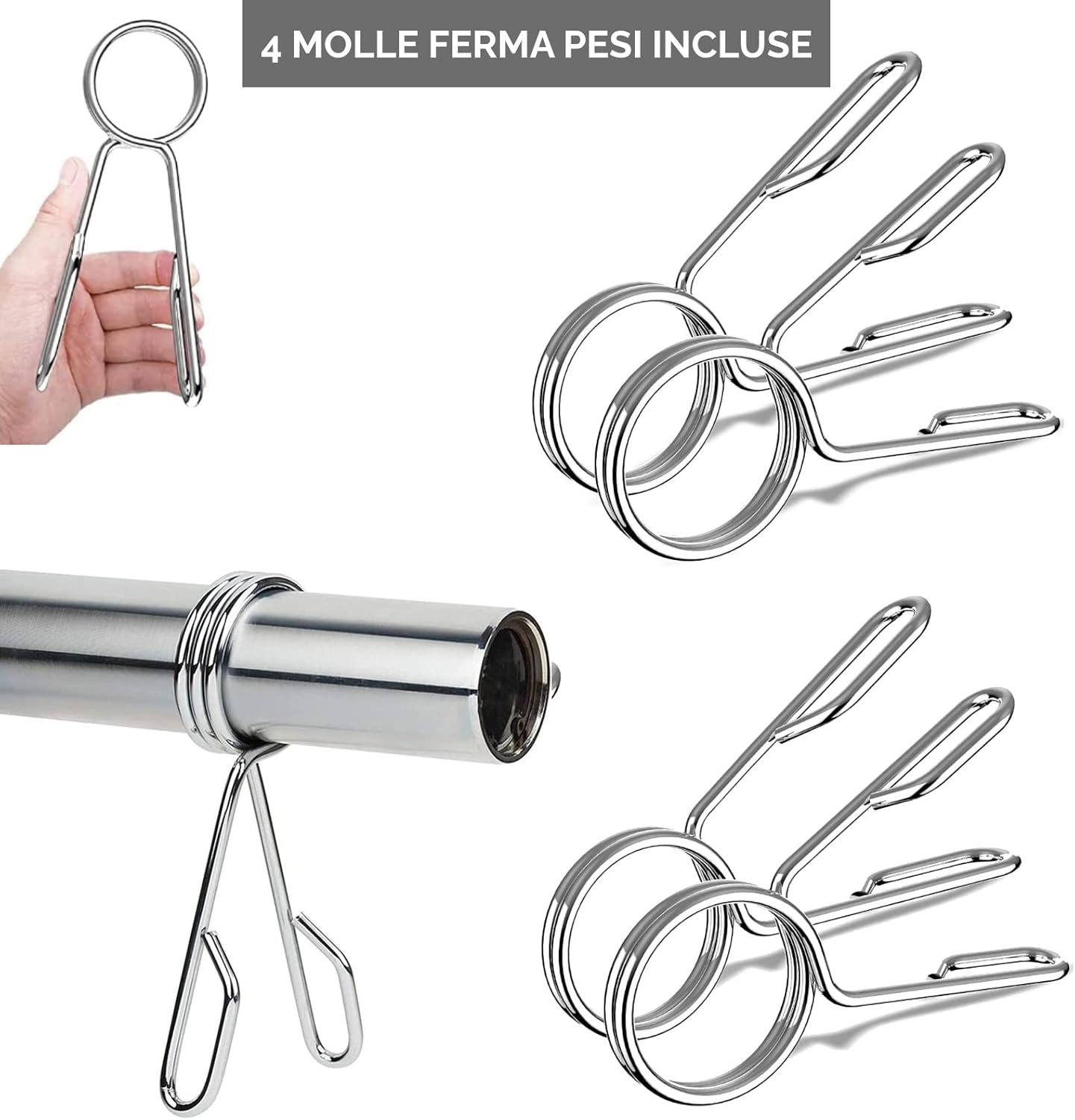 ✅ 4 spring locks included, made of high quality steel. Extremely sturdy and compact, they are designed to provide a firm grip to the bar, helping you handle the weight firmly and steadily, reducing the chance of accidents during weightlifting