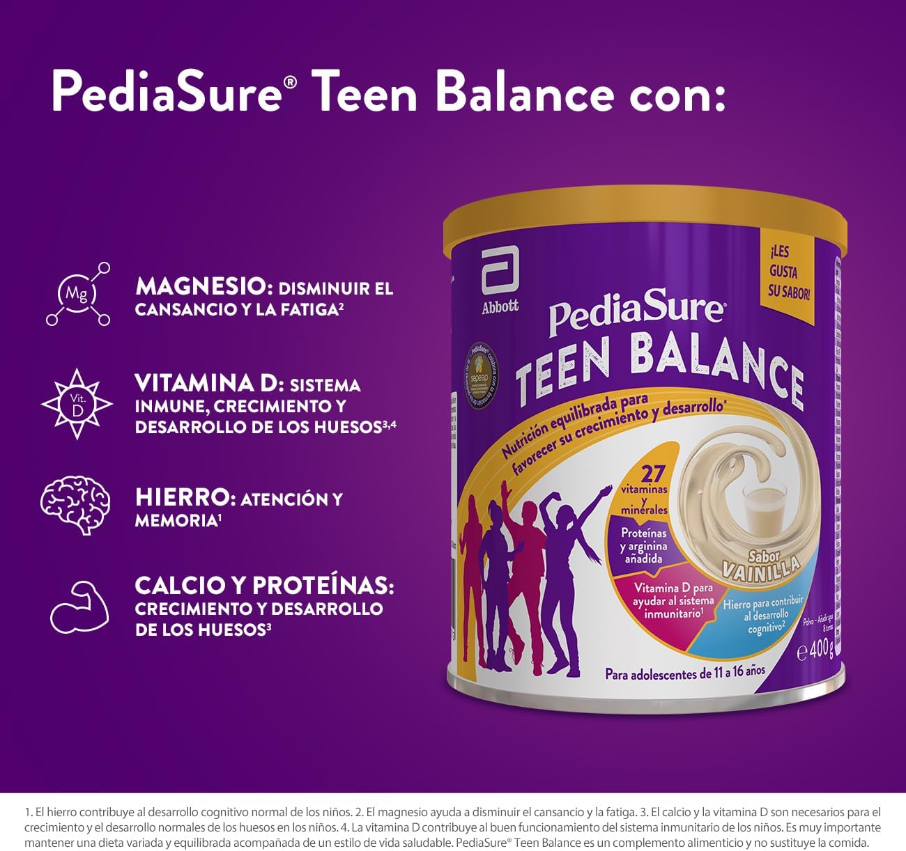 ENERGY – PediaSure Teen Balance provides protein, arginine, 27 vitamins and minerals including magnesium, which helps you face the day to day with energy. (2)