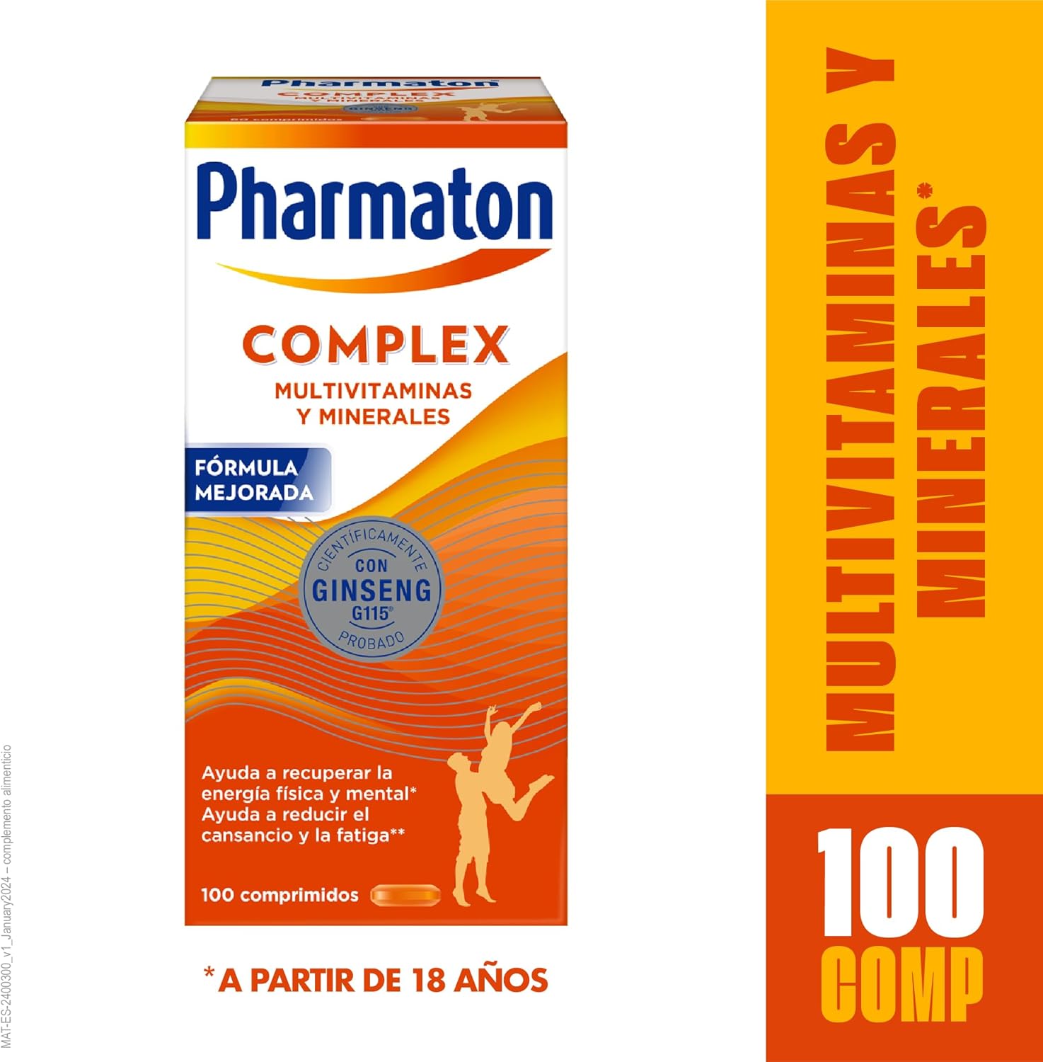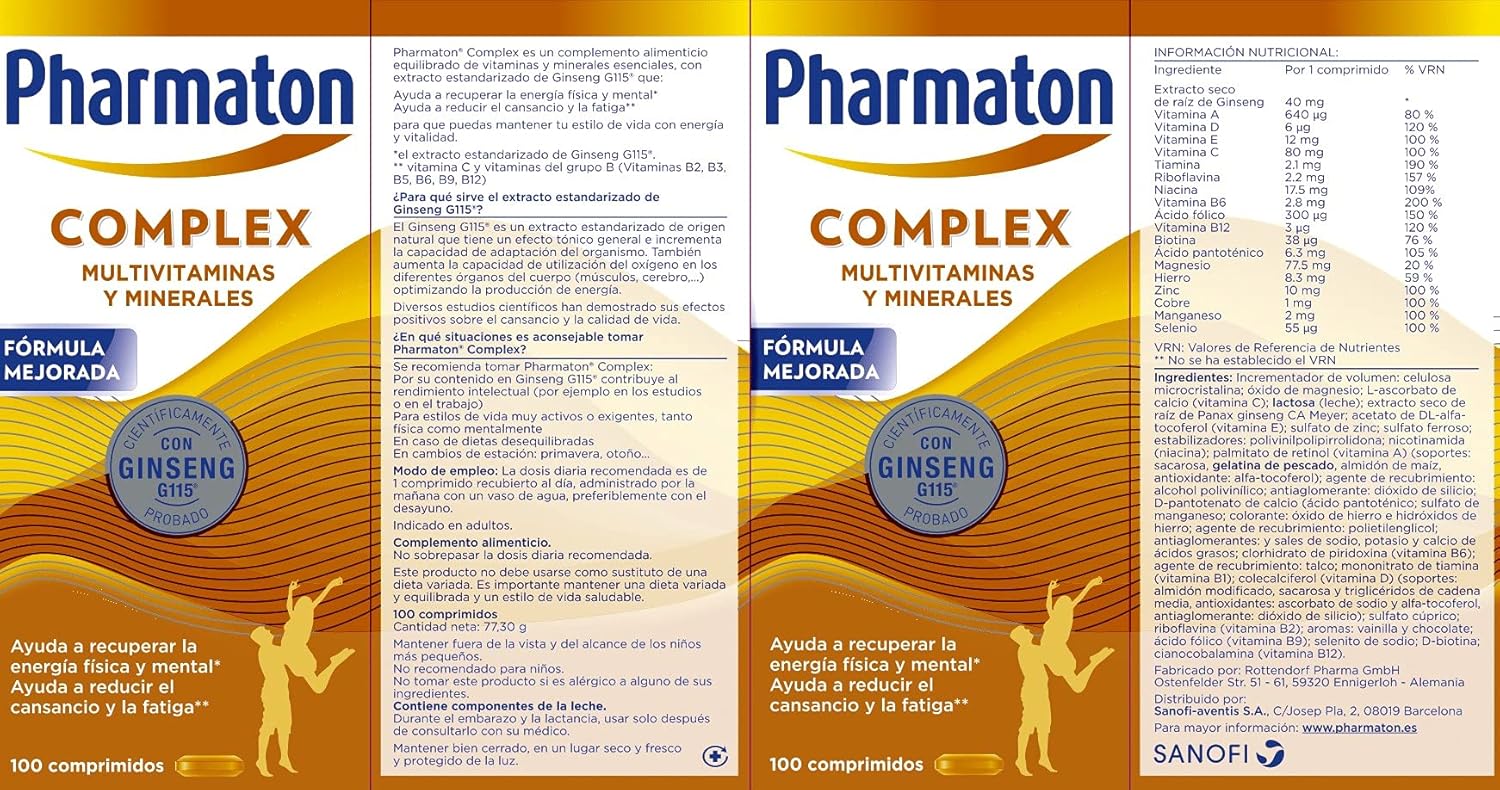 Pharmaton Complex is the only multivitamin complex containing Ginseng G115. The standardized extract of Ginseng G115, of 100% natural origin, gives you the energy you need and provides you with greater physical and mental well-being to face the challenges of your day to day. Its exclusive formula with Ginseng G115 and B vitamins helps you maintain physical and mental performance, good cognitive performance and reduce fatigue. So you can feel more vital and energetic all day. Various scientific studies have shown its positive effects on tiredness and quality of life. Pharmaton Complex, the energy your day asks! Pharmaton Complex is available in packs of 30, 60, 100, 200 easy-to-swallow coated tablets.