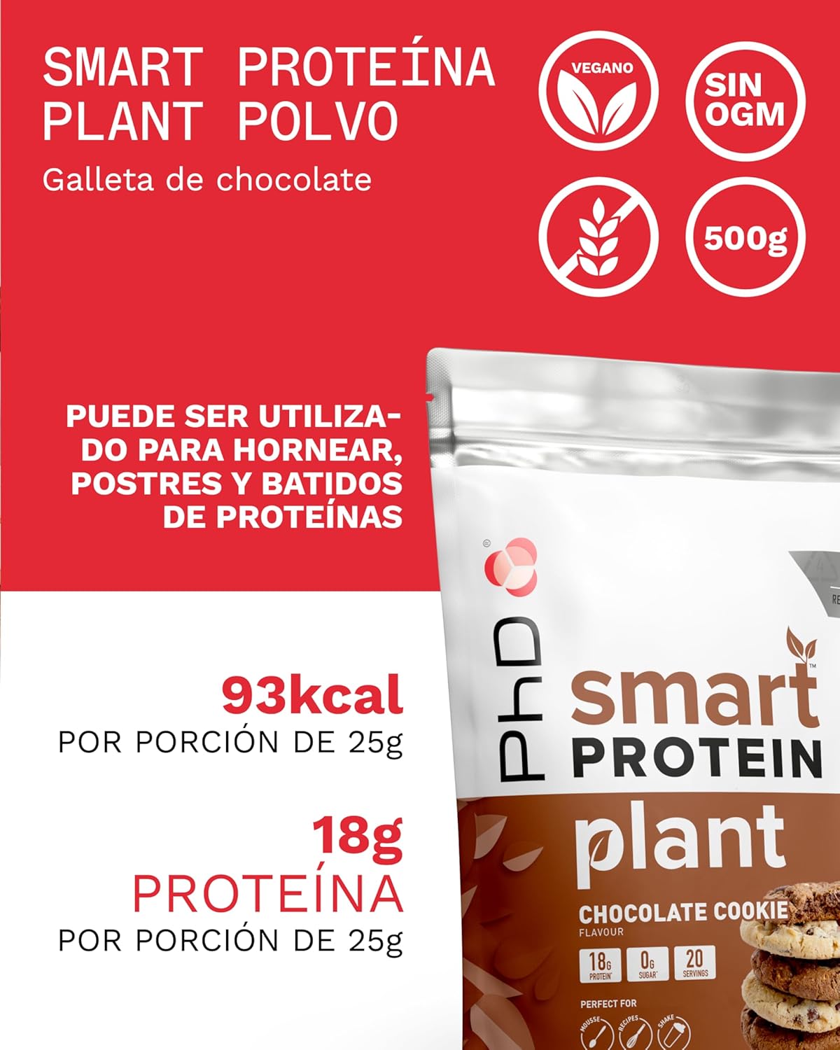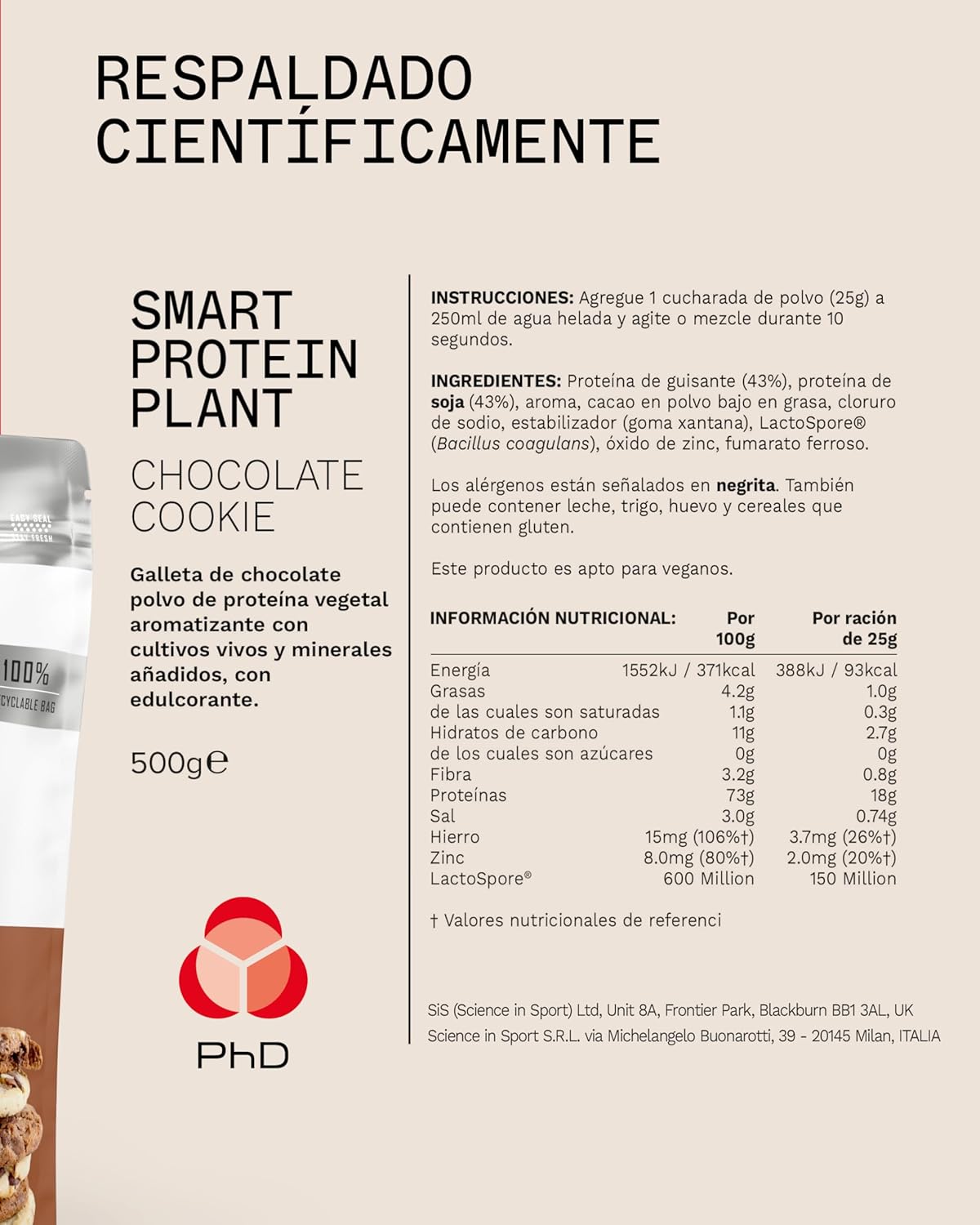 Smart Protein Plant is the best choice for those looking for a plant-based protein that adapts to a balanced diet, is versatile and also has a delicious taste. Each 25g serving contains 20g of plant protein and only 1g of sugar with barely 100 calories, which is ideal for controlling your macros and maintaining a healthy, controlled diet without unnecessary fats. You can prepare the protein by mixing it with water, you can beat it to prepare a delicious mousse, bake it or even prepare spectacular homemade desserts knowing that you are maintaining a low-calorie diet. Smart Protein Plant is available in three irresistible flavors: chocolate cookie, eton mess, and salted caramel. All of them with the guarantee and commitment to be approved by the Vegetarian Society as “vegan friendly”. PhD plant protein is made with pea protein, SOYA protein, reduced fat cocoa powder, flavoring, lactosporeTM (bacillus coagulans), iron oxide, zinc oxide, vitamin B6, folic acid, vitamin B12, sodium chloride, stabilizer (xanthan gum), sweetener (sucralose). May contain: MILK, WHEAT, egg and cereals containing GLUTEN.