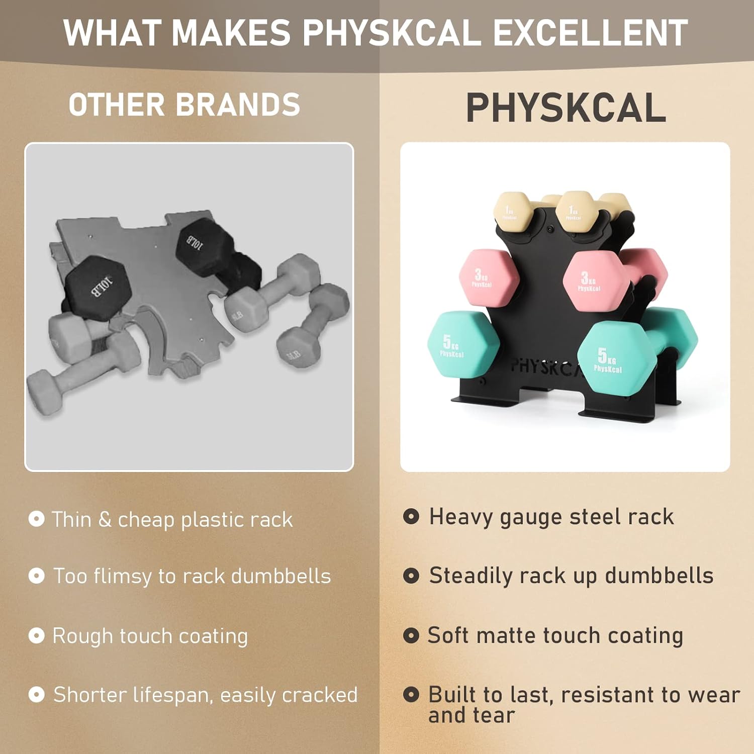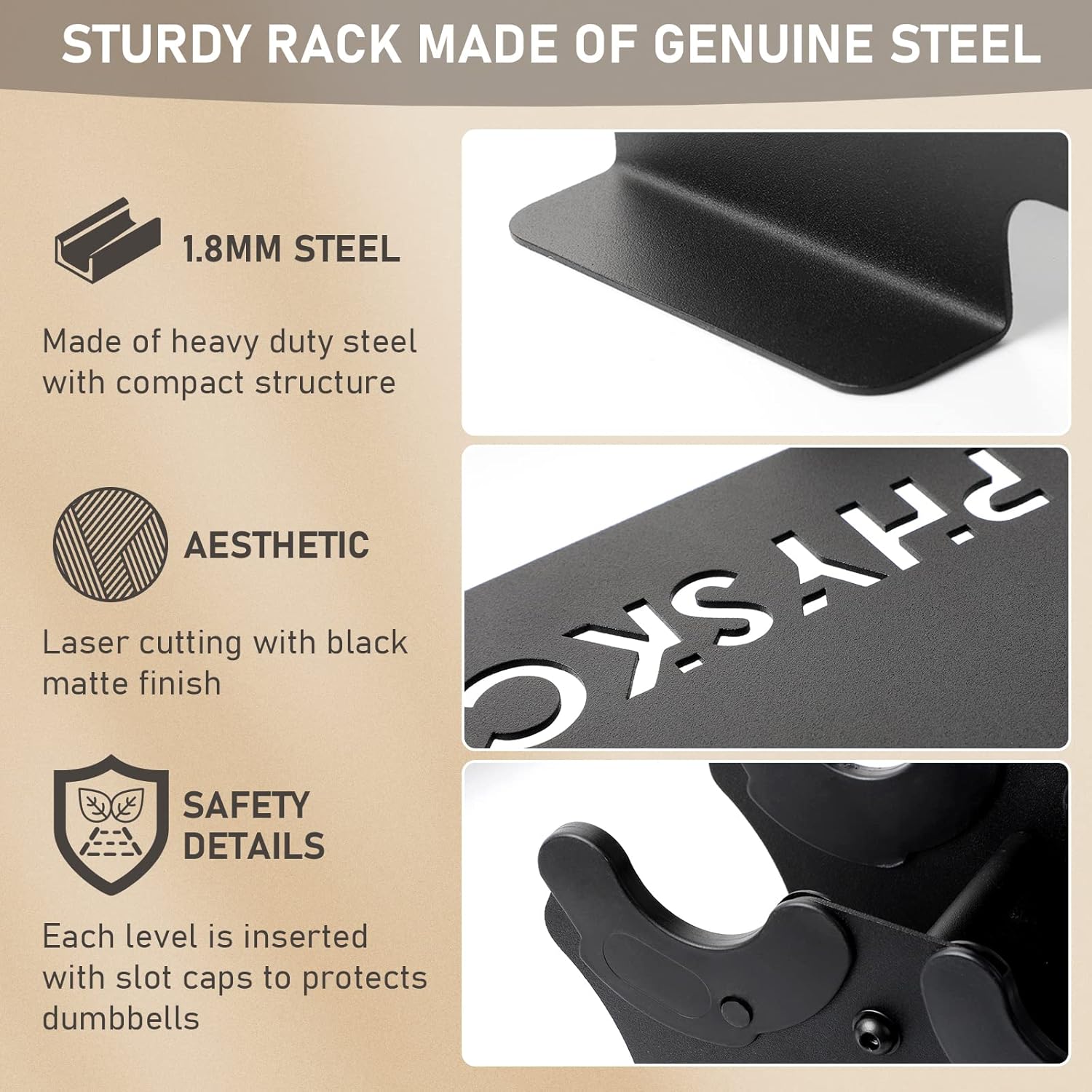 STURDY BRACKET MADE OF GENUINE STEEL – Unlike other regular dumbbell sets that come with a plastic stand or rack, this rack is made from commercial grade steel with a thickness of 1.8mm. The laser cut and matte black finish give the holder a sleek and concise look that fits your home.