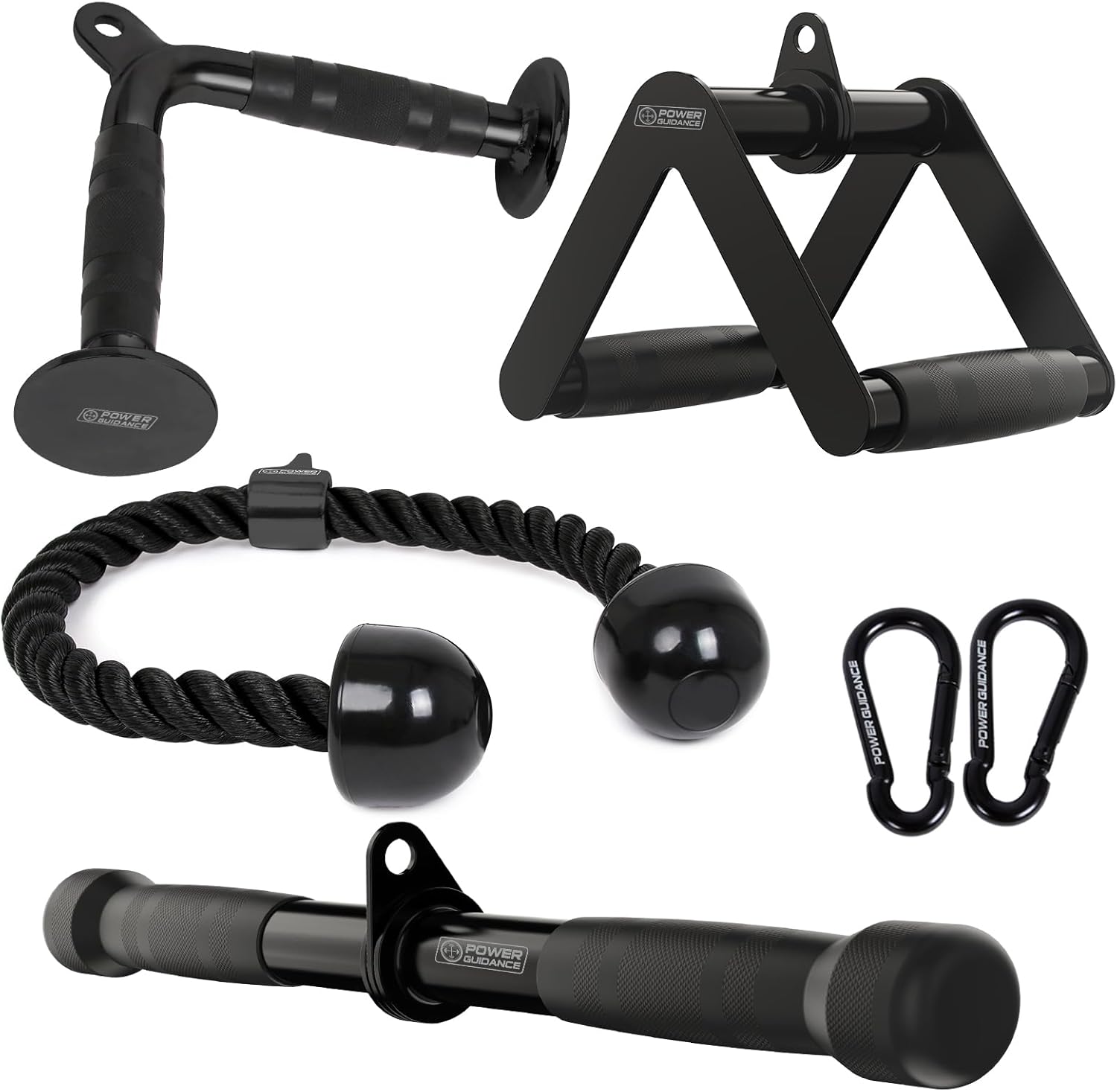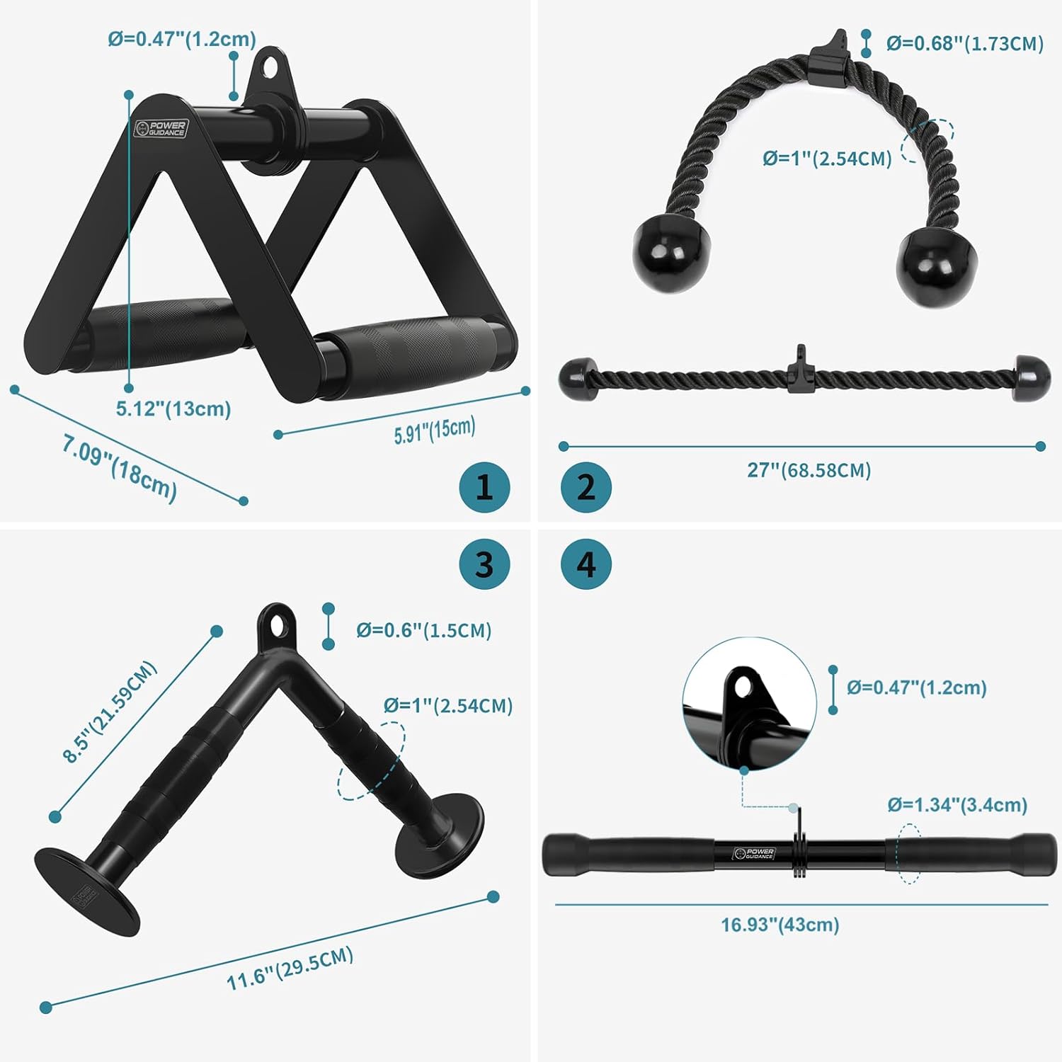 Package Includes:1 x V Shape Bar + 1 x Straight Swivel Bar + 1 x V Handle with Rotation + 1 x Nylon Braided Tricep Rope + 2 x Snap Hooks